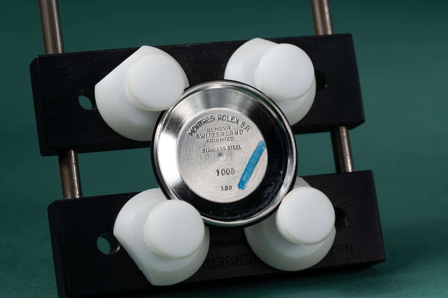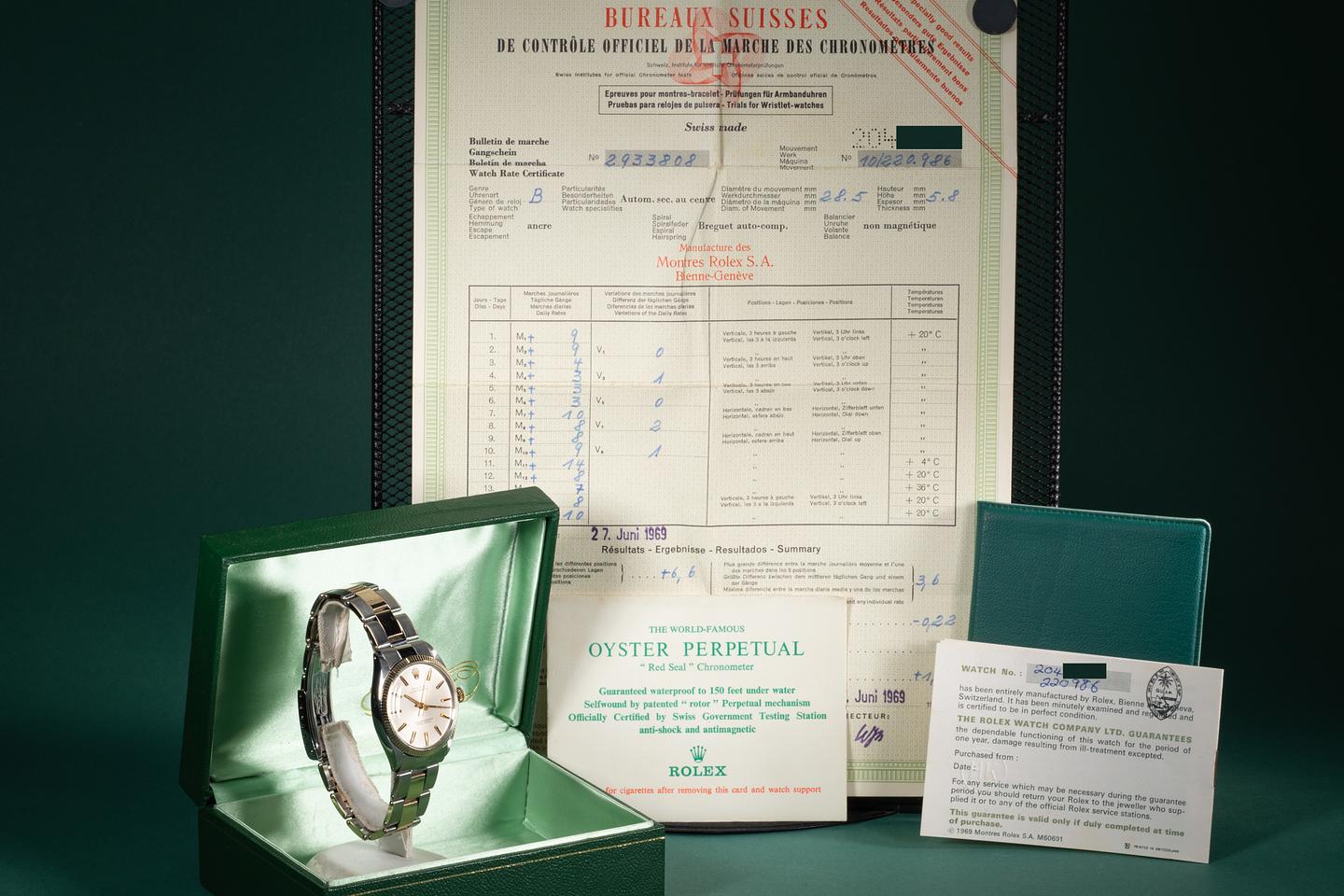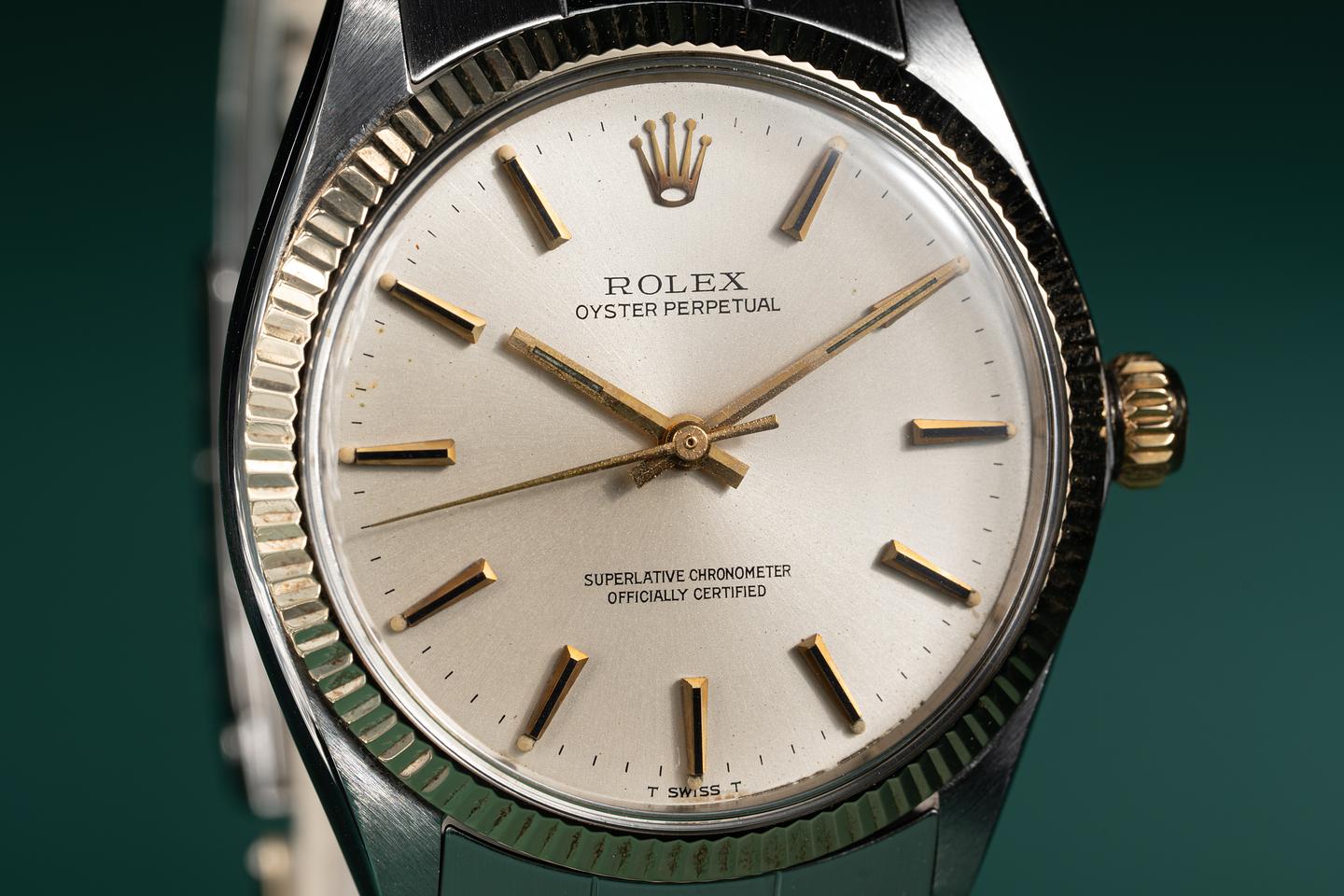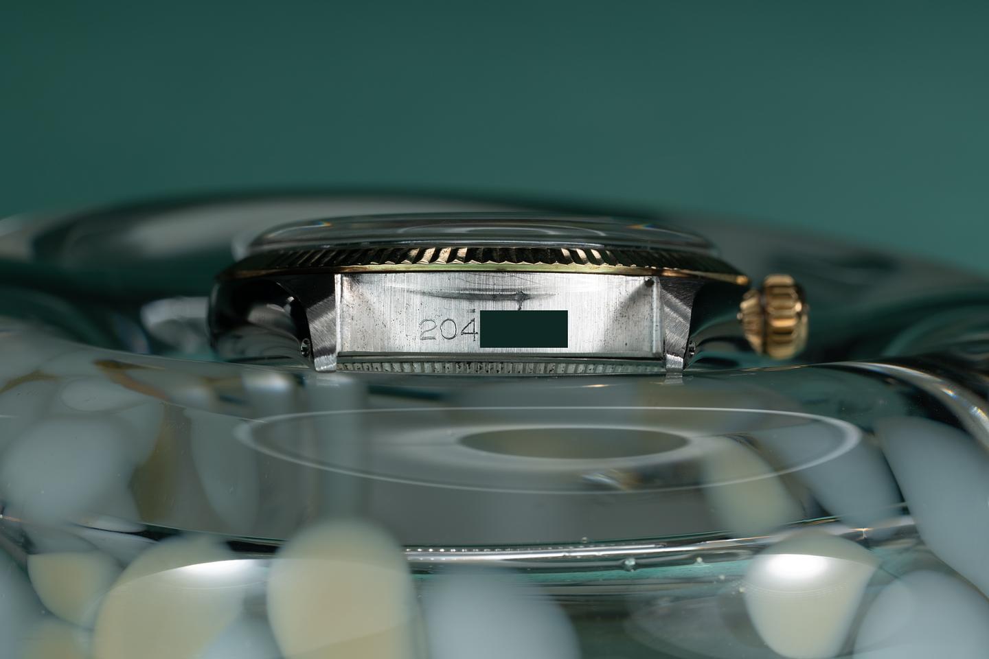 Bracelet: The 13 link 18k two-tone Oyster bracelet is excellent showing average stretch for its age. The clasp is stamped with a 1968 date code.