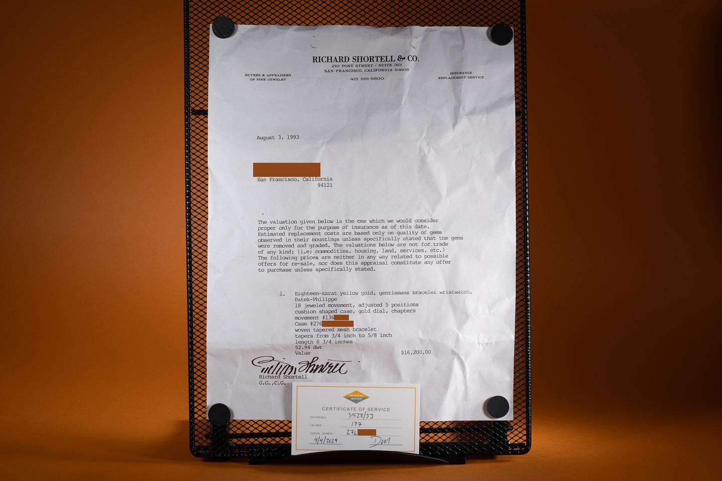 Accessories: Richard Shortell & Co. Appraisal and April 2024 Certificate of Service from Tropical Watch.