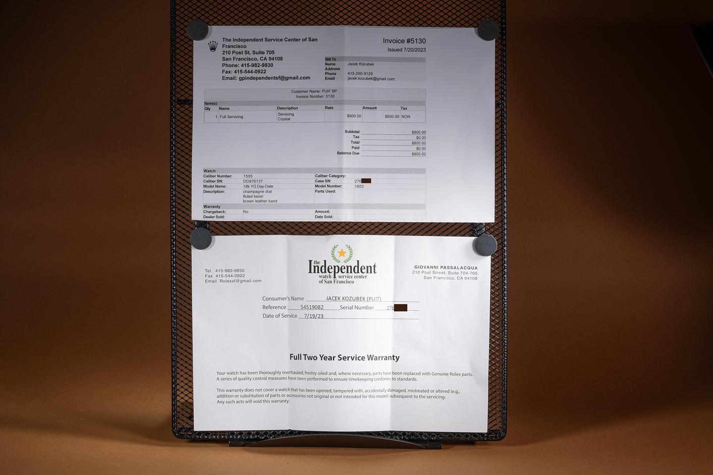 Accessories: Box, Papers & July 2023 Service Papers from The Independent Watch Service Center of SF.