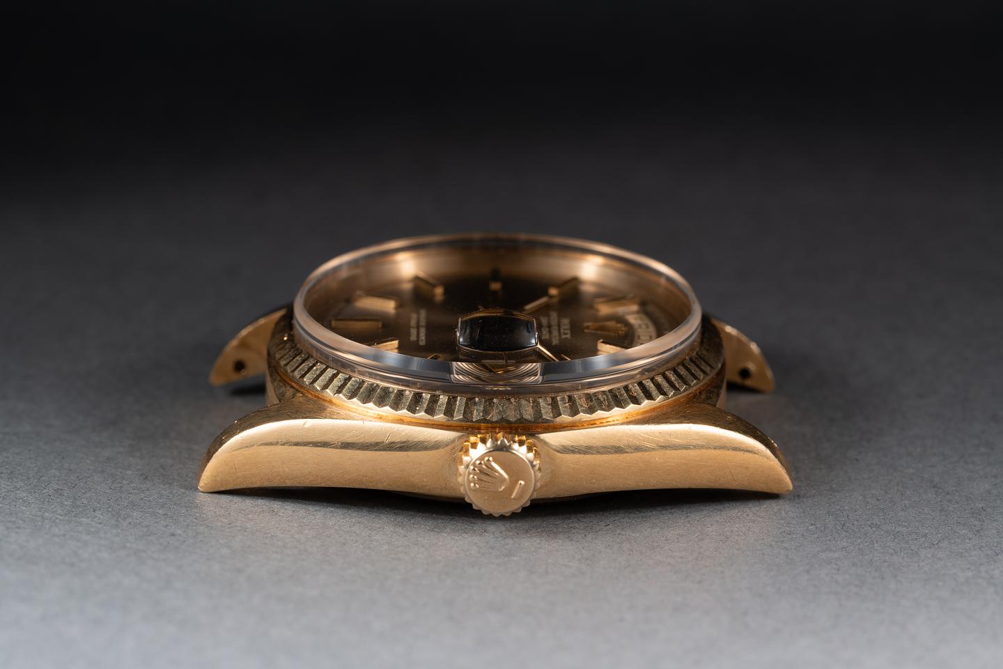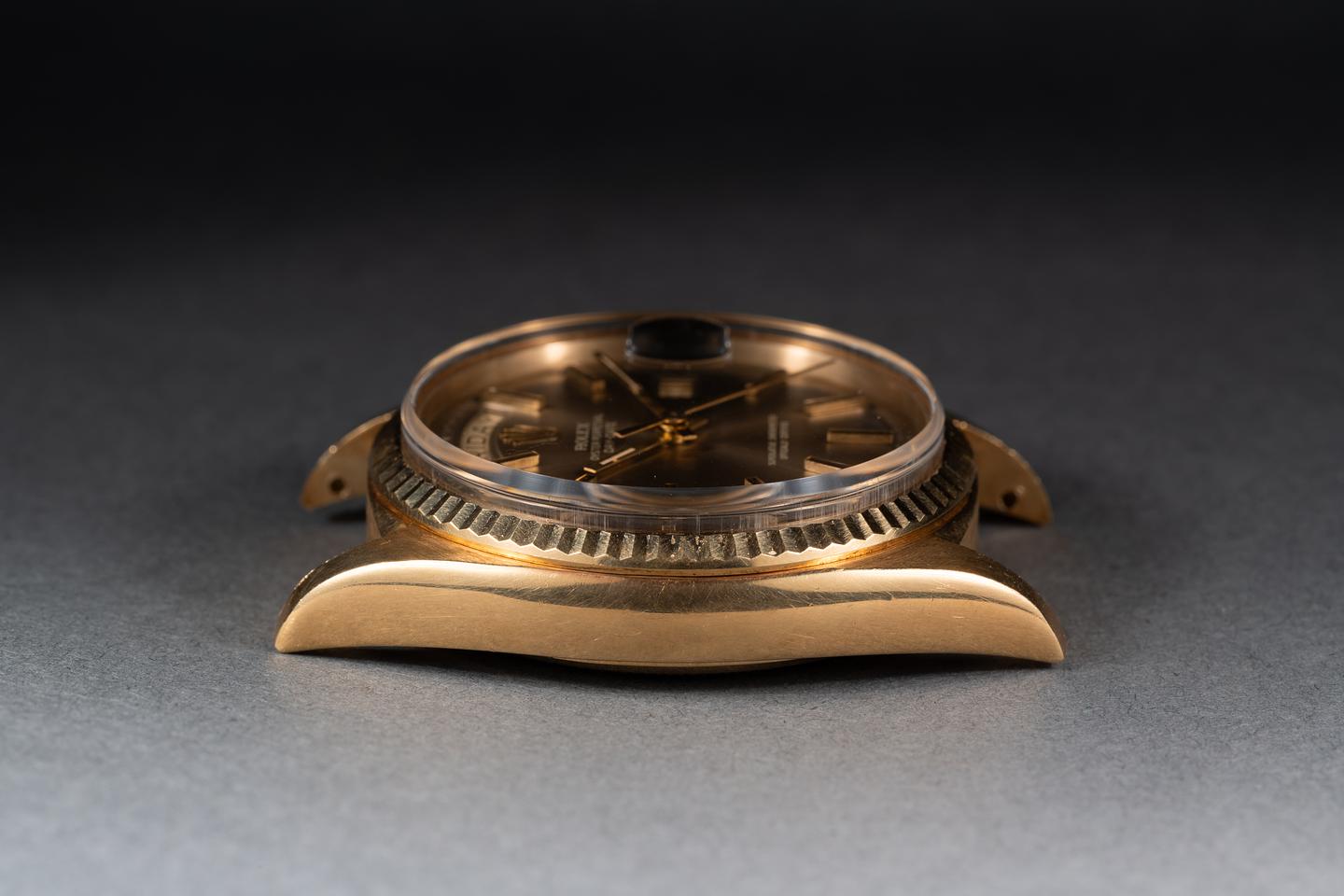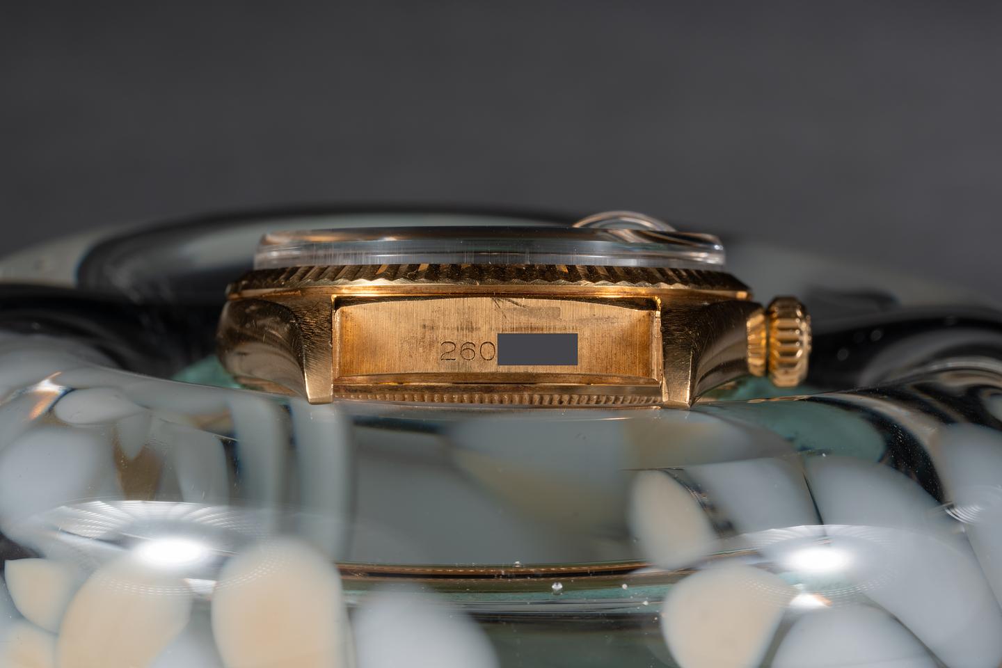 Case: The thick and even 18k yellow gold is excellent showing a bright sleeve polished finish. The sharp 18k yellow gold case is excellent showing only light wear from use.