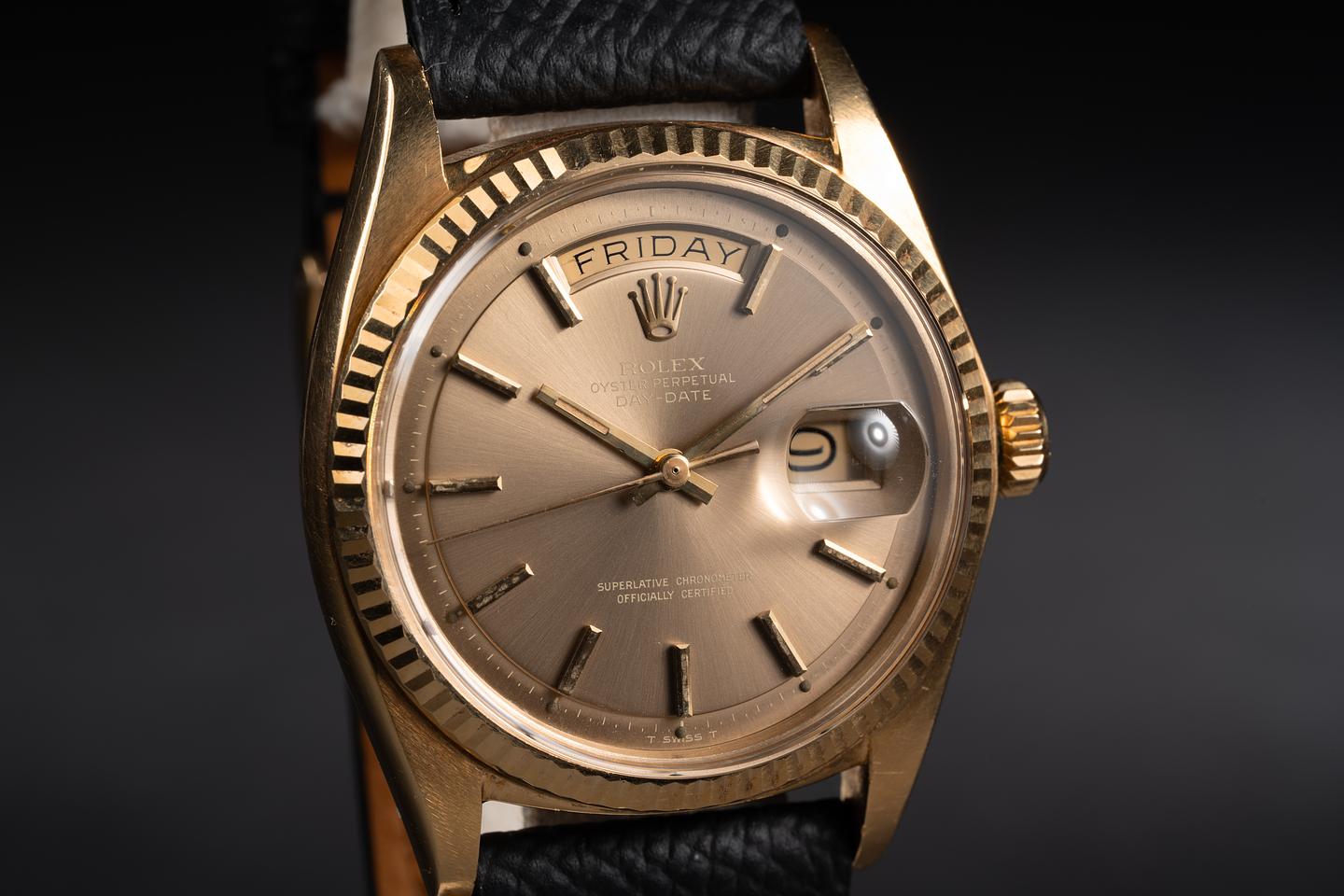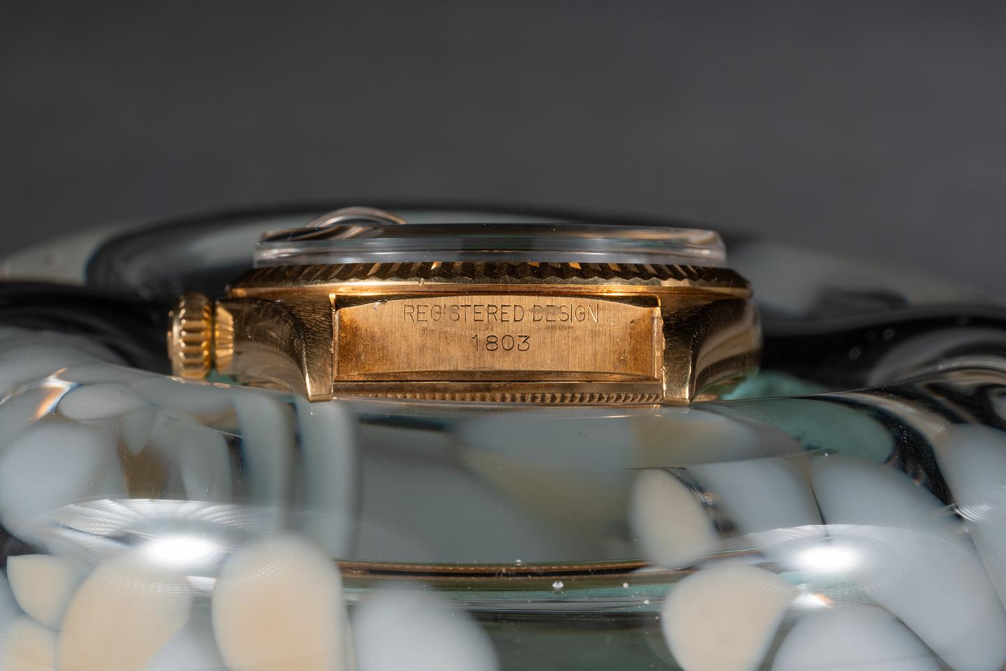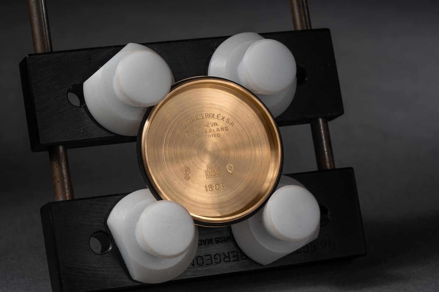 Case: The thick and even 18k yellow gold is excellent showing a bright sleeve polished finish. The sharp 18k yellow gold case is excellent showing only light wear from use.