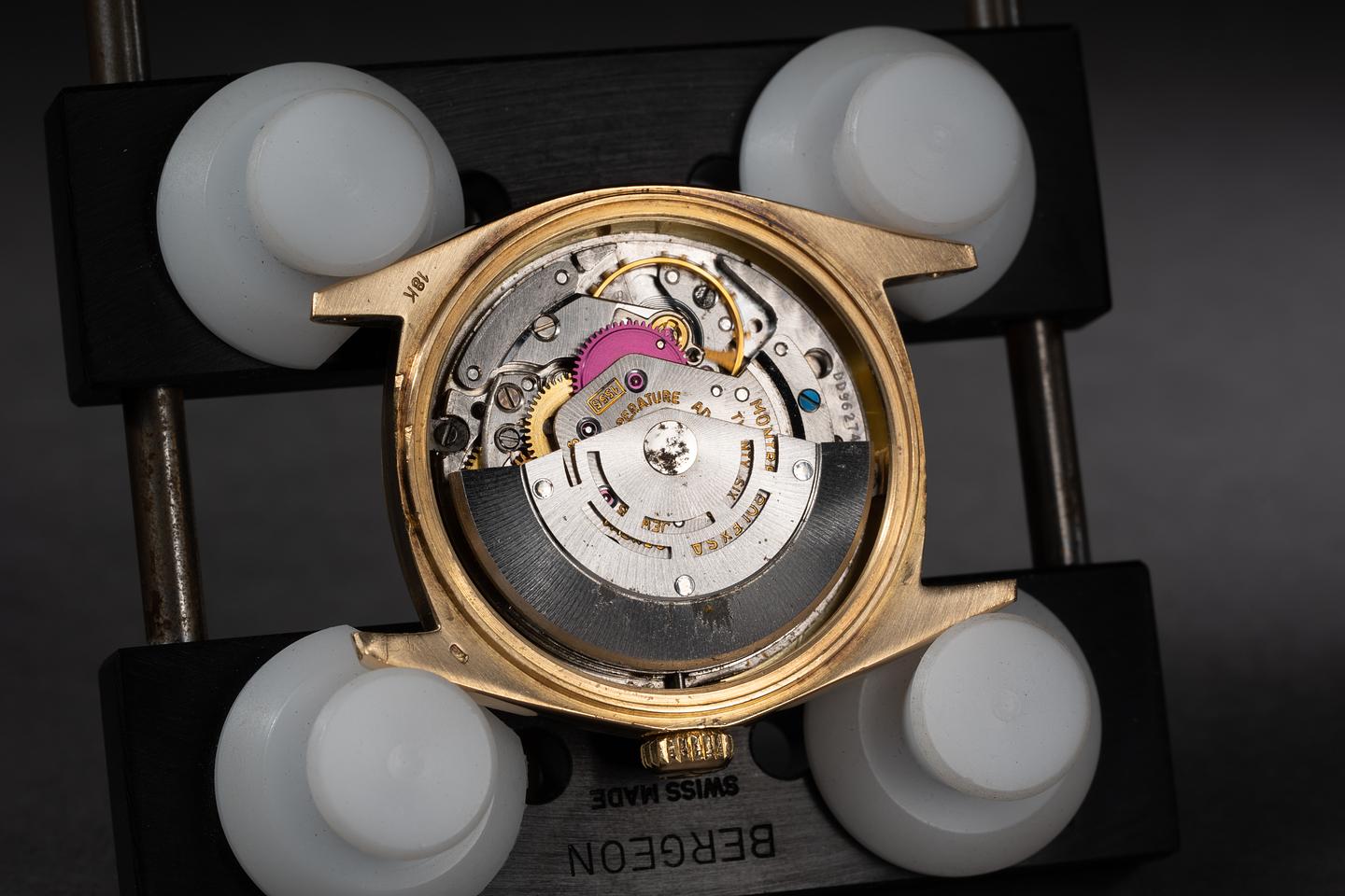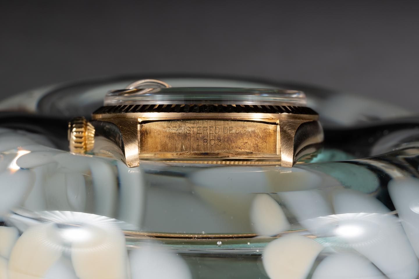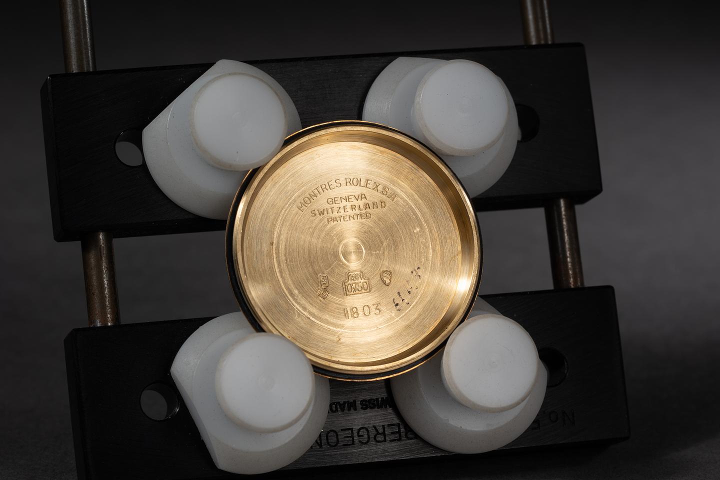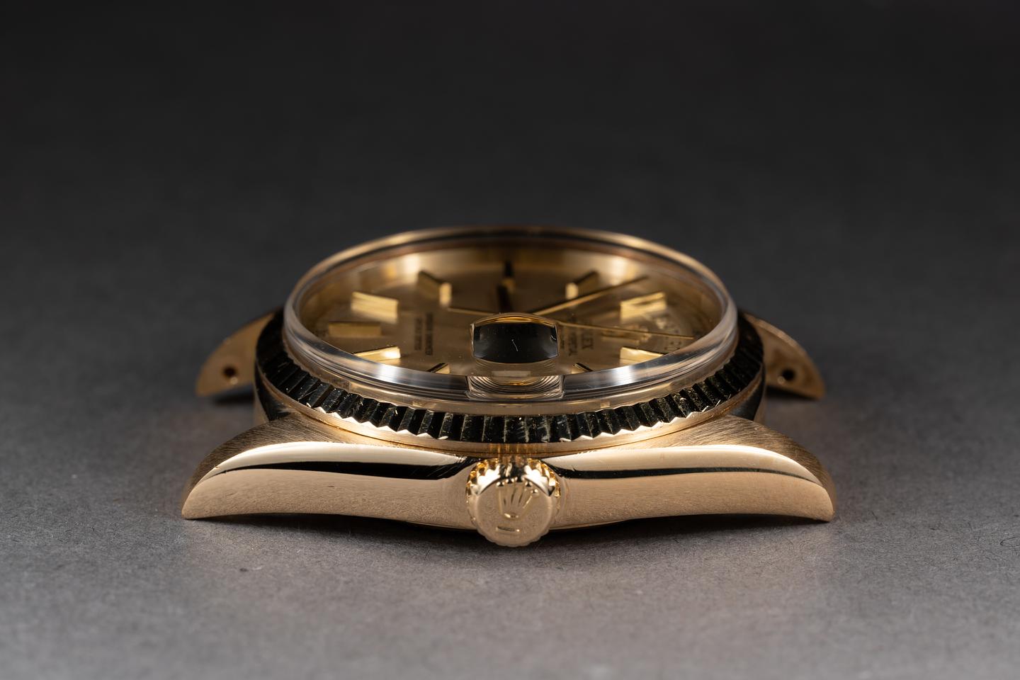 Case: The sharp 18k yellow gold case is excellent showing only very light wear fro use. The sharp 18k yellow gold fluted bezel is also in excellent condition showing only light wear from use.