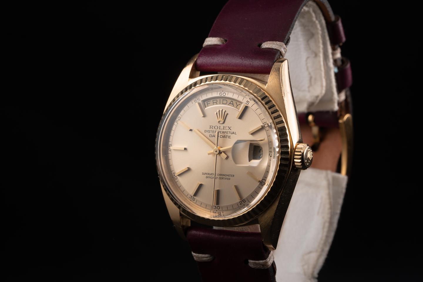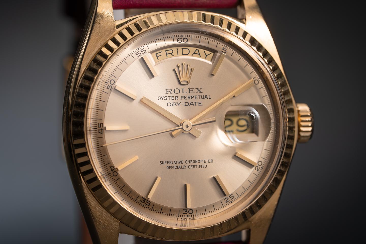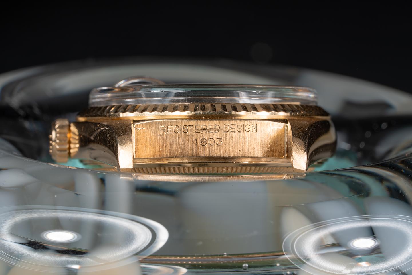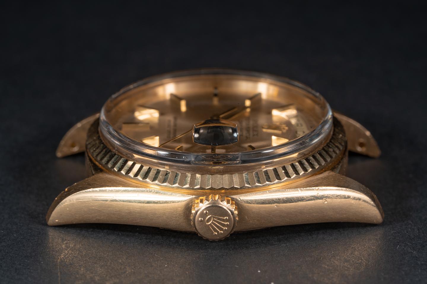 Case: The thick and even 18k yellow gold case is excellent showing only light wear from use. The 18k yellow gold fluted bezel is also in excellent condition showing only light wear from use.