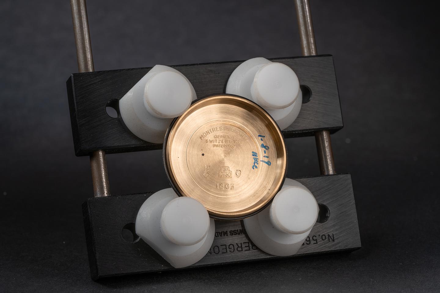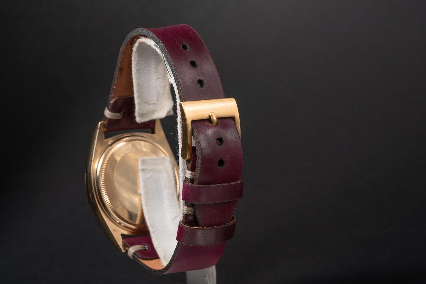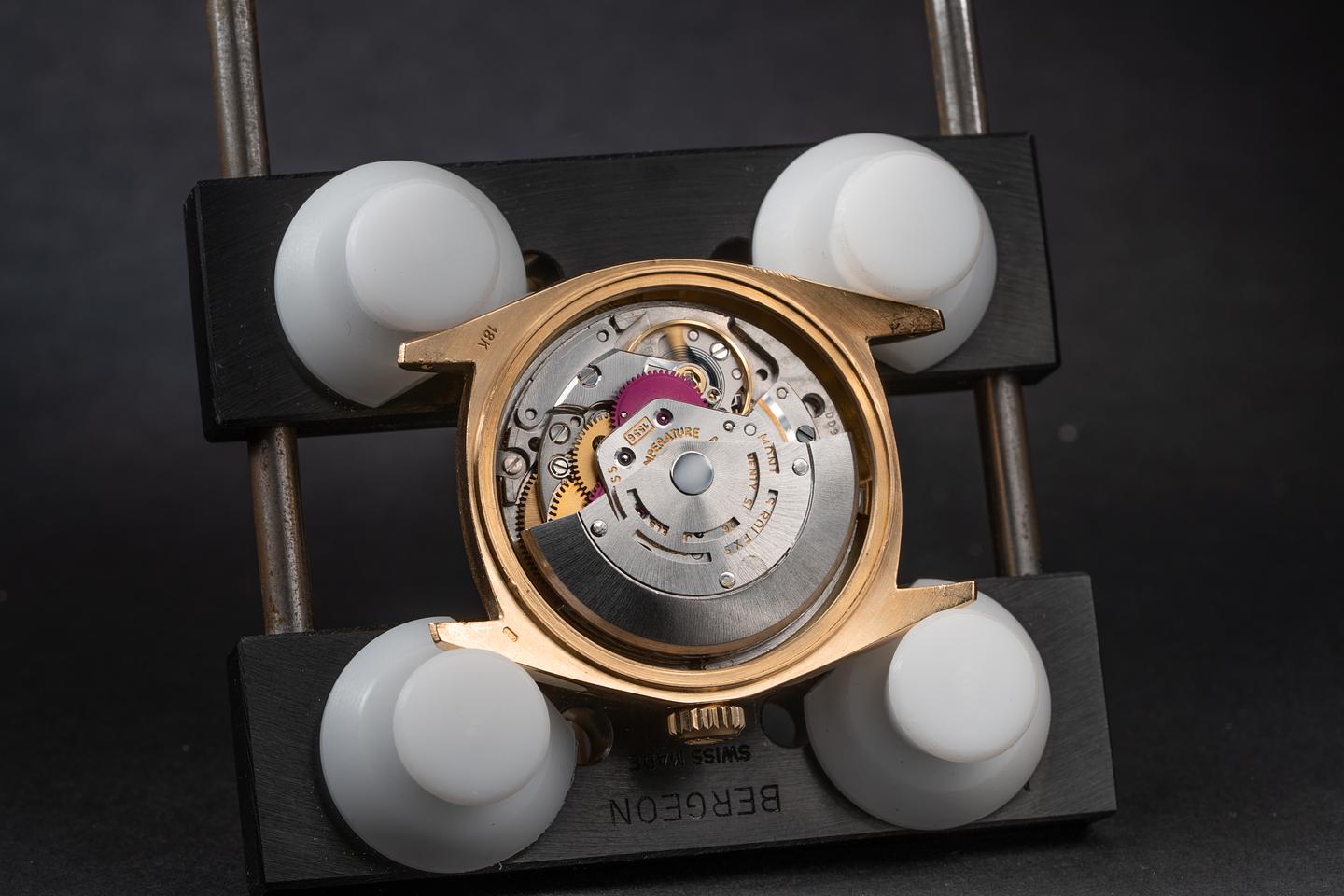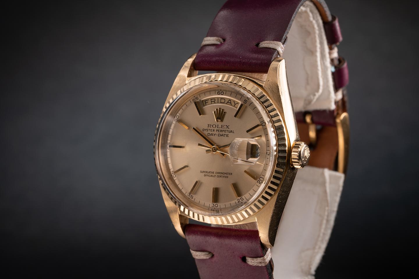 Case: The thick and even 18k yellow gold case is excellent showing only light wear from use. The 18k yellow gold fluted bezel is also in excellent condition showing only light wear from use.