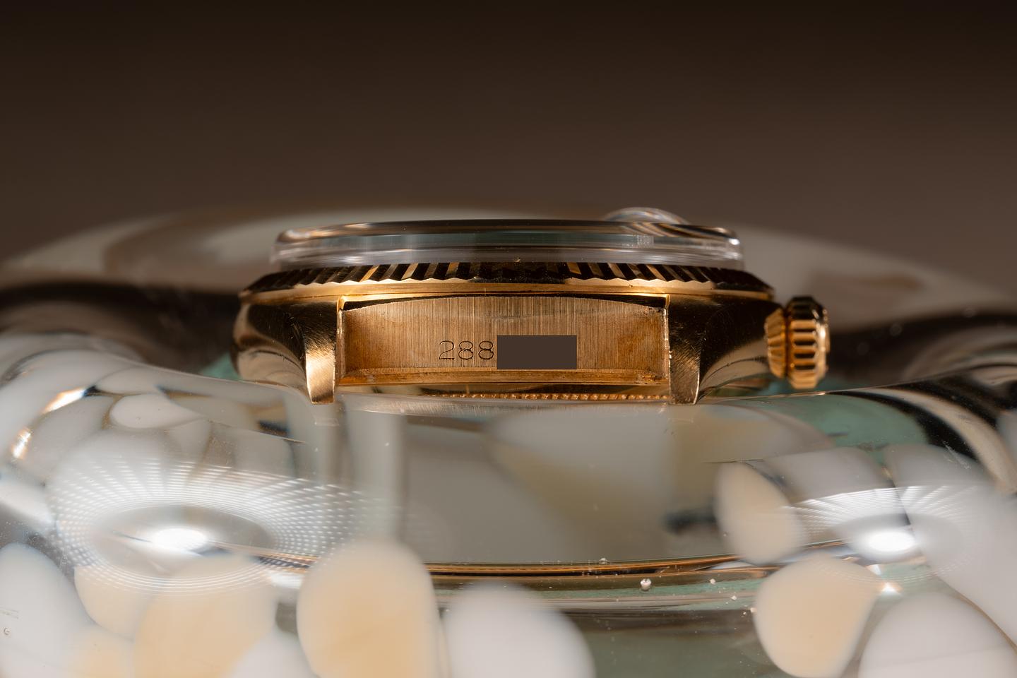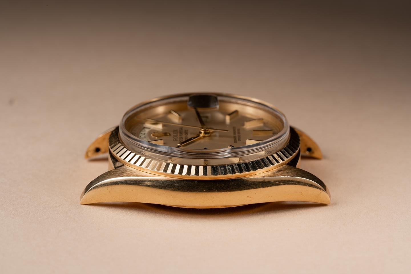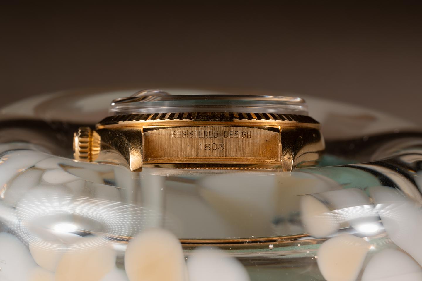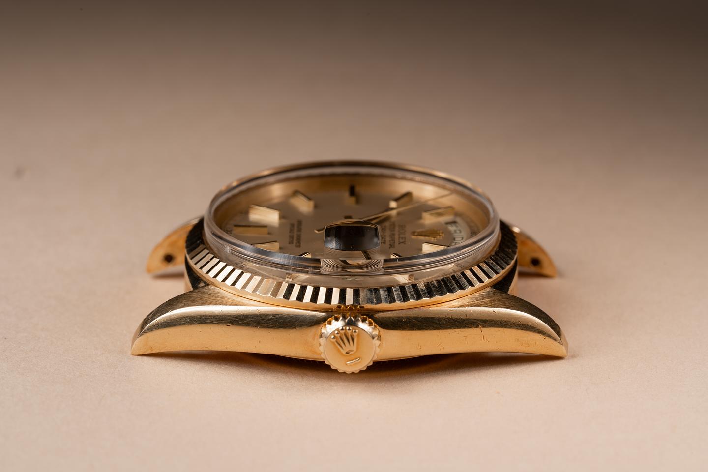 Case: The thick and even 18k yellow gold case is excellent showing some light wear from use. The sharp 18k yellow gold fluted bezel is also in excellent condition showing only light wear from use.