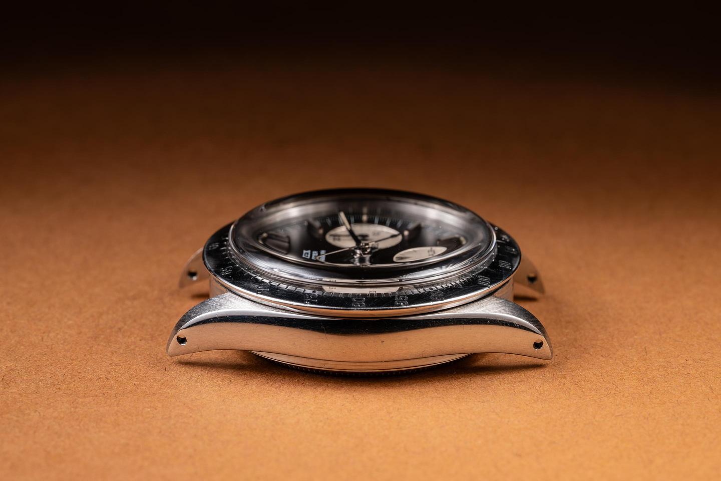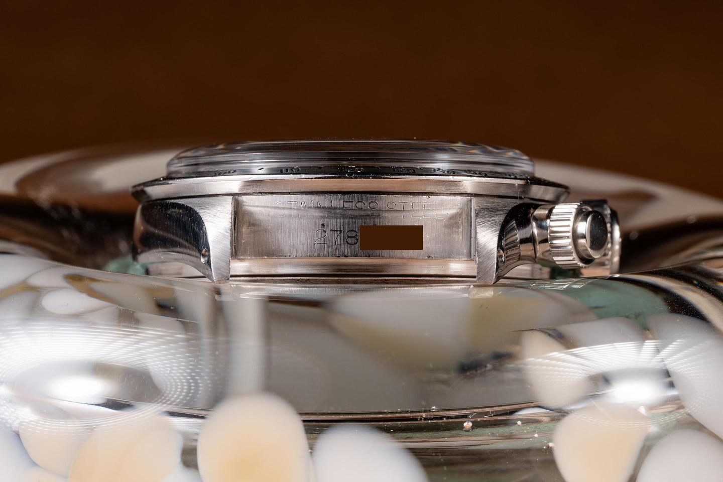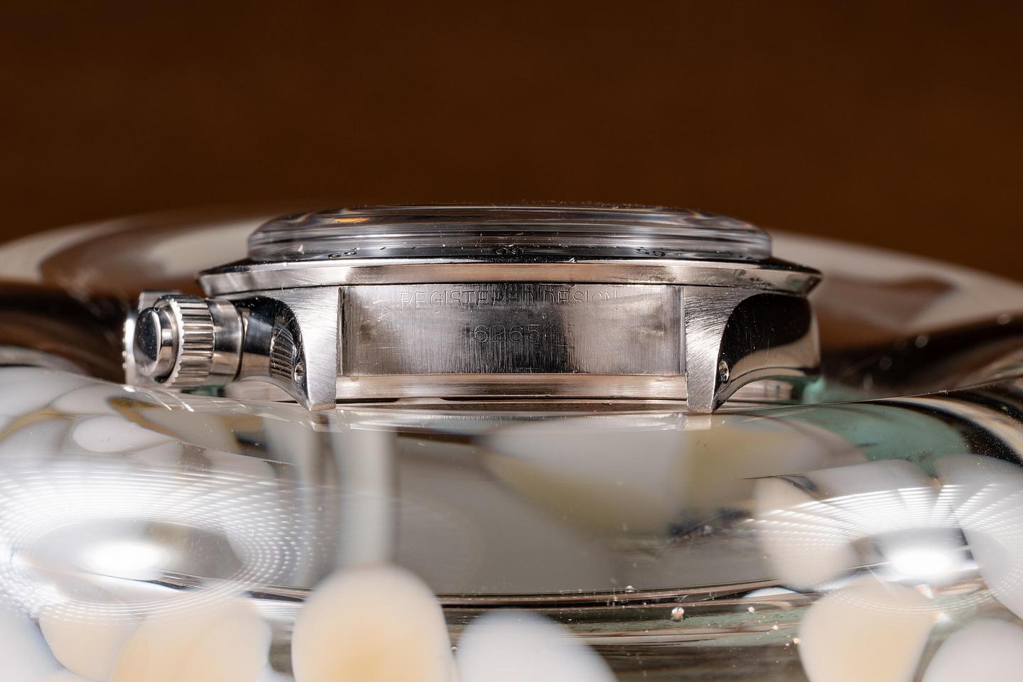 Case: The sharp, previously polished case is excellent, showing only light wear from use. The stainless bezel is also in excellent condition, showing only light wear from use. The watch comes with rarely seen Mark 0 pushers.
