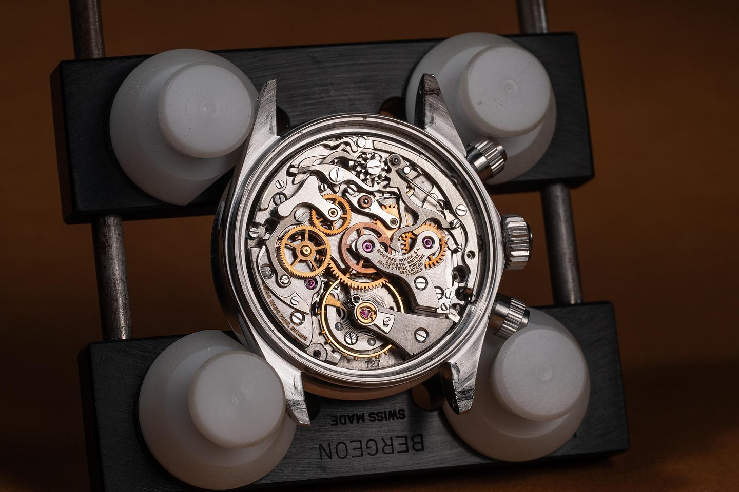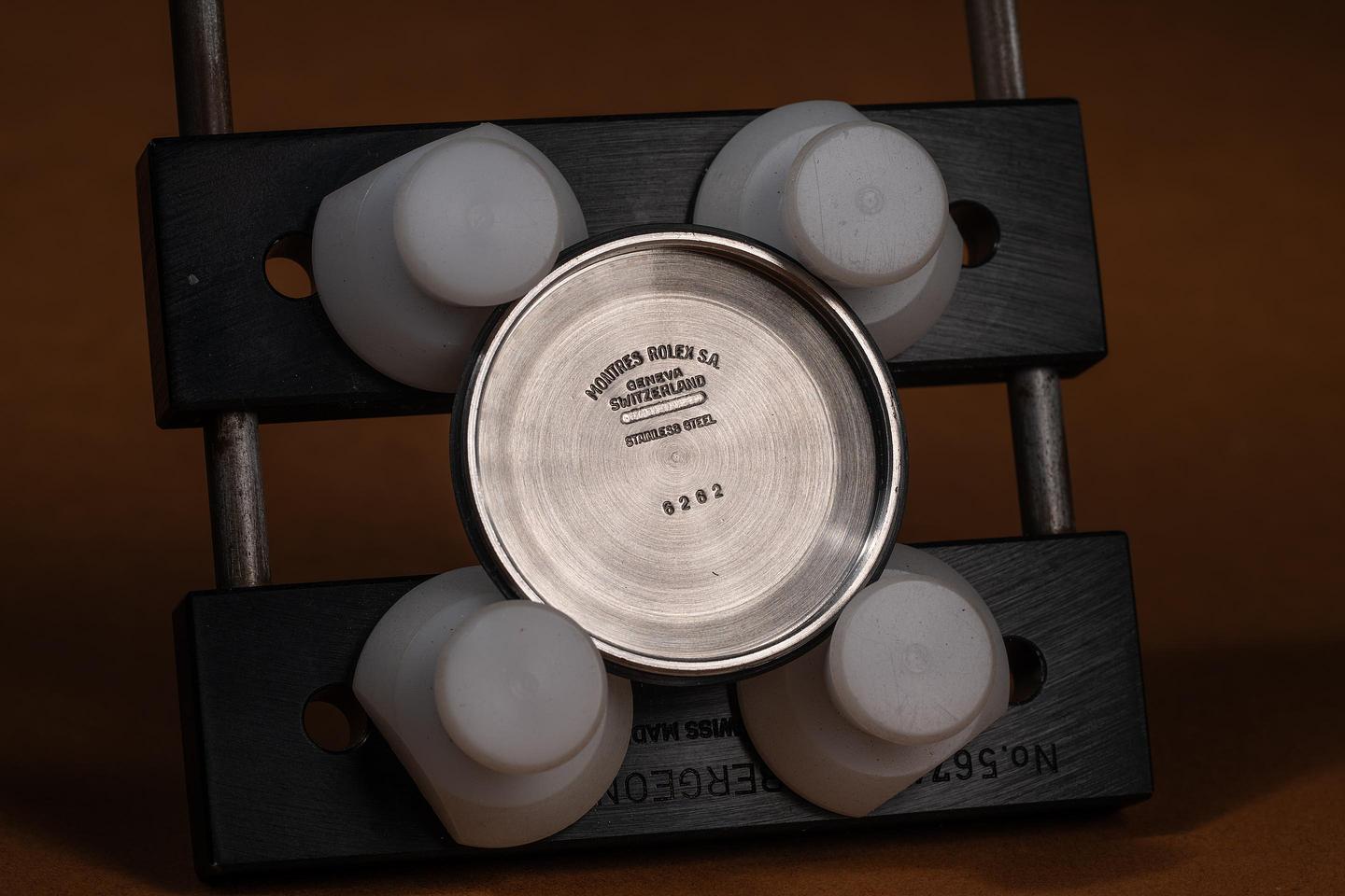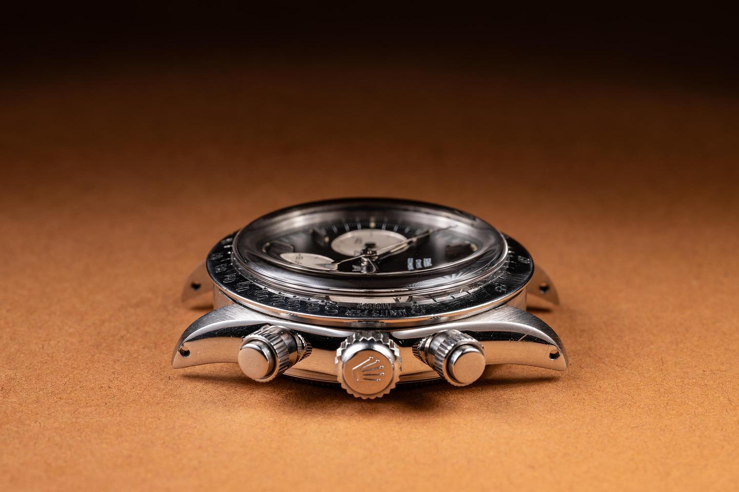 Case: The sharp, previously polished case is excellent, showing only light wear from use. The stainless bezel is also in excellent condition, showing only light wear from use. The watch comes with rarely seen Mark 0 pushers.