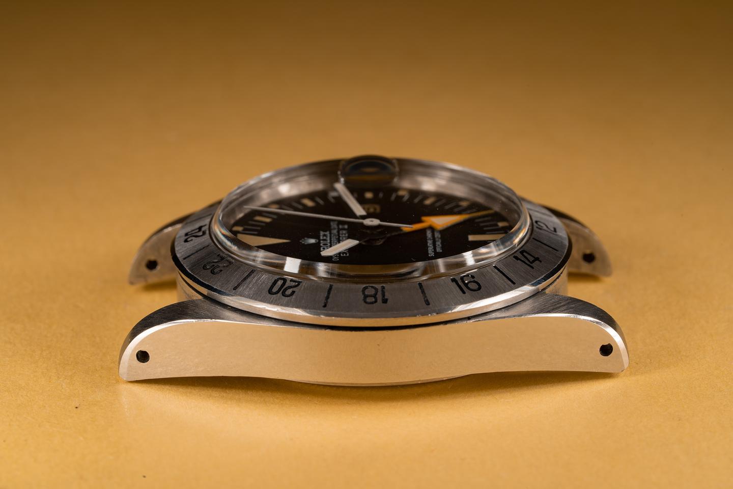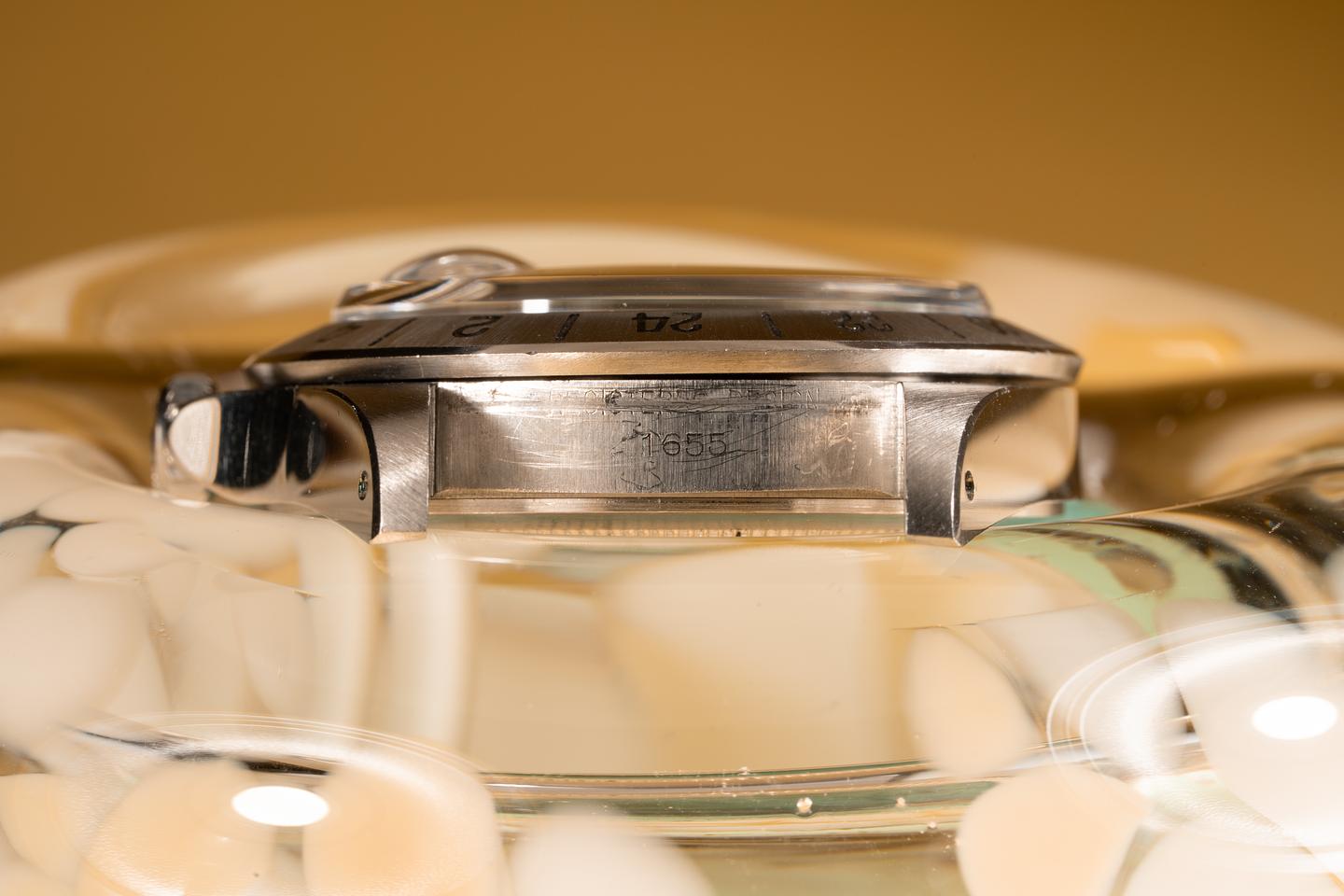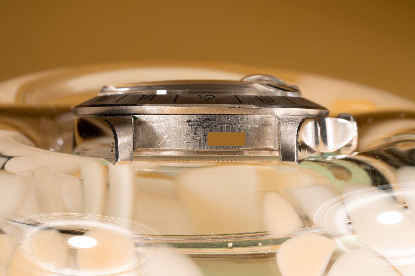 Case: The previously polished case is excellent showing sharp prominent bevels and some light wear from use. The bezel insert is also in excellent condition and shows a sharp and well-defined sunburst pattern.