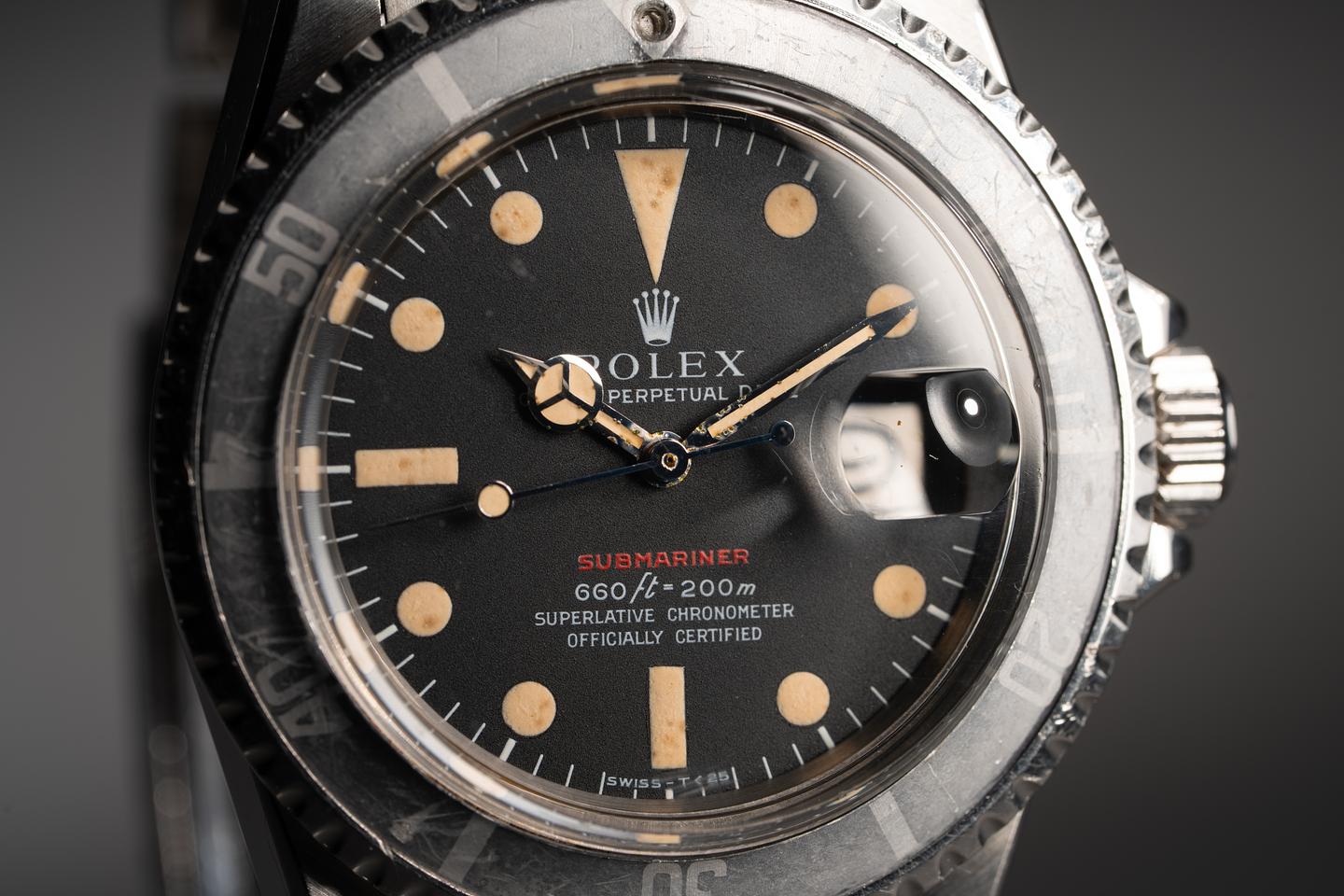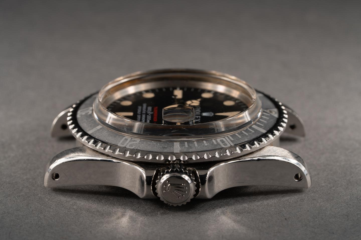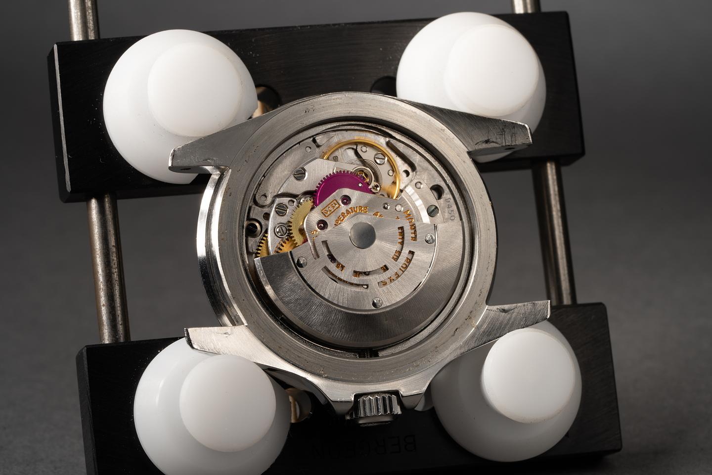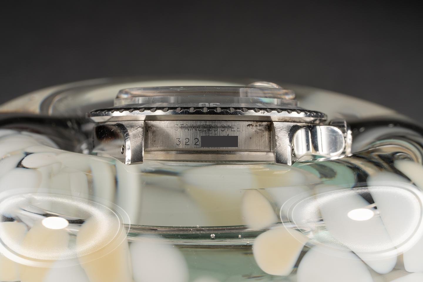 Case: The previously polished case is excellent showing wide prominent bevels and only light wear for its age. The bezel insert has faded to a light silvery grey and shows only light wear for its age.