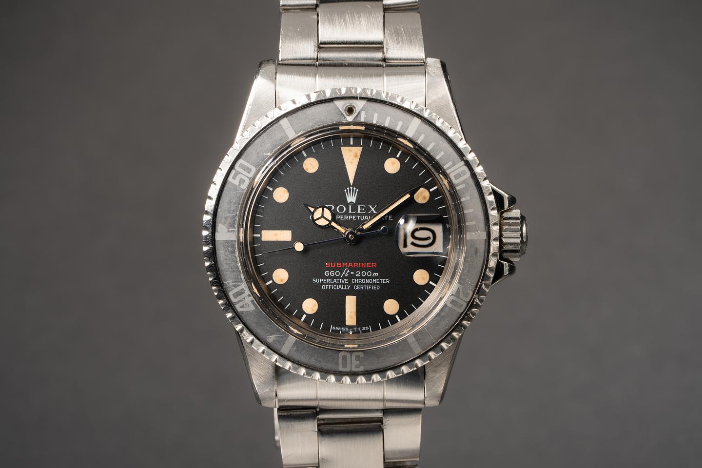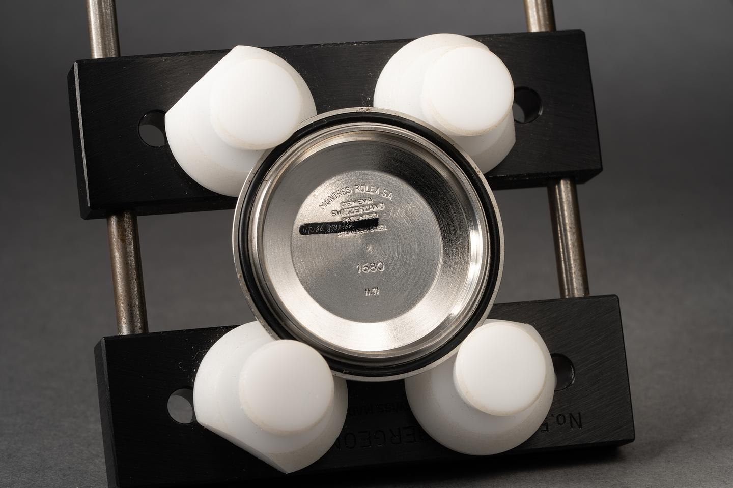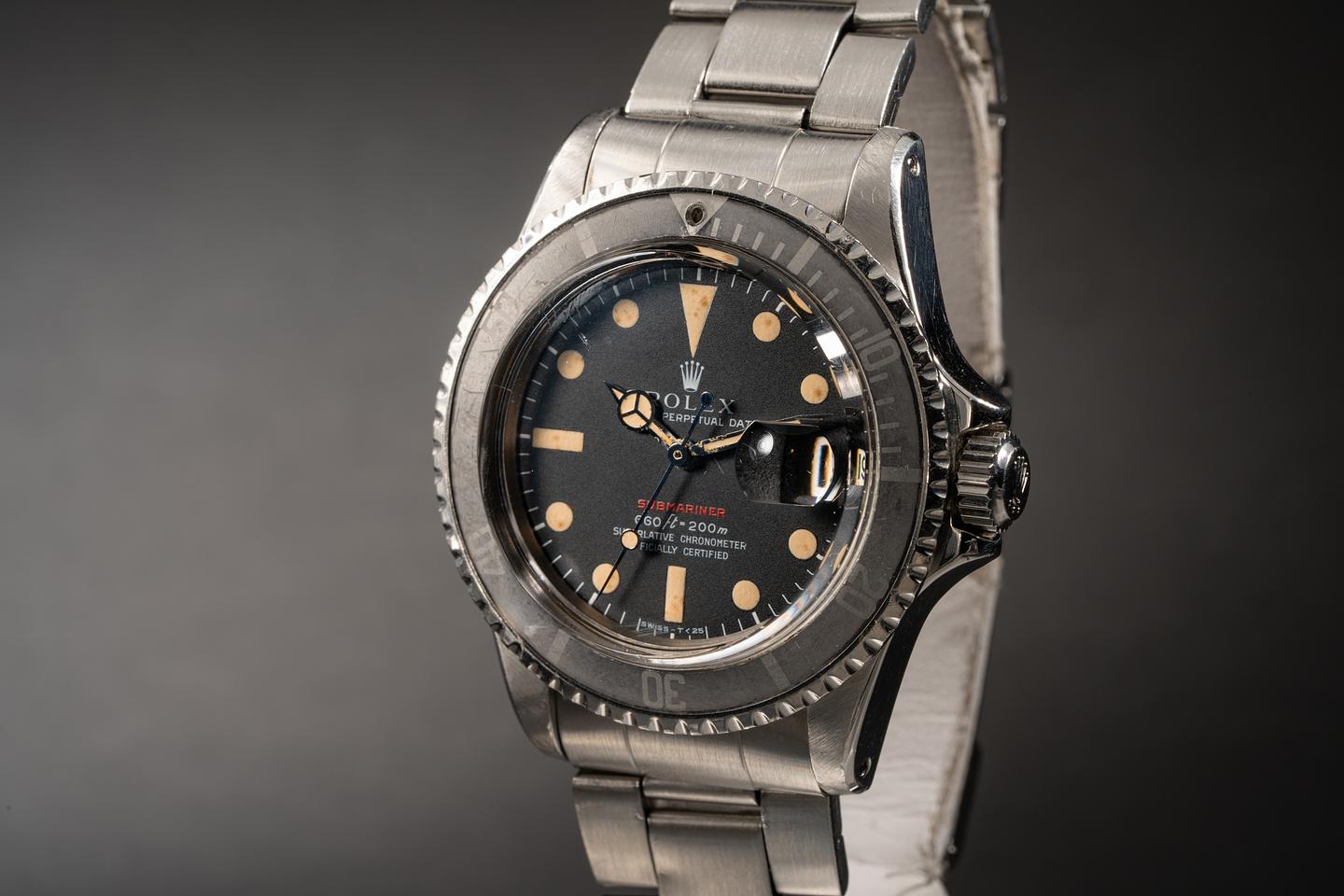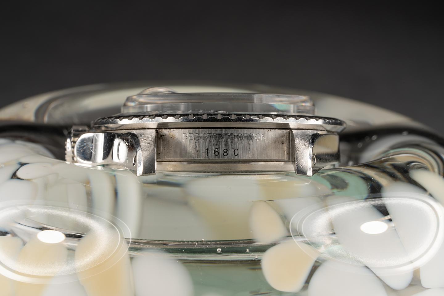 Case: The previously polished case is excellent showing wide prominent bevels and only light wear for its age. The bezel insert has faded to a light silvery grey and shows only light wear for its age.