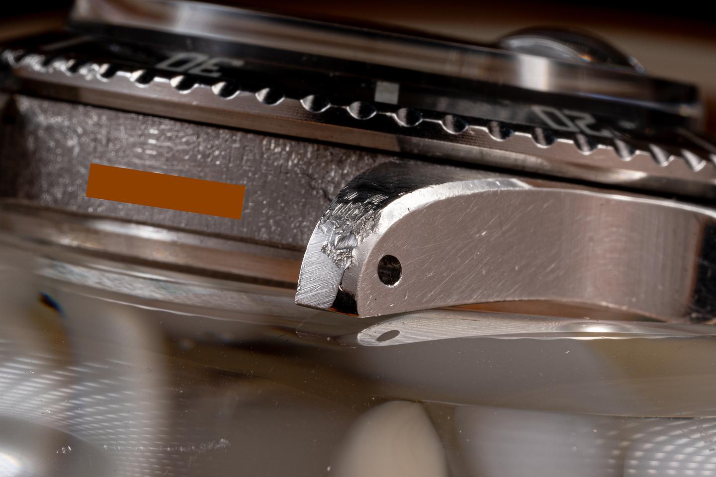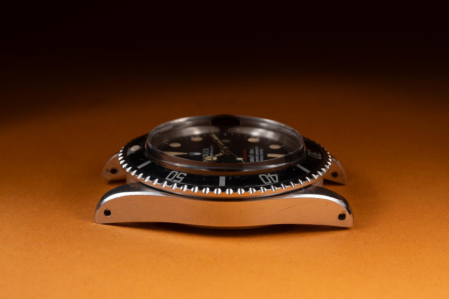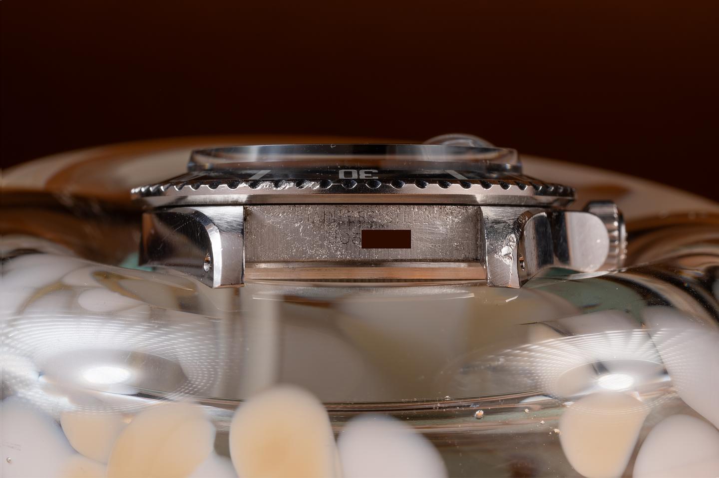 Case: The thick and even unpolished case shows wide, sharp, prominent bevels. The watch shows overall only light wear from use. However there is some heavier wear on the 5 o'clock lug. The black bezel insert is in excellent condition showing some light wear from use.