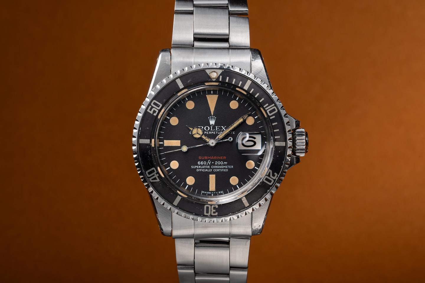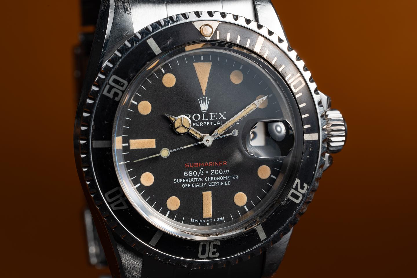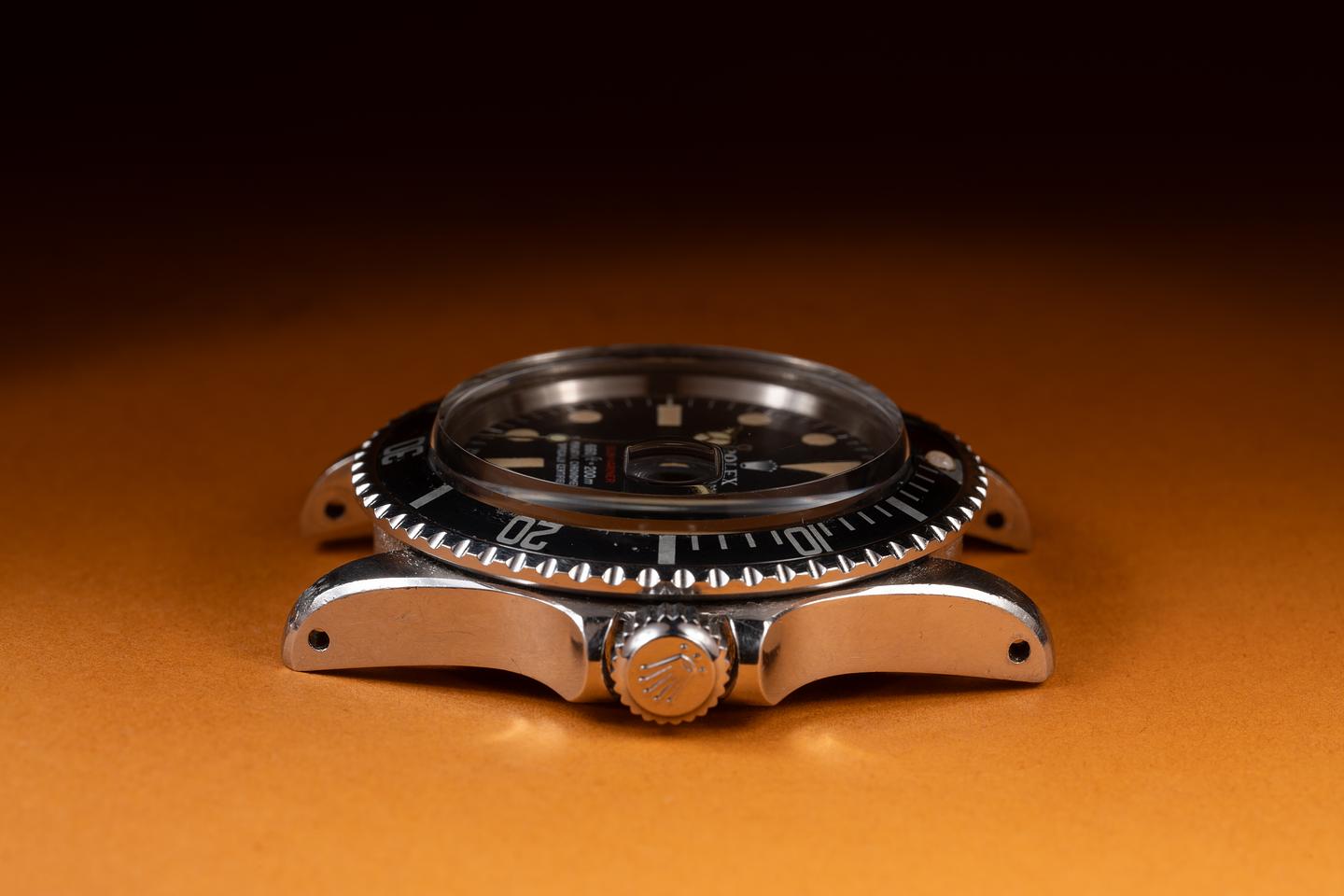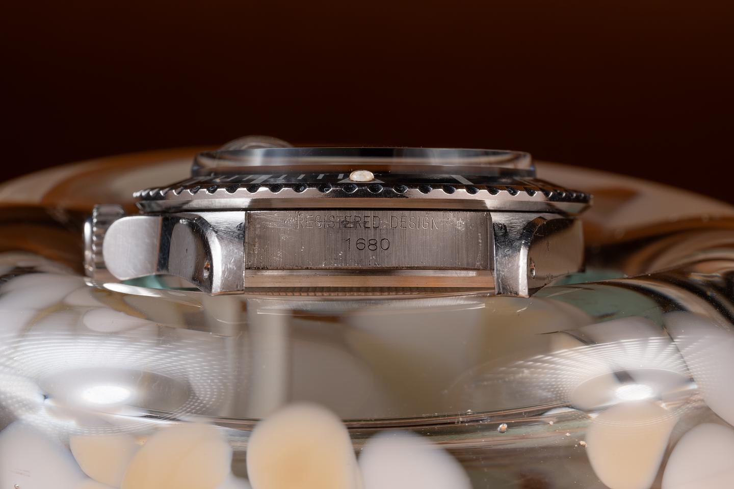 Case: The thick and even unpolished case shows wide, sharp, prominent bevels. The watch shows overall only light wear from use. However there is some heavier wear on the 5 o'clock lug. The black bezel insert is in excellent condition showing some light wear from use.