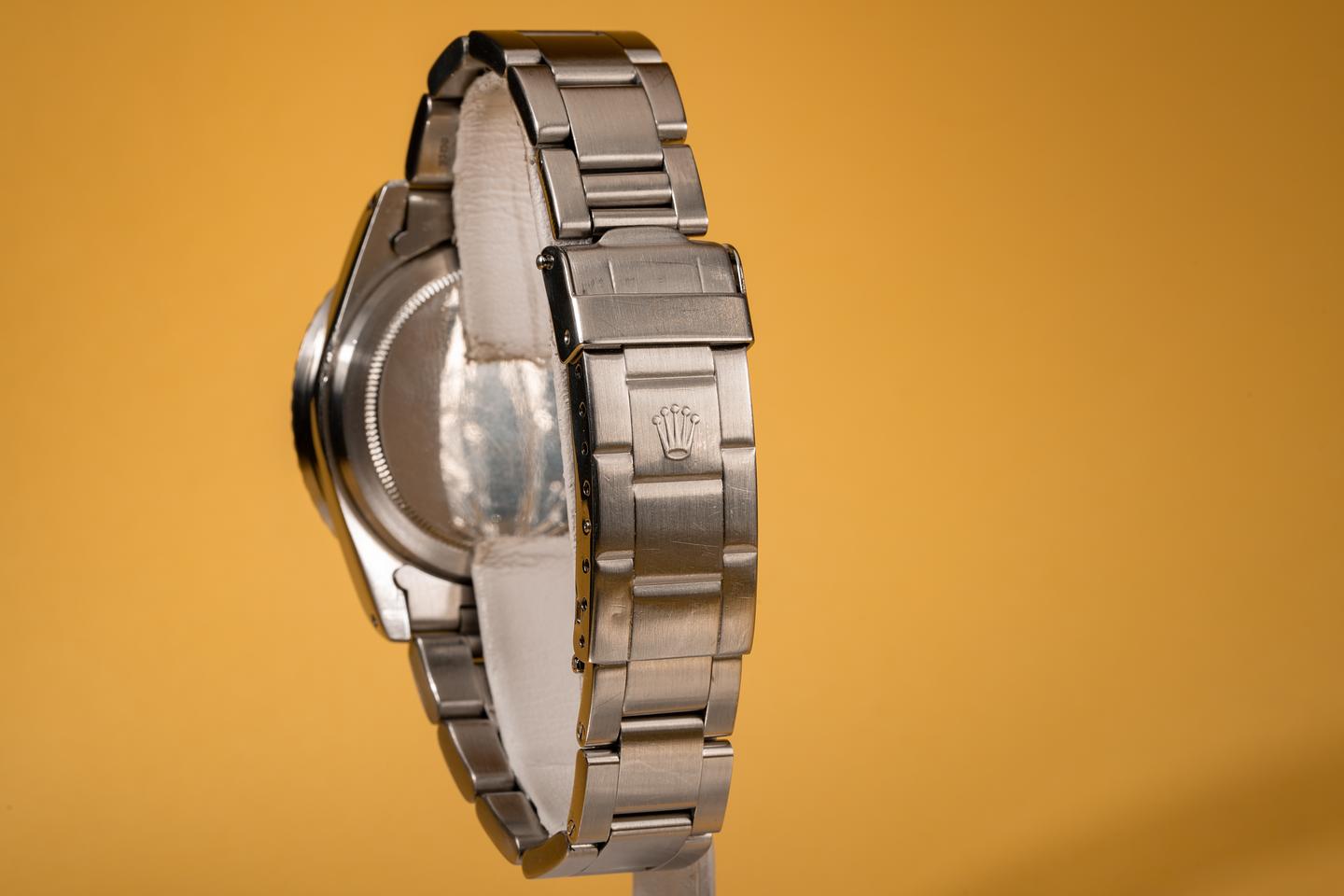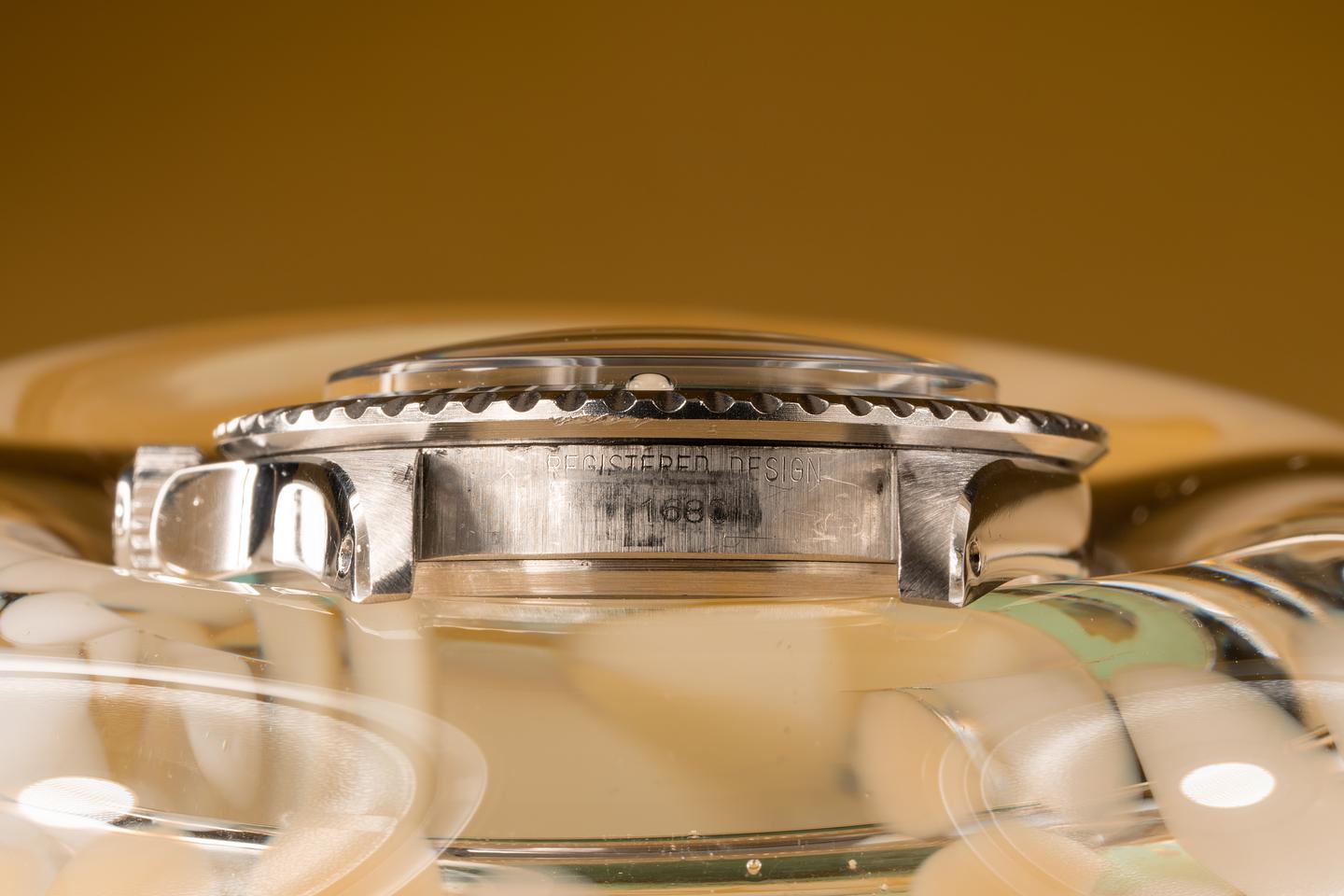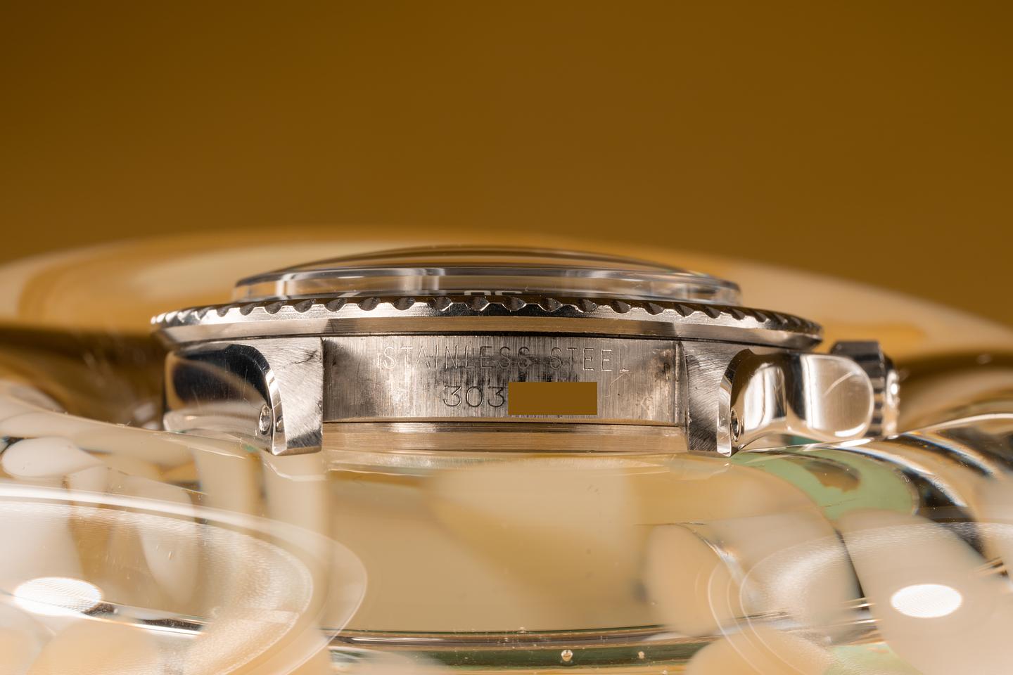 Case: The recently polished case is excellent showing wide prominent bevels and only very light wear. The black bezel insert is also in excellent condition and shows only very light wear. The watch is fitted with a domed "Non-cyclopes" Rolex crystal.