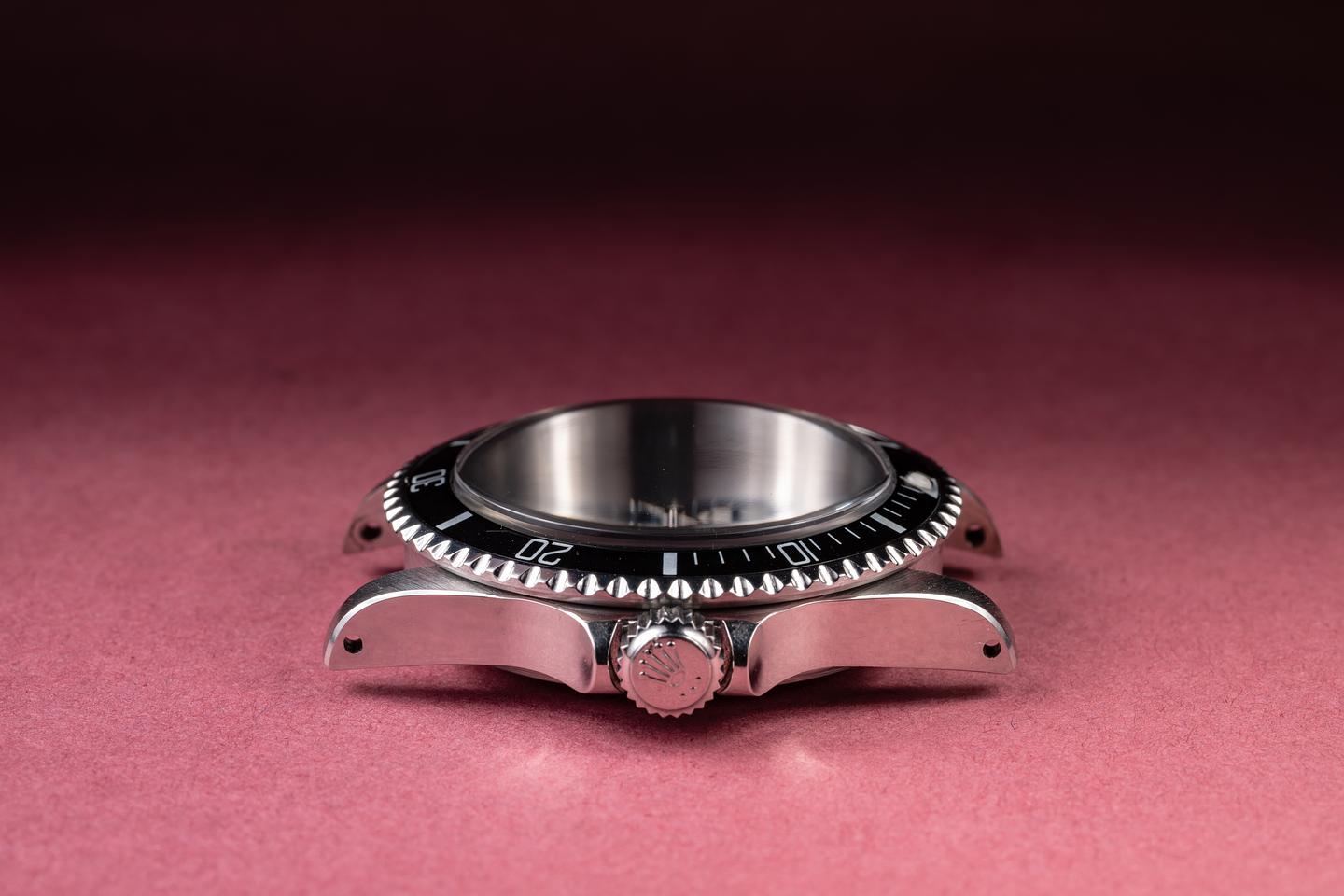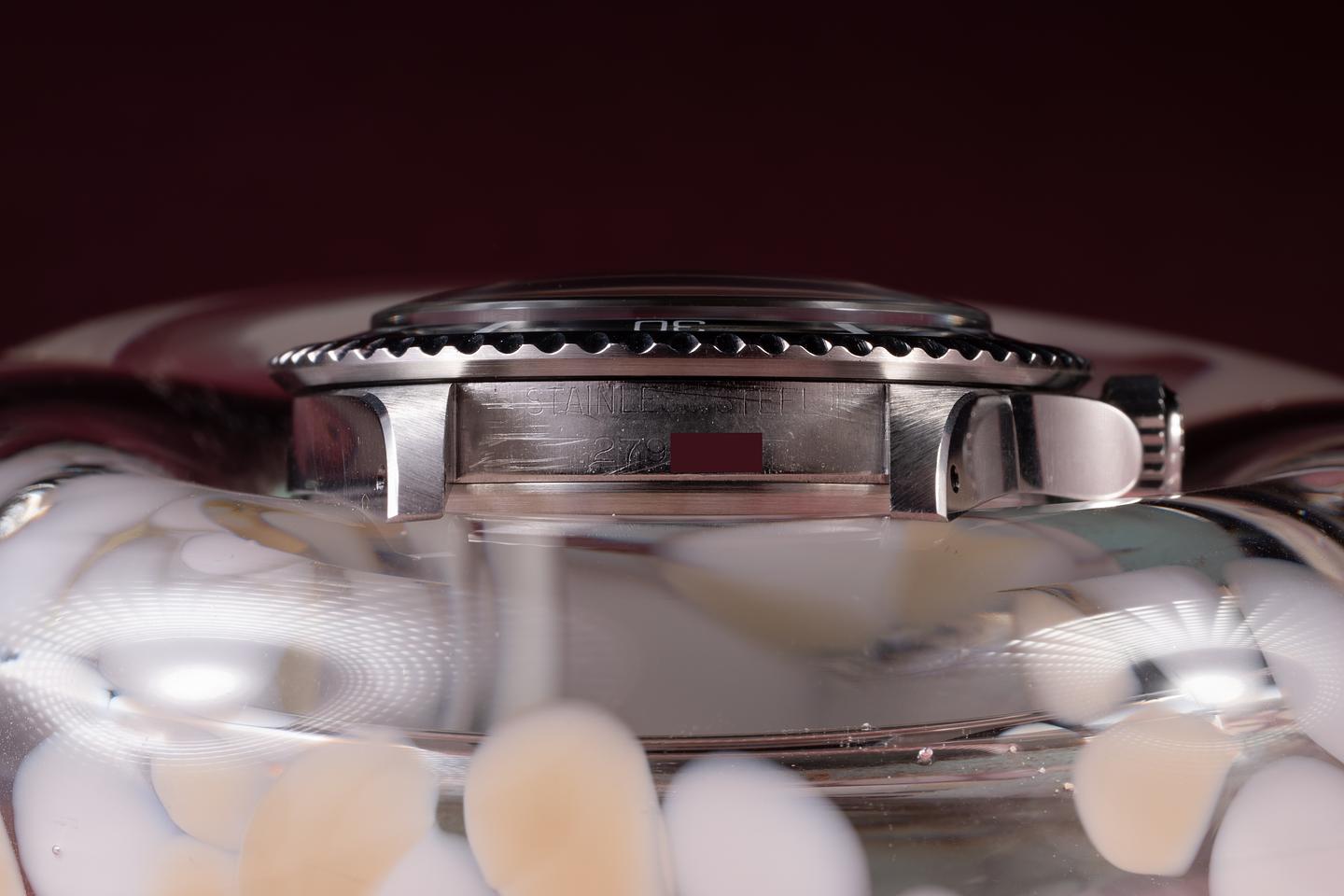 Case: The recently polished case is excellent, showing sharp, prominent bevels and only very light wear. The black service bezel insert is excellent, showing little if any wear.