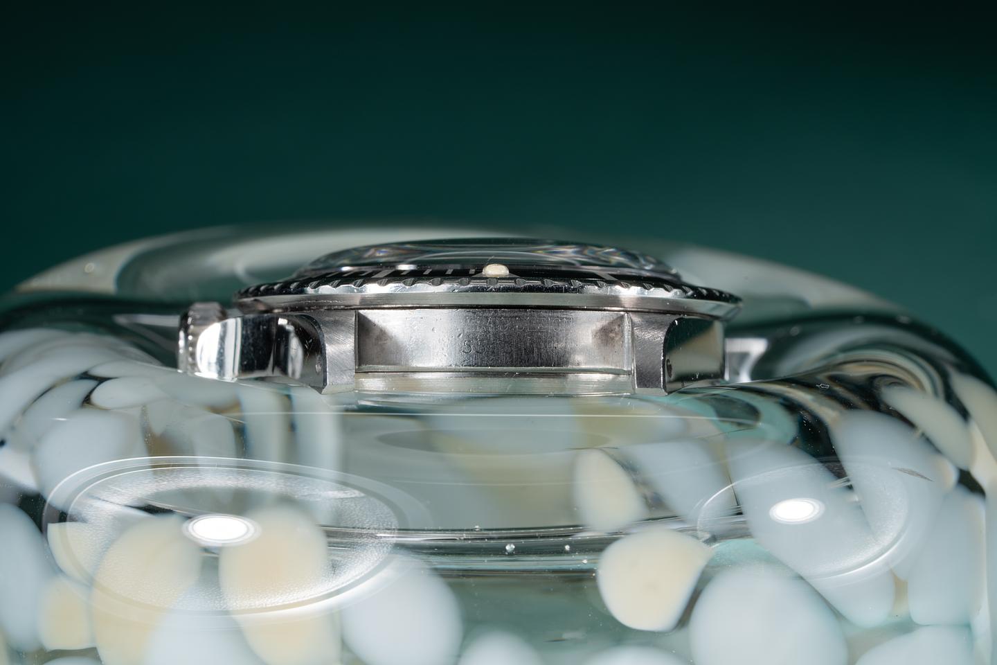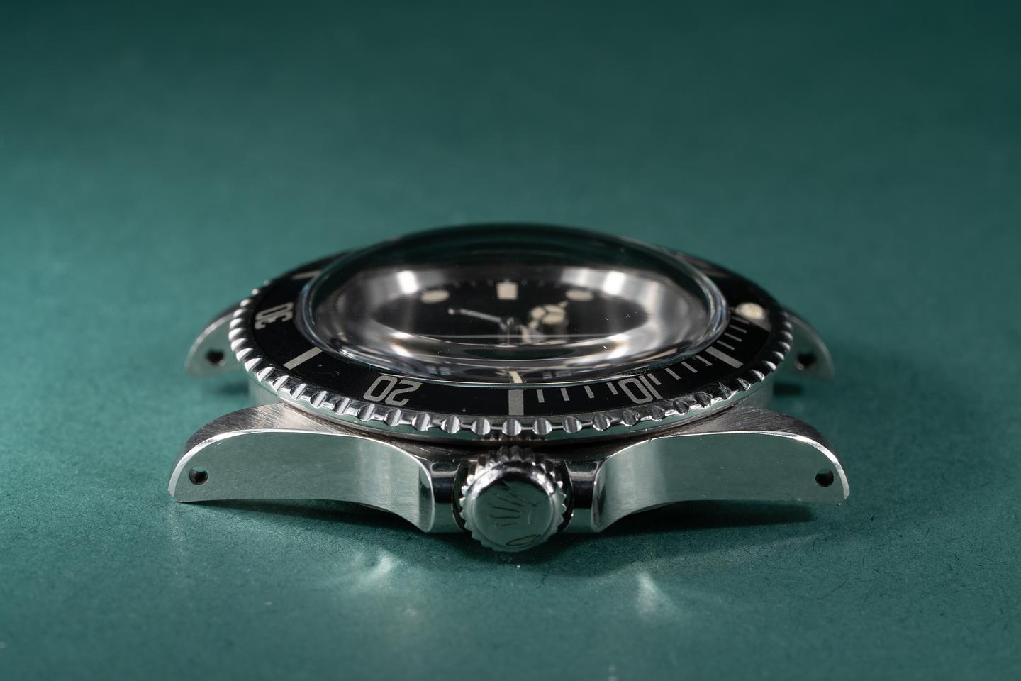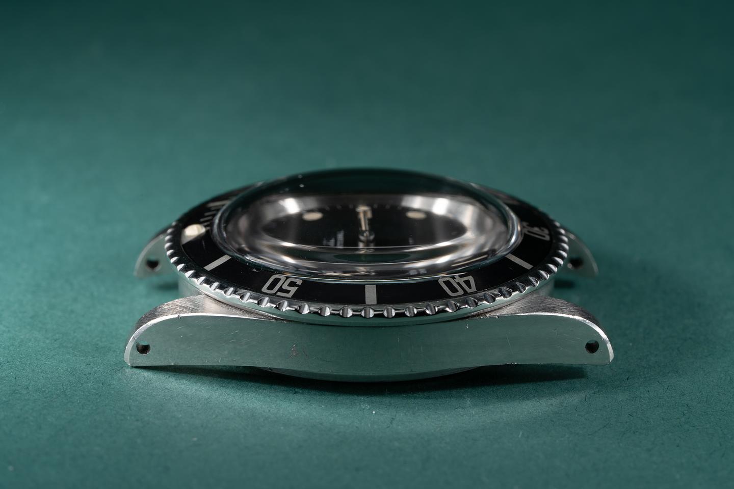 Case: The recently polished case is excellent showing sharp prominent bevels and only light wear from use. The fat font bezel is in overall excellent condition and has faded to a dark navy blue hue. There is one very small chip on the inside of the bezel located just above the 50 index.