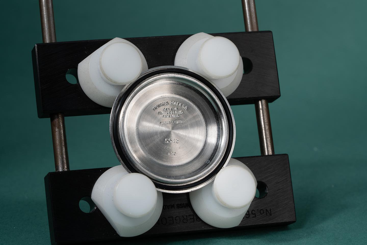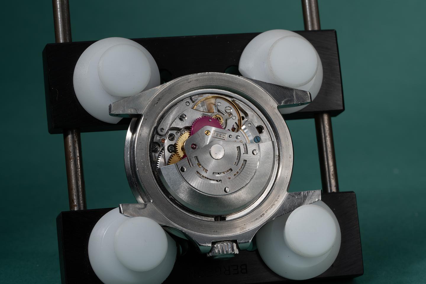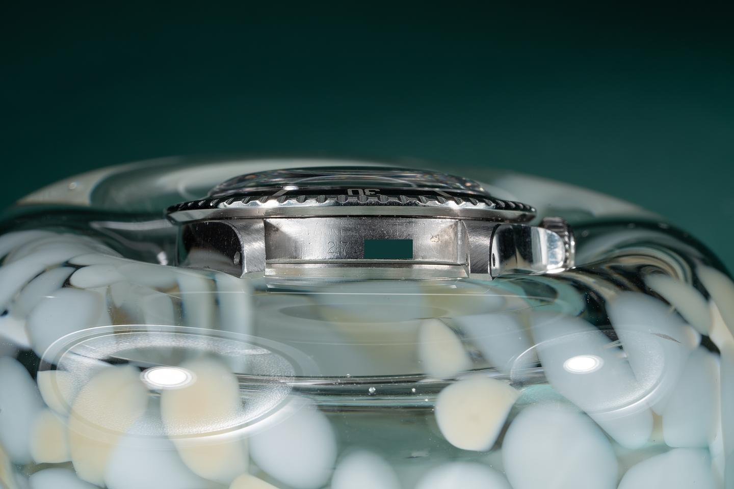 Case: The recently polished case is excellent showing sharp prominent bevels and only light wear from use. The fat font bezel is in overall excellent condition and has faded to a dark navy blue hue. There is one very small chip on the inside of the bezel located just above the 50 index.