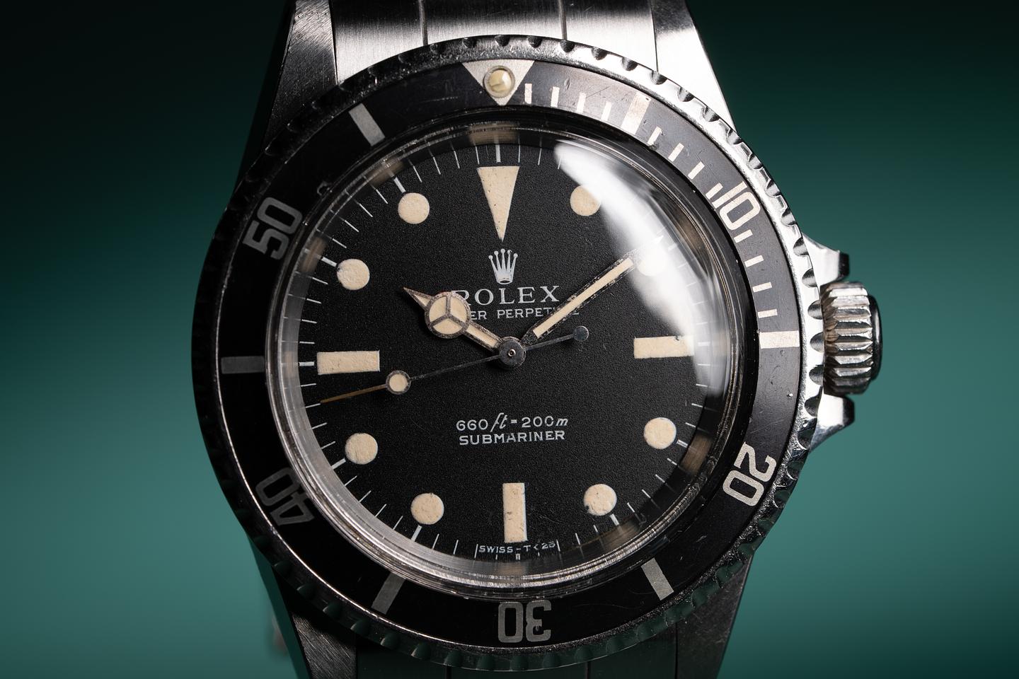 Dial: The satin black serif dial is excellent showing overall light wear from use. There are some small and very slight indentations located between the 5 and 6 o'clock markers. There is also a small chip missing from the top of the 3 o'clock marker.