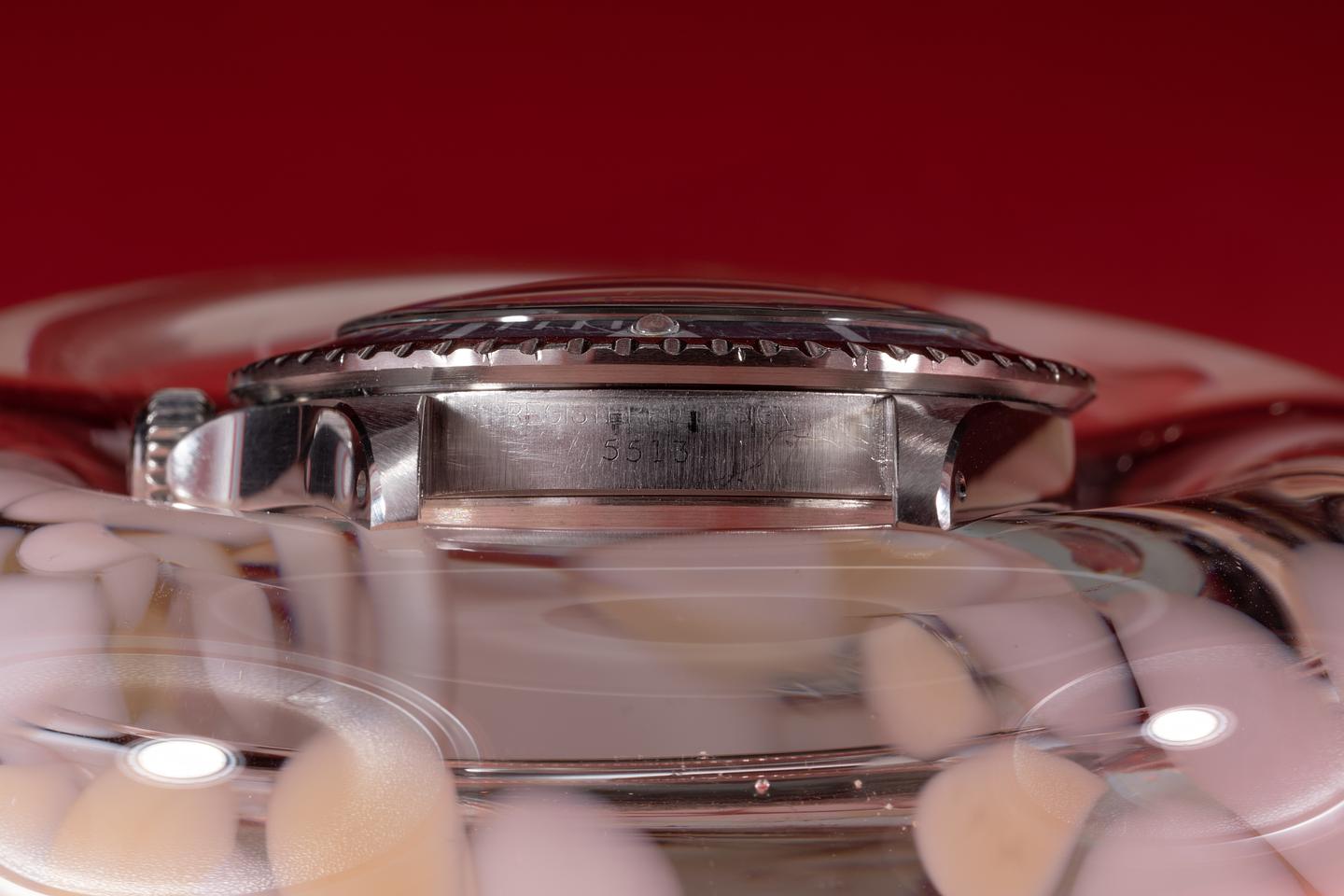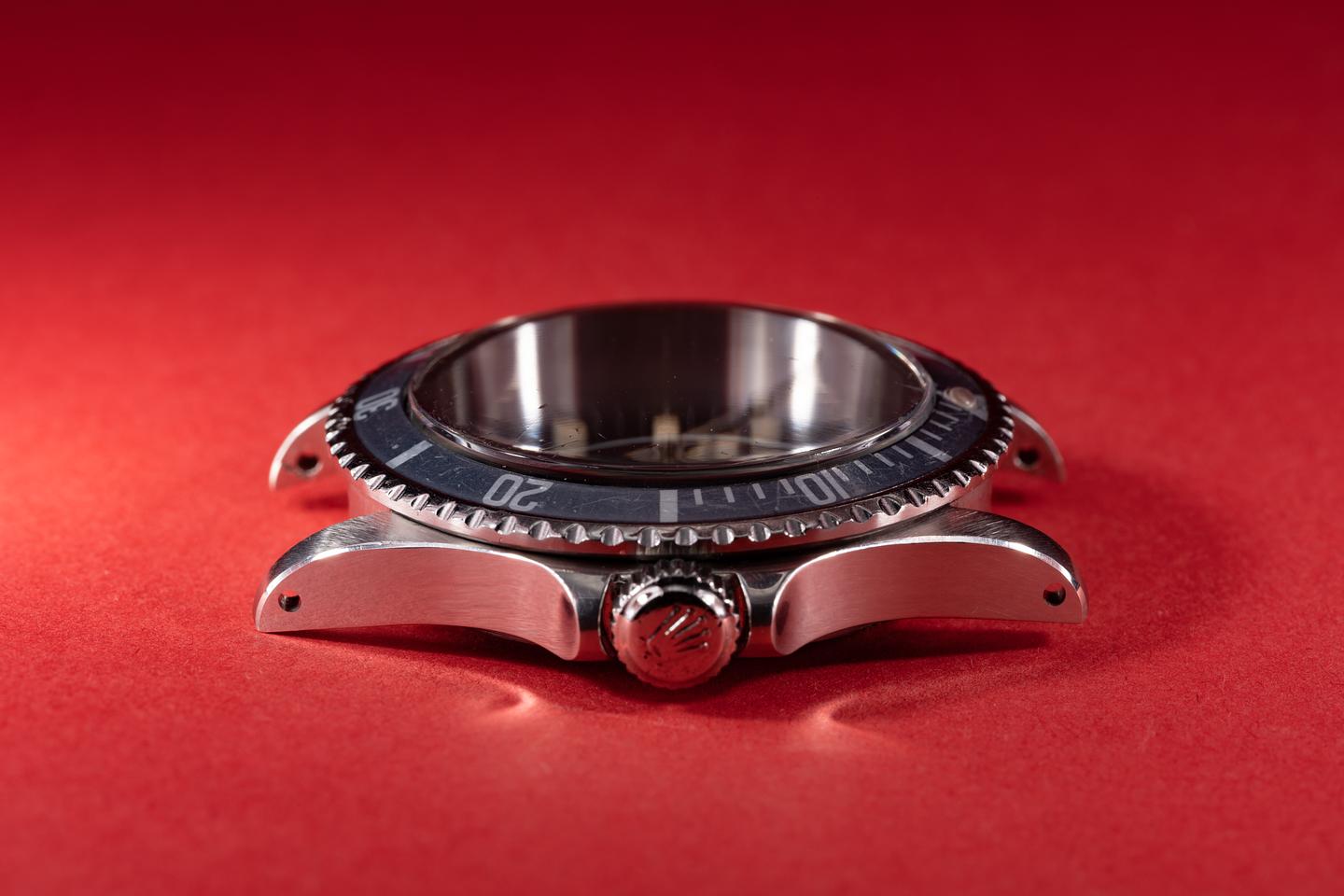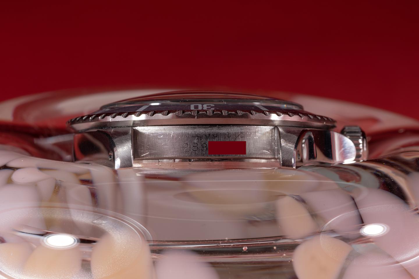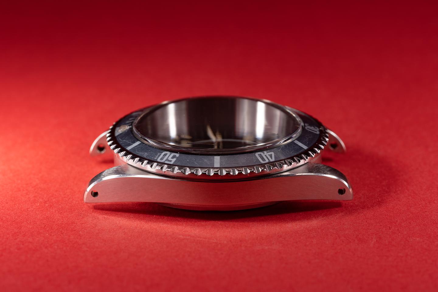 Case: The recently polished case is excellent showing sharp prominent bevels and only very light wear from use. The bezel insert has faded to light silvery blue-grey and shows average wear from use.