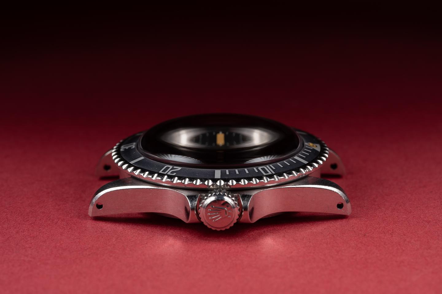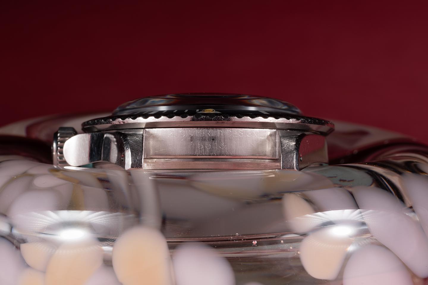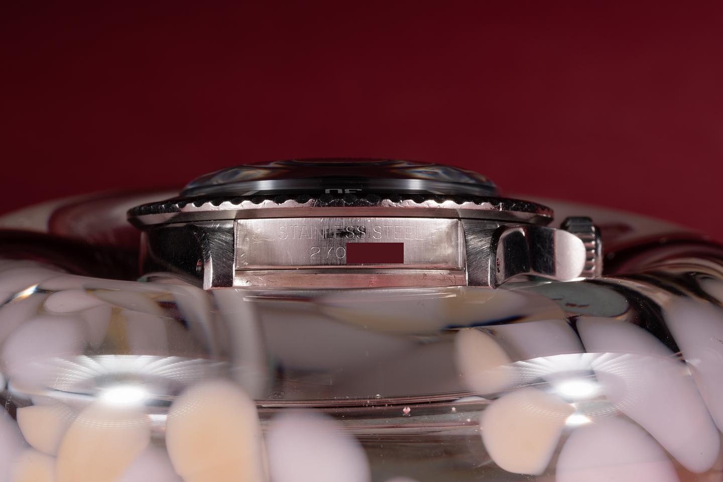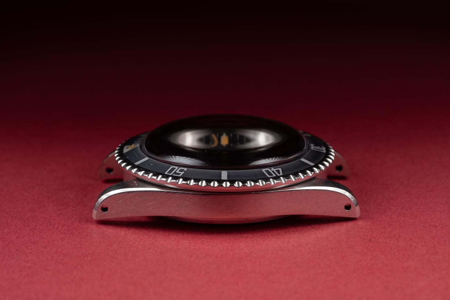 Case: The thick and even case is excellent showing sharp, prominent bevels and some light wear from use. The bezel insert is also in excellent condition and has faded to a light silvery grey showing only light wear form use.