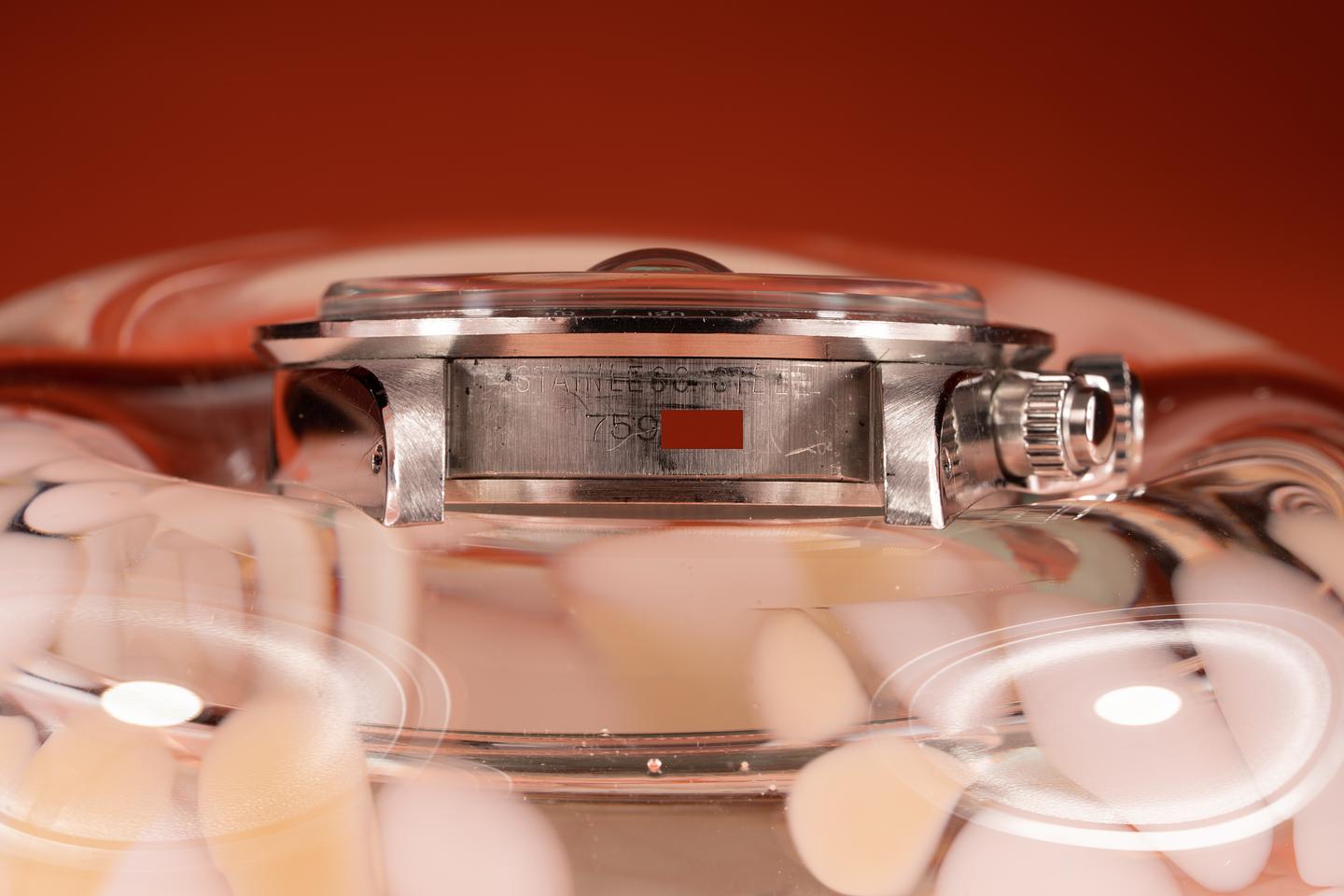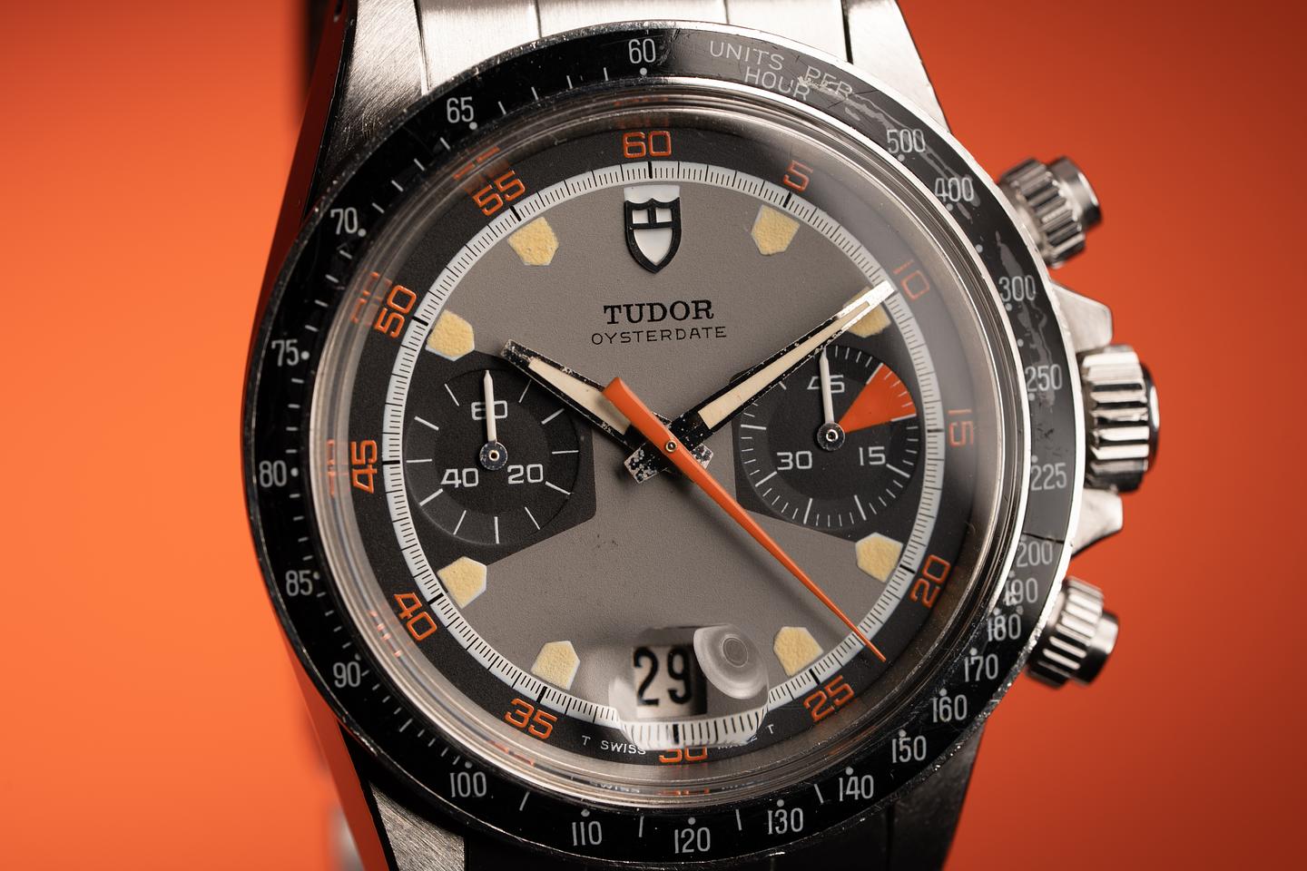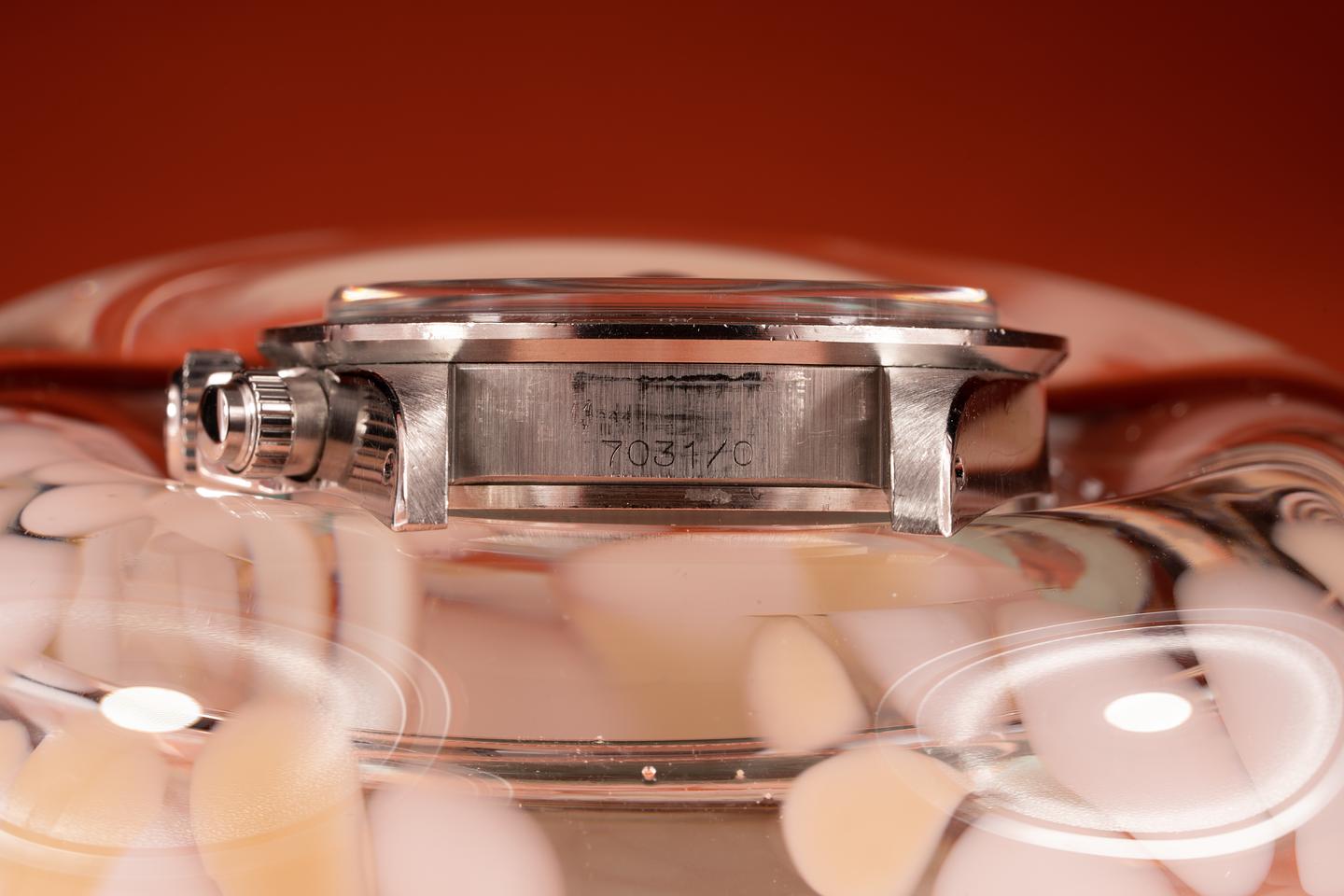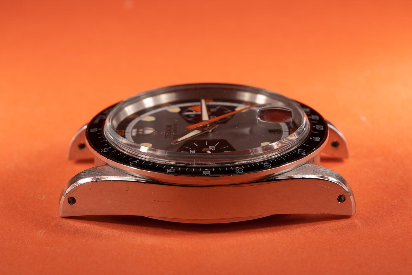 Dial: The grey, black, and orange dial is excellent showing overall light wear for its age. There is some subtle spotting just below and to the right of the left subdial. The lume has aged to a warm creamy hue and the hands have aged slightly lighter than the dial.