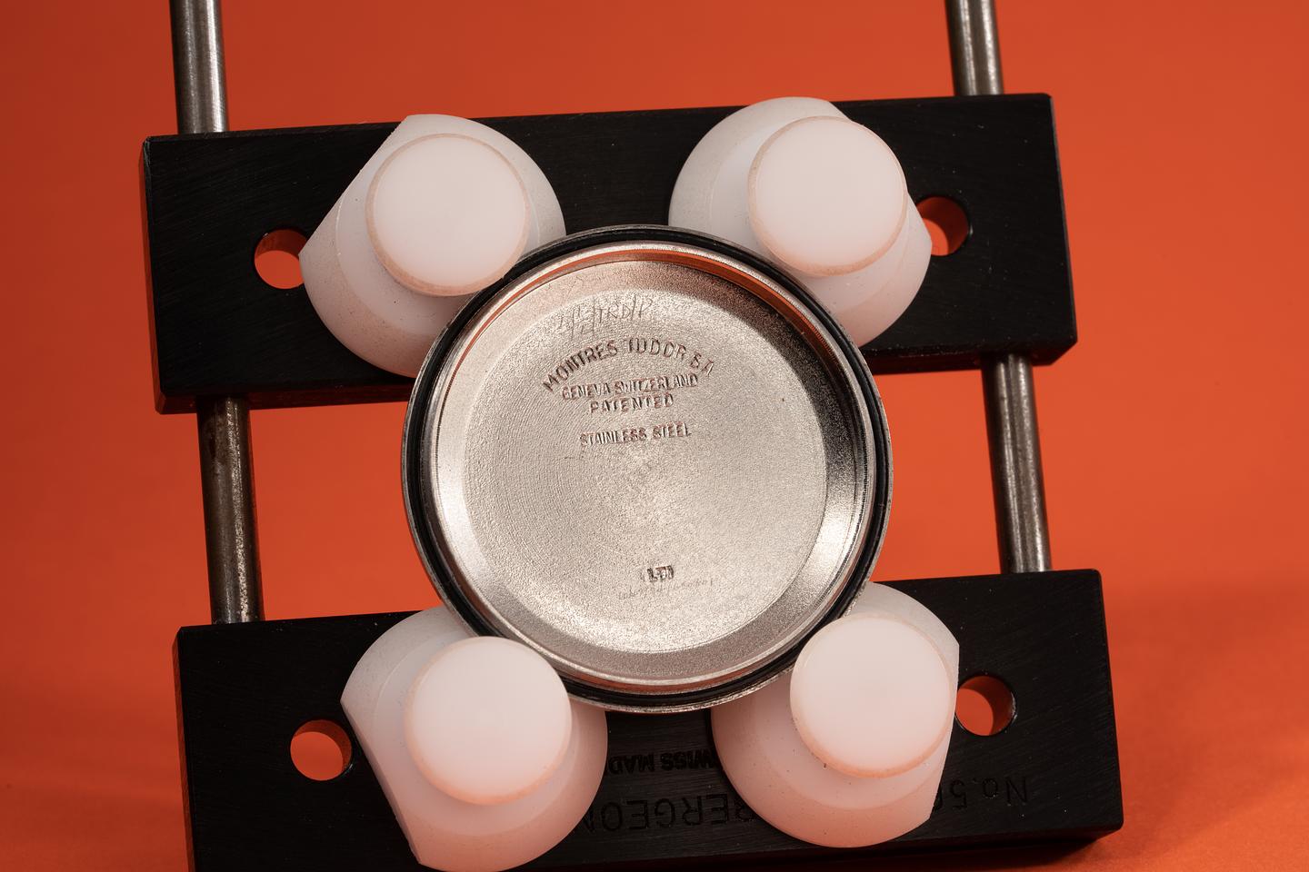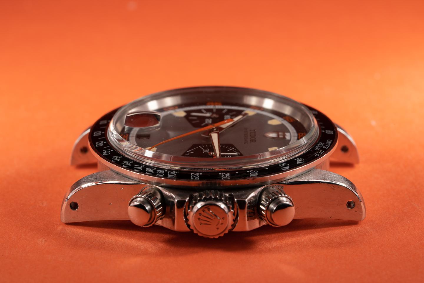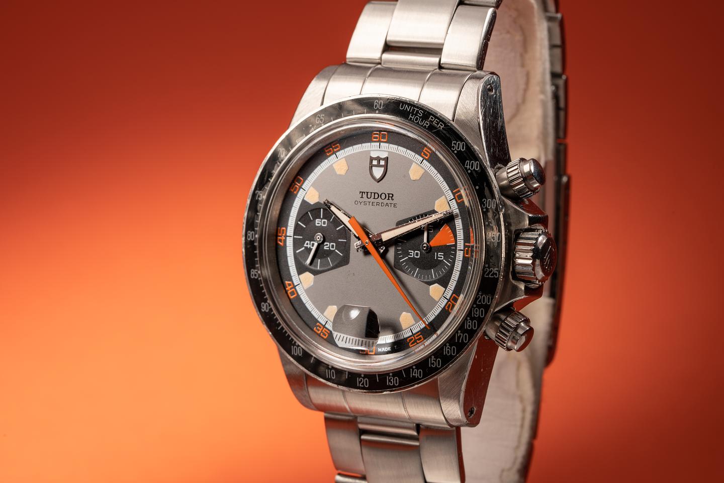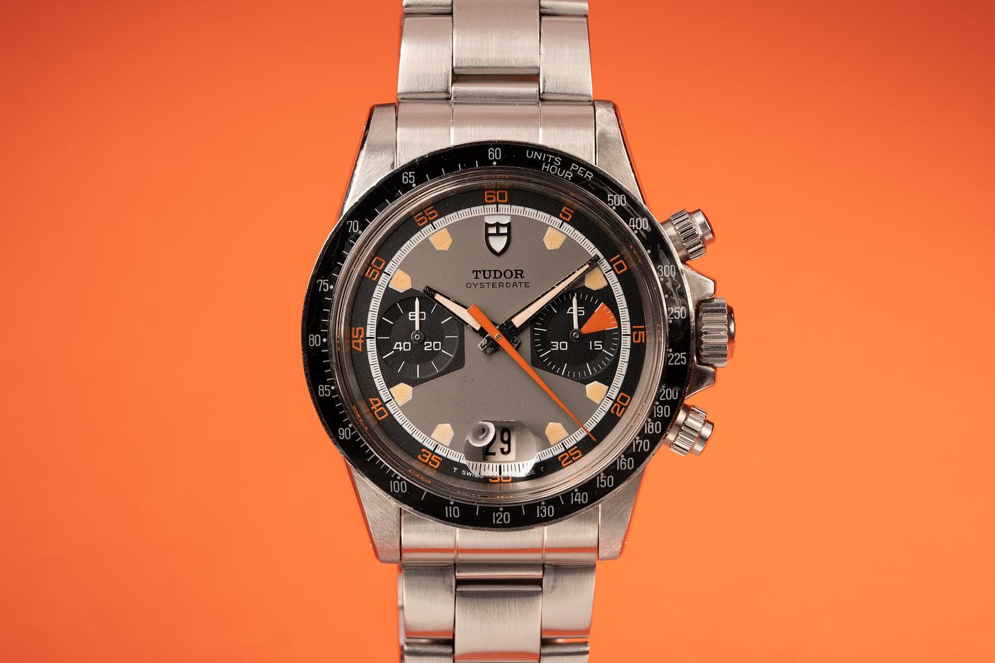 Dial: The grey, black, and orange dial is excellent showing overall light wear for its age. There is some subtle spotting just below and to the right of the left subdial. The lume has aged to a warm creamy hue and the hands have aged slightly lighter than the dial.