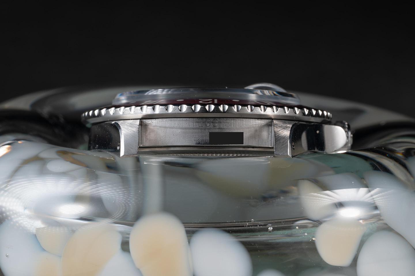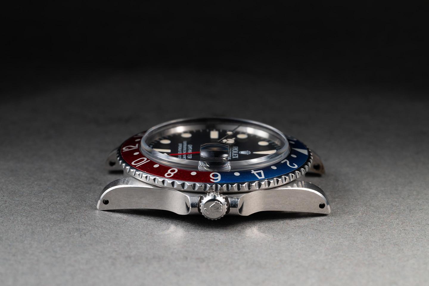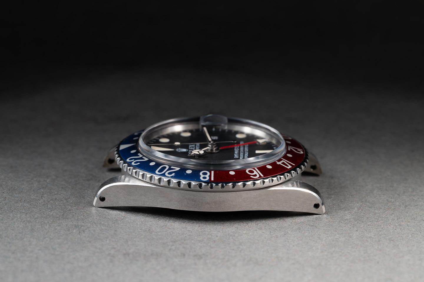 Case: The thick, even case is excellent, showing sharp, prominent bevels and only light wear from use. The blue and red "Pepsi" bezel insert is also in excellent condition, showing only very light wear from use.