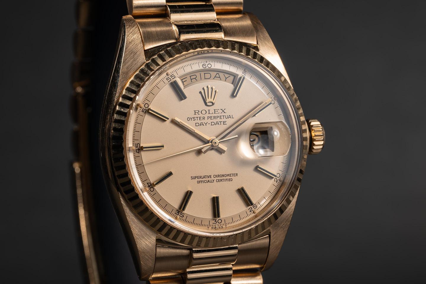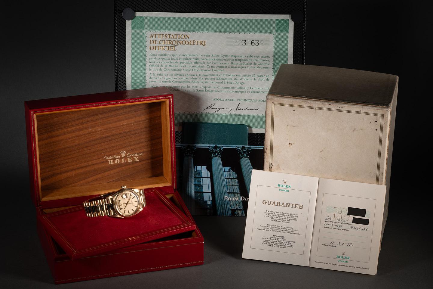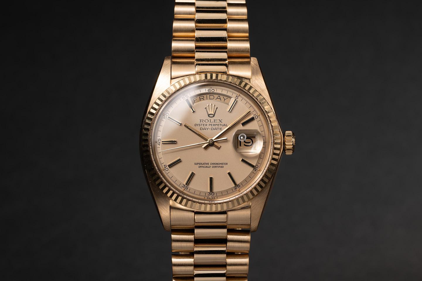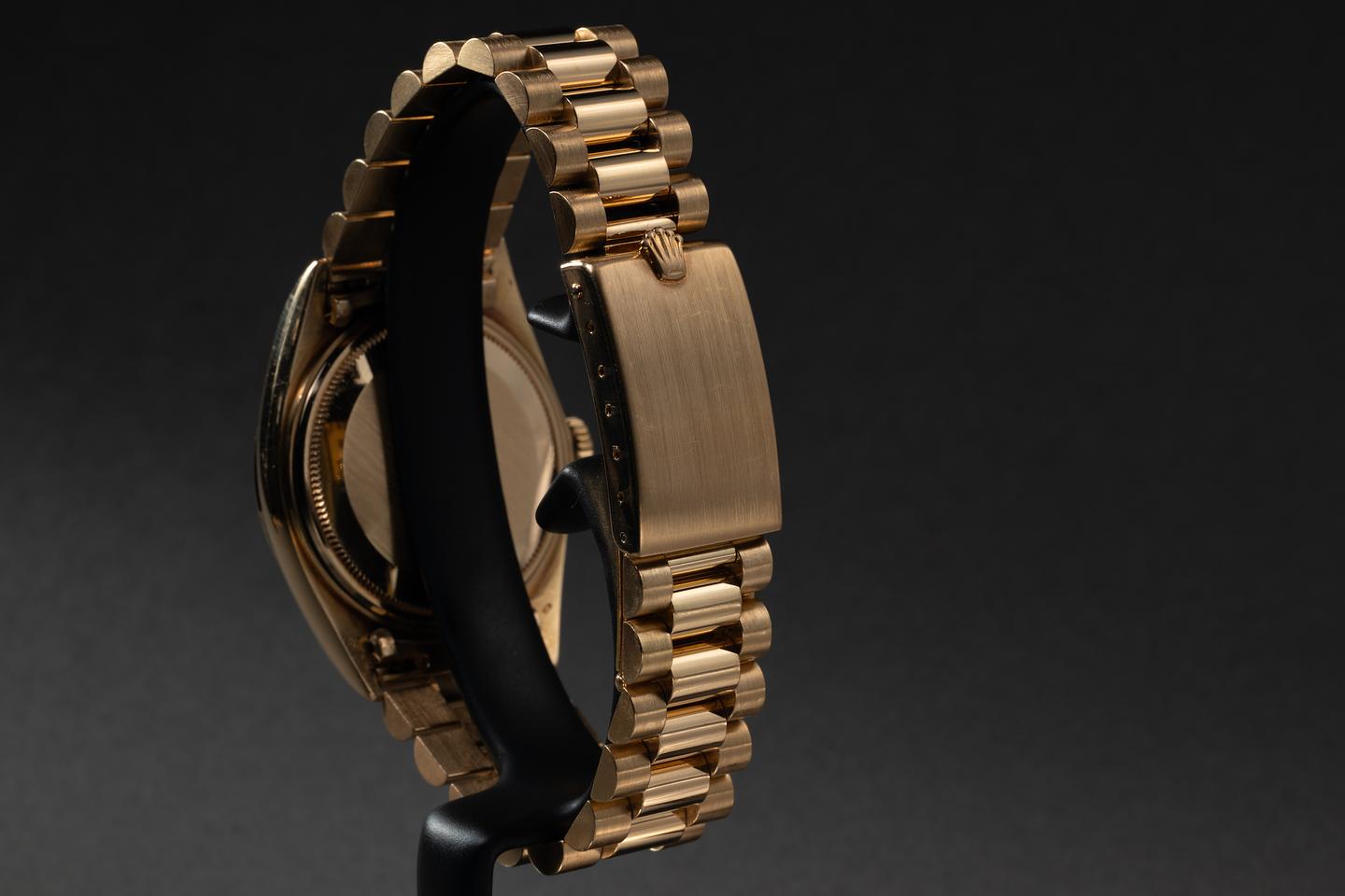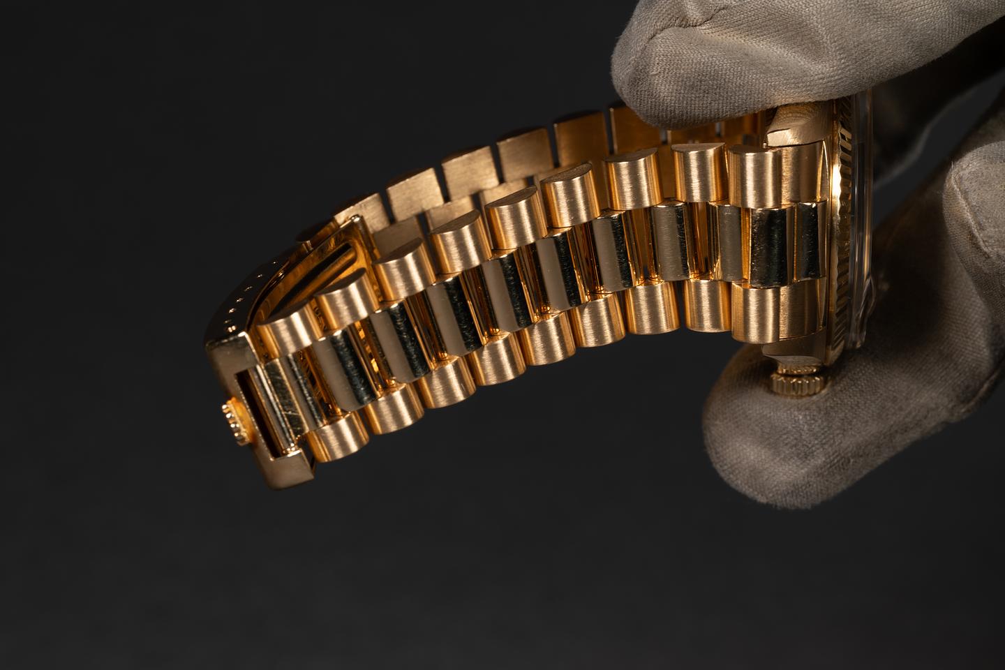 Bracelet: The 19-link 18K yellow gold president bracelet is excellent showing light to average stretch for its age. The bracelet will fit up to a 7.25in wrist.