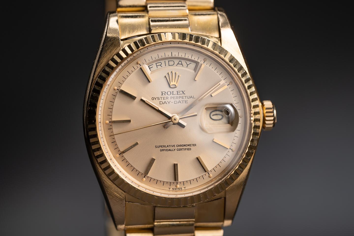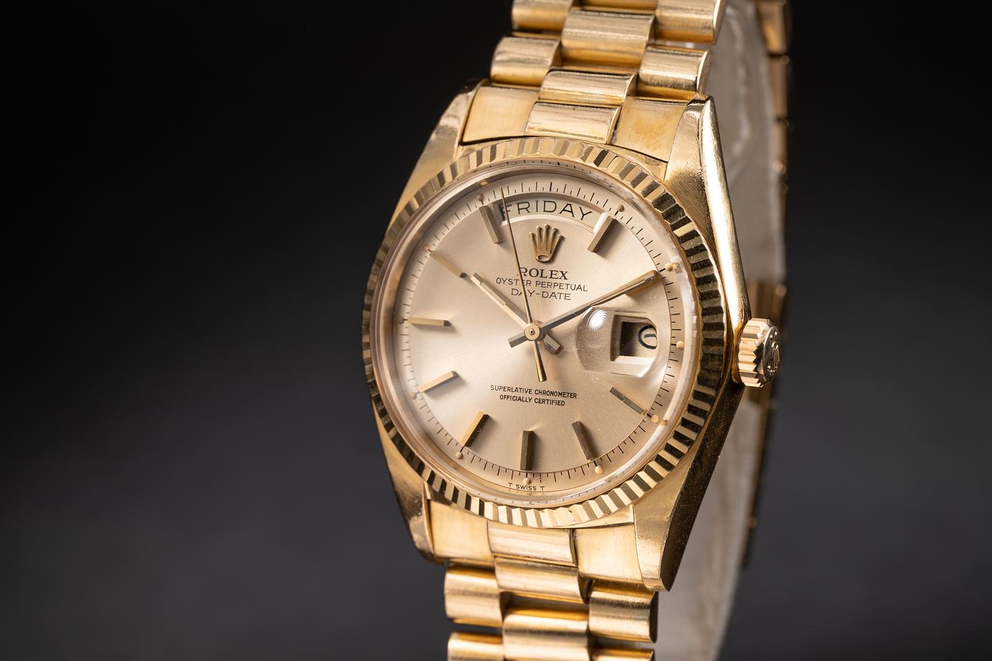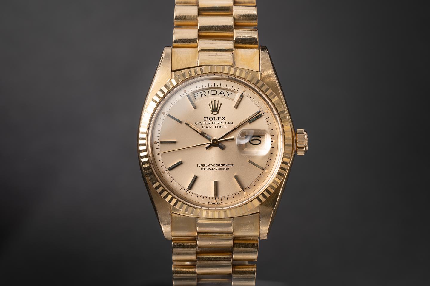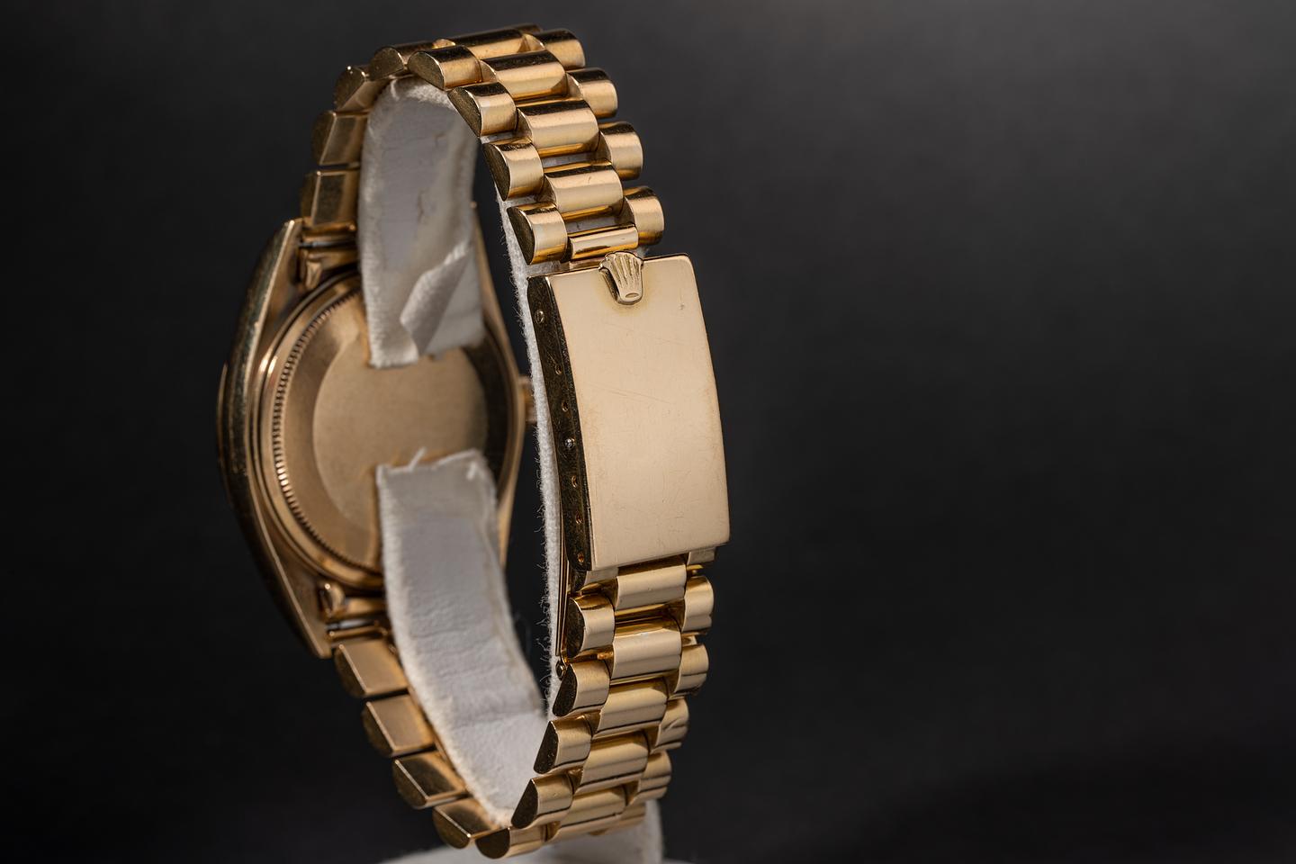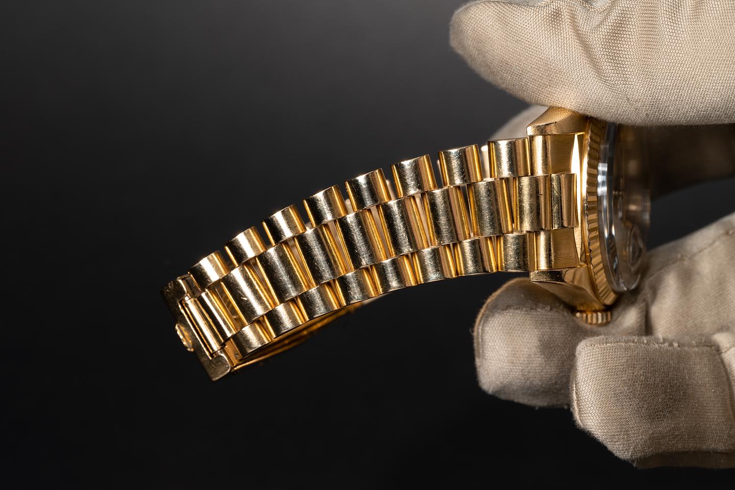 Bracelet: The 19 link 18k yellow gold "Big Logo" made in Japan president bracelet is excellent showing average stretch for its age.