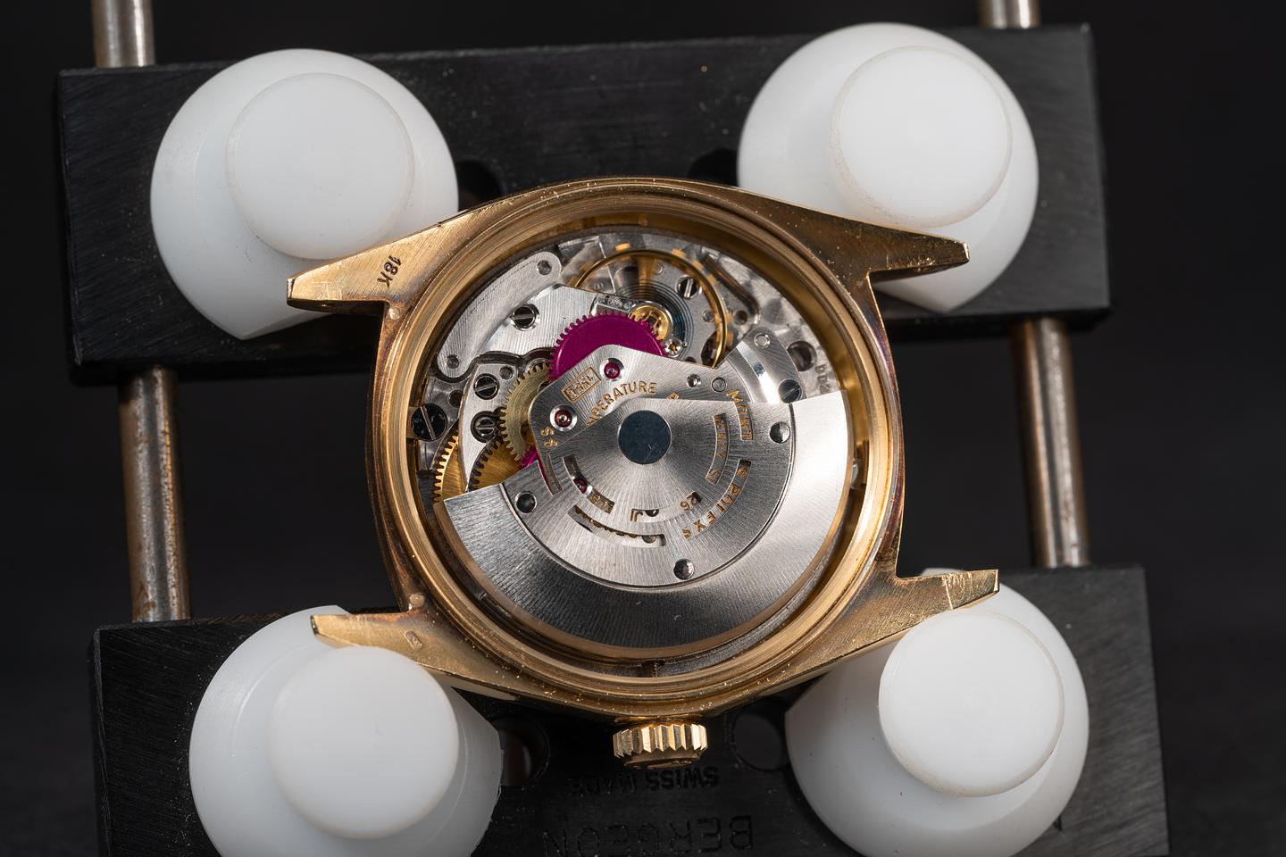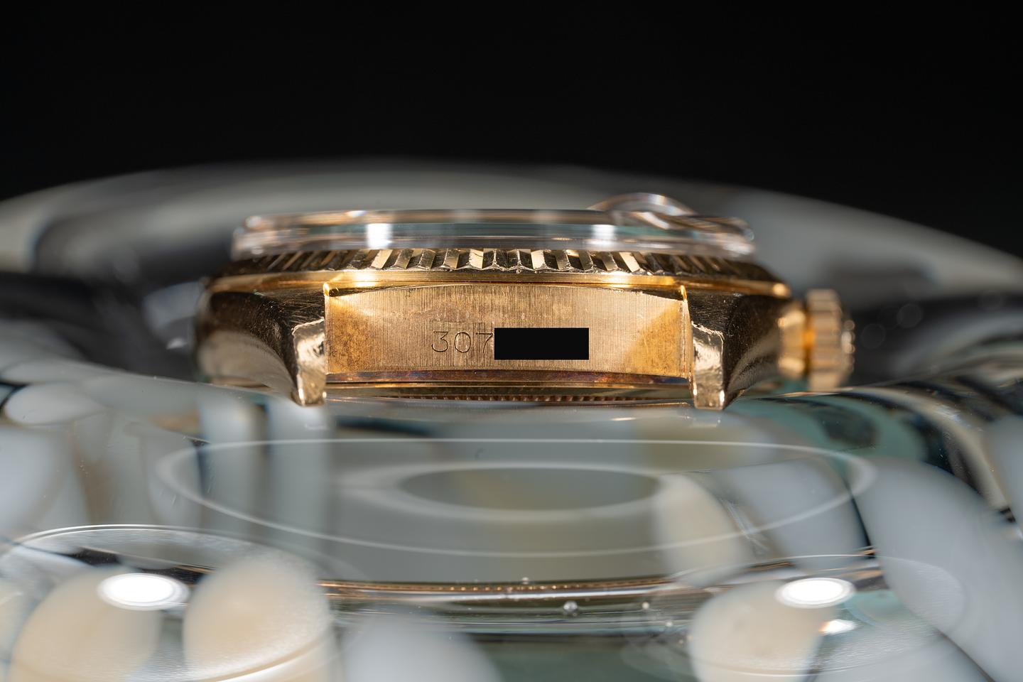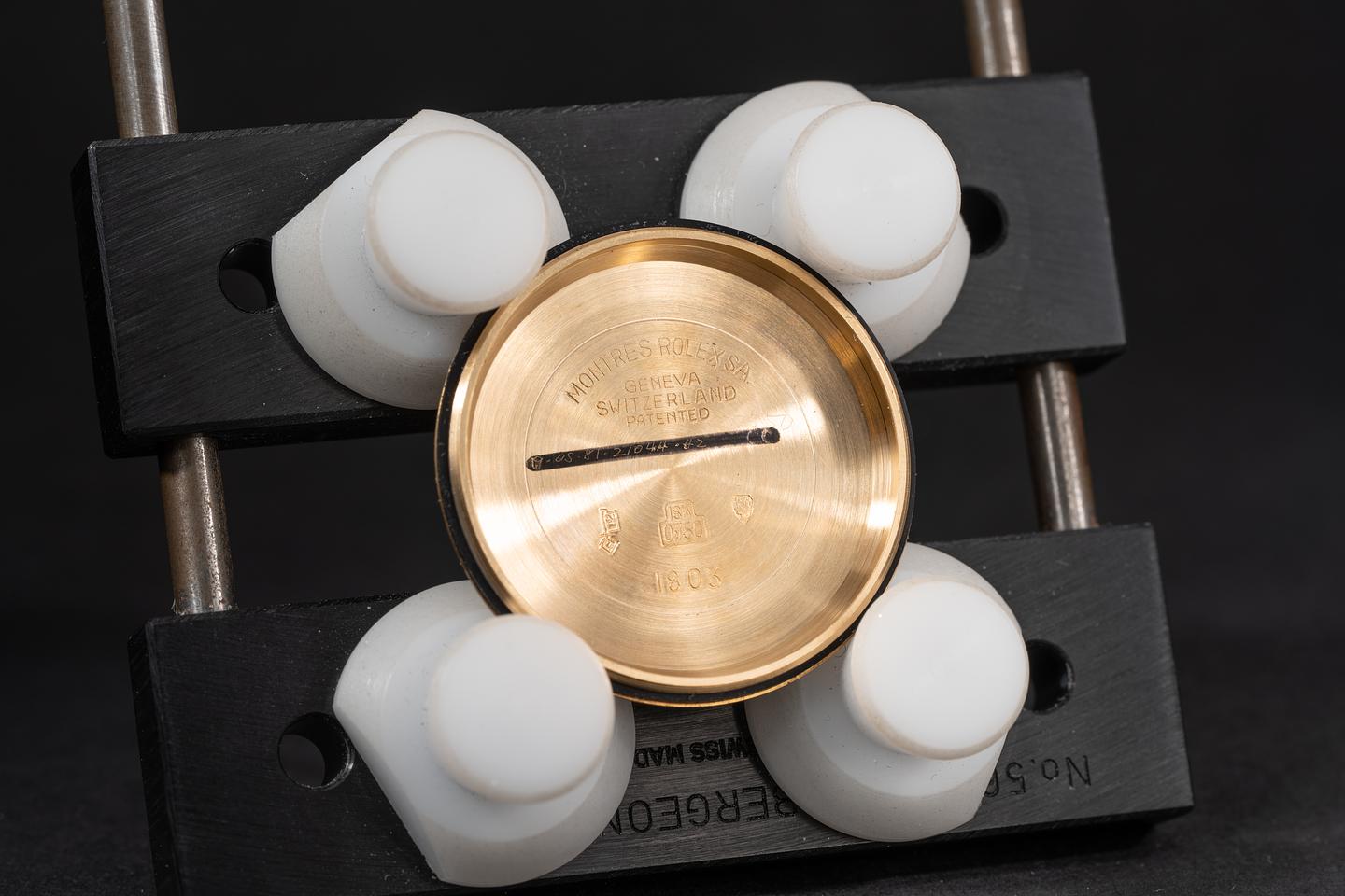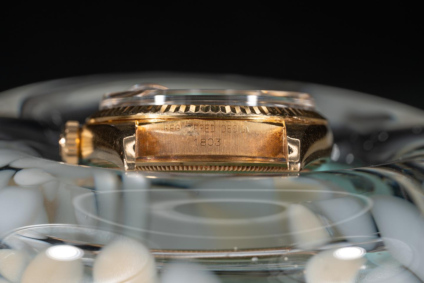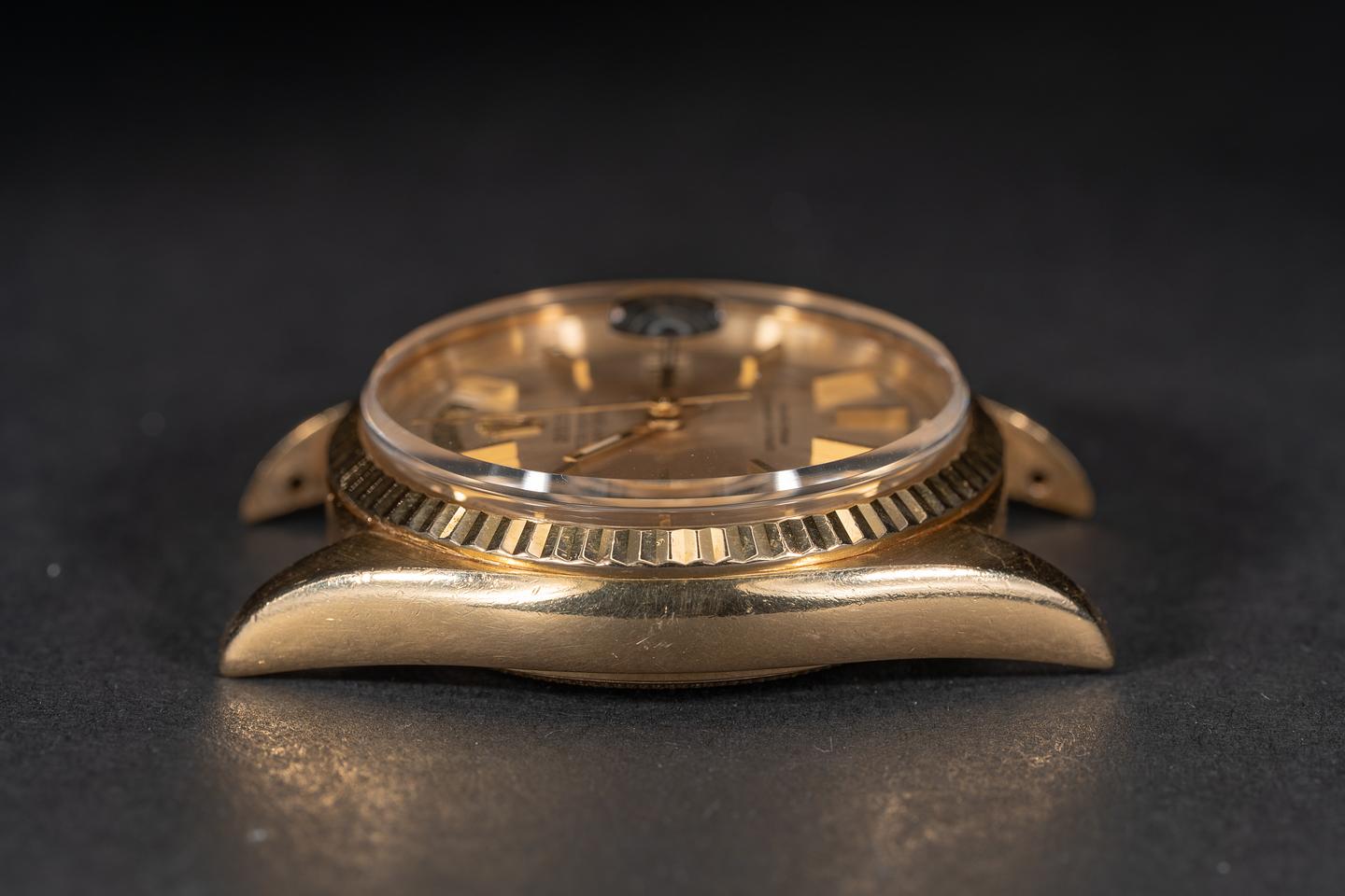 Case: The previously polished case is excellent showing a sleeve polished finish and some light wear from use. The 18k yellow gold bezel is sharp showing only light wear from use. The original crystal shows some light scratching for its age.