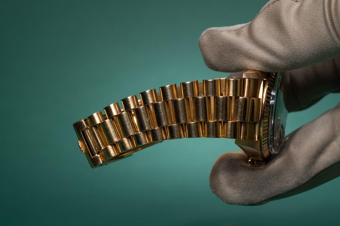 Bracelet: The 18k yellow gold "Made in Japan" President bracelet is very good showing average stretch for its age. The bracelet will fit between a 6.6" - 7.4" wrist.