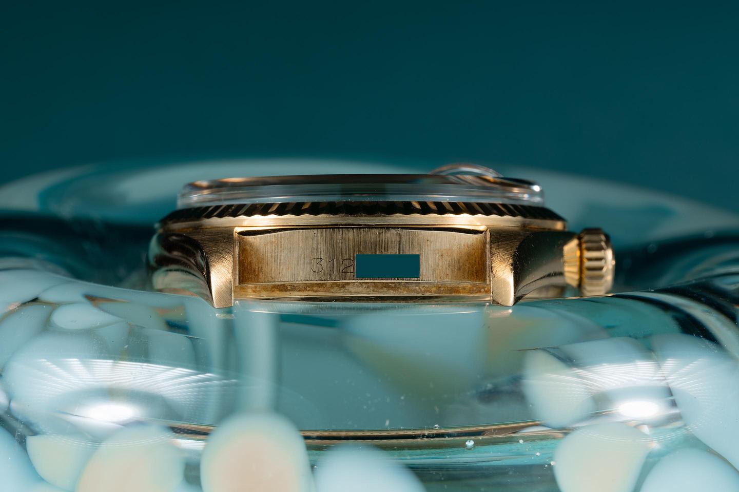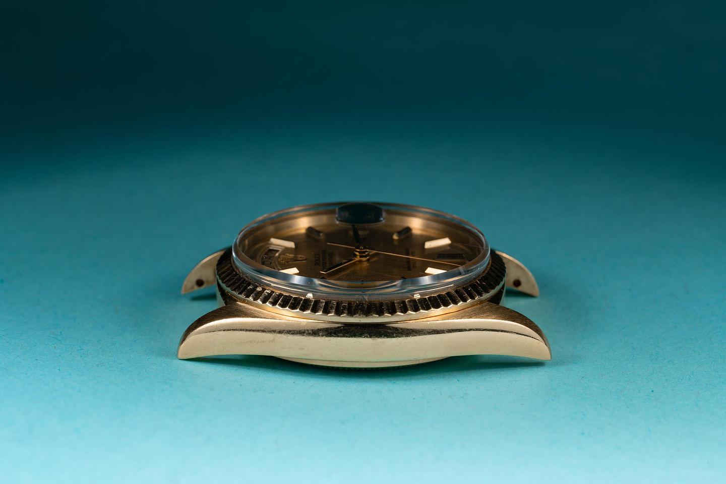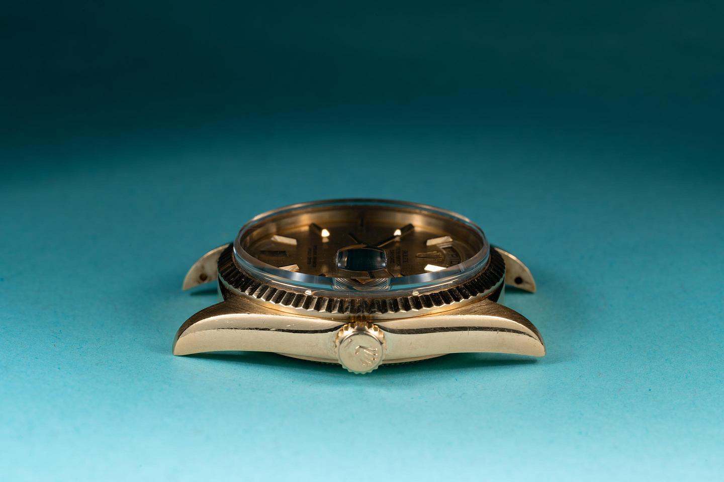 Case: The thick and even 18k yellow gold case is excellent showing only light wear for its age. The 18k yellow gold fluted bezel is also in excellent condition showing only light wear from use.