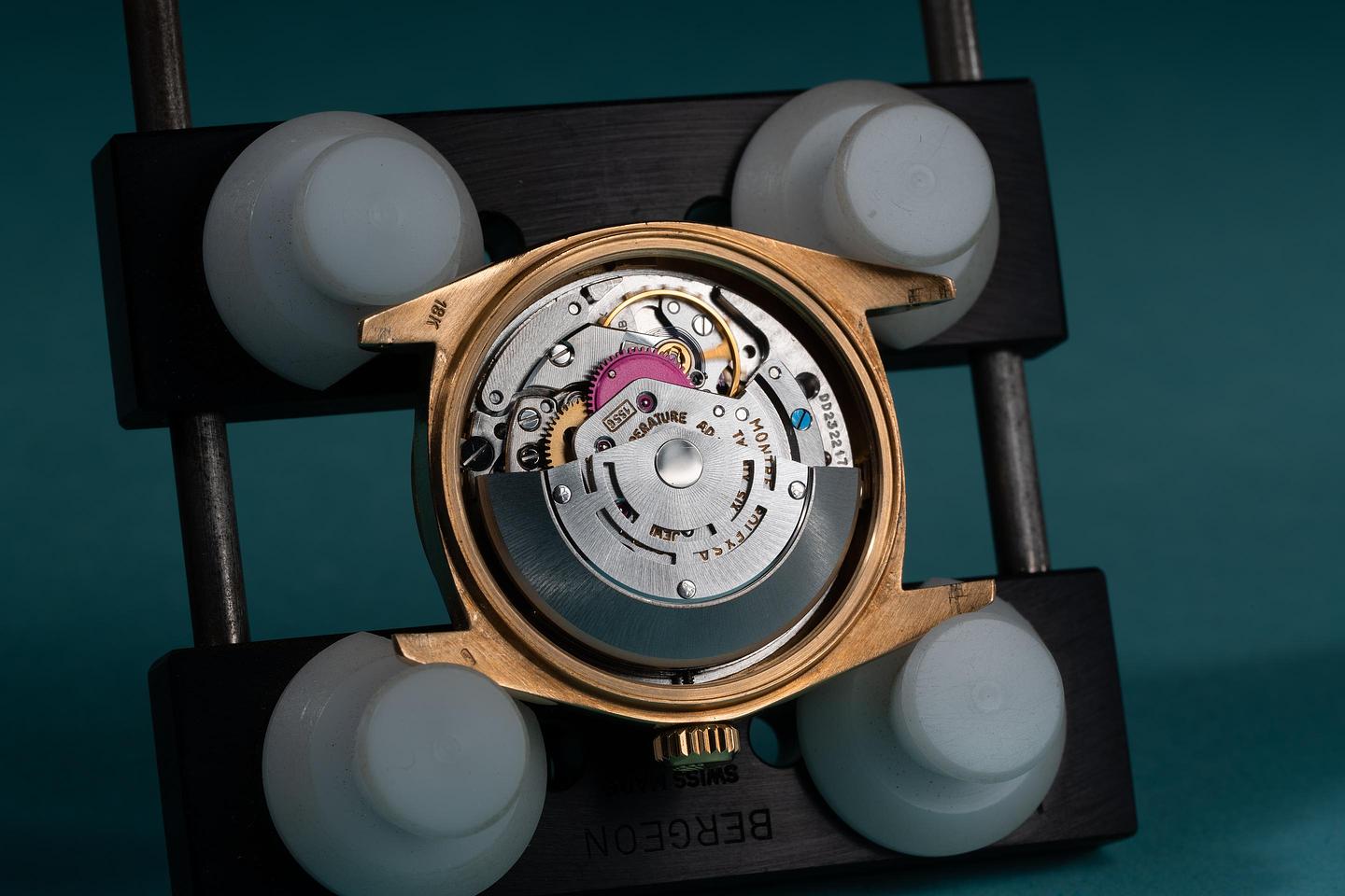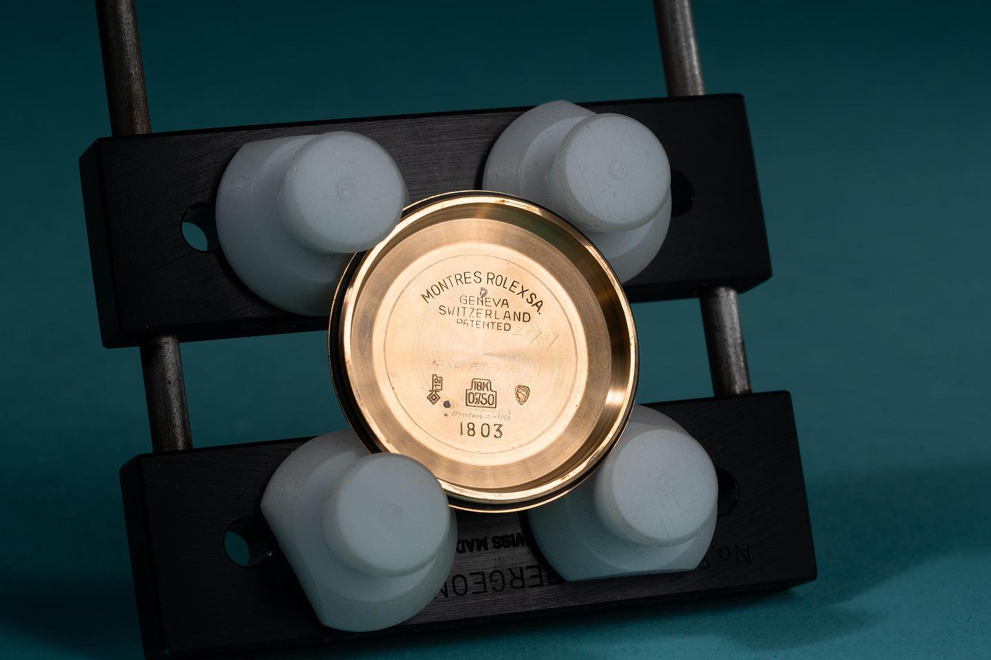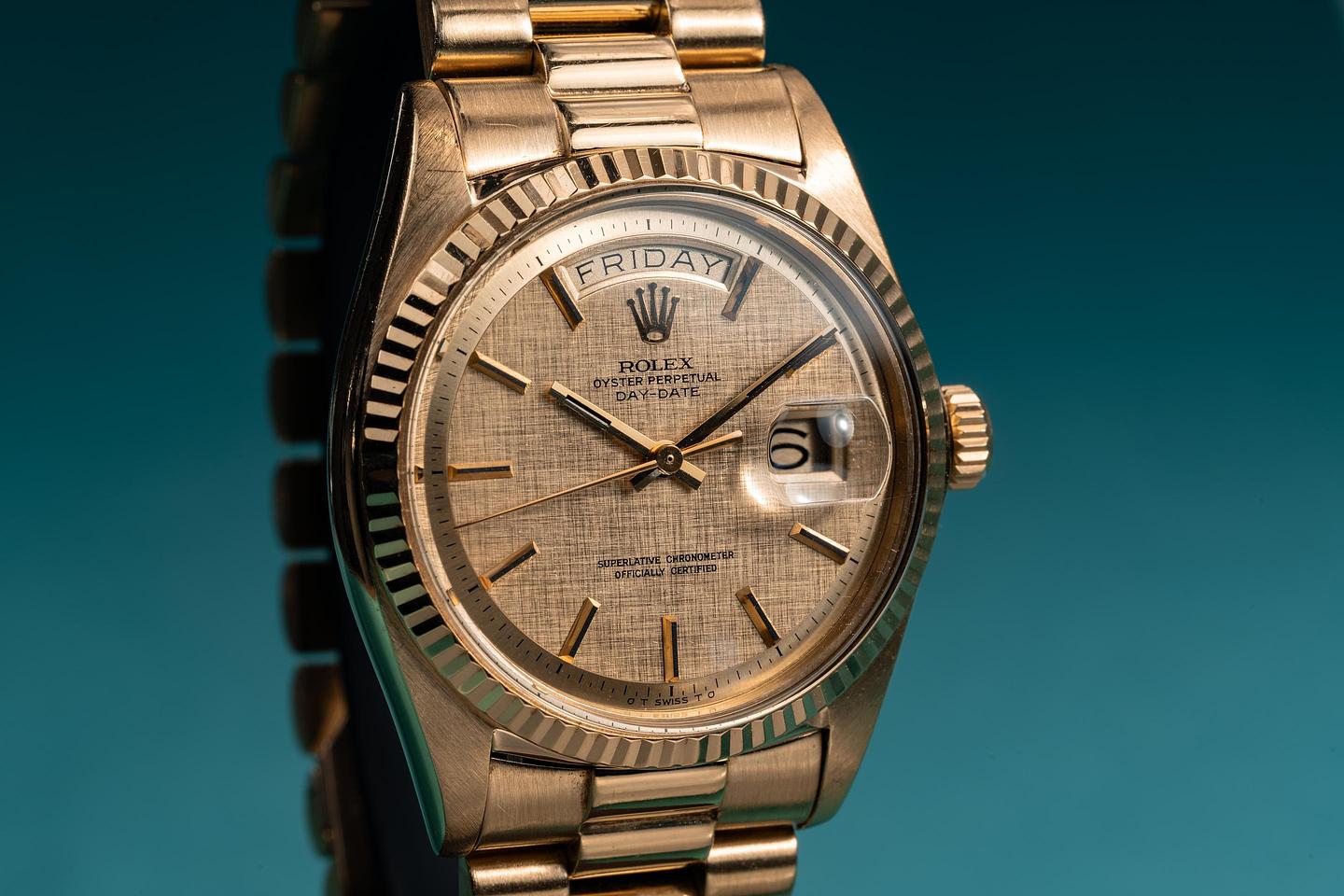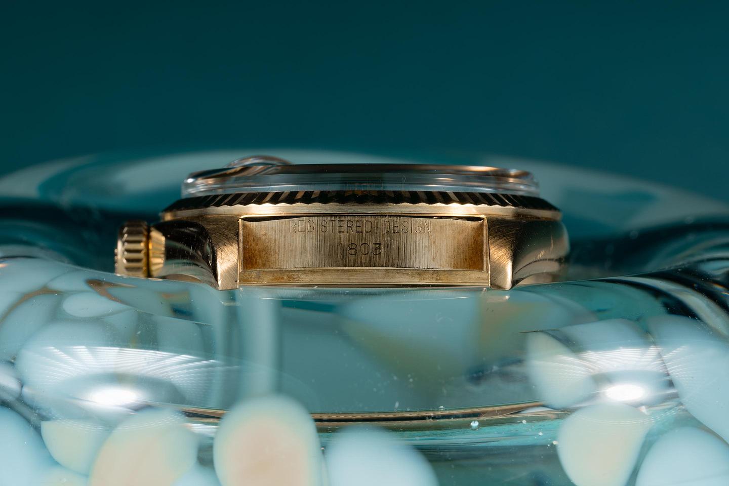 Case: The thick and even 18k yellow gold case is excellent showing only light wear for its age. The 18k yellow gold fluted bezel is also in excellent condition showing only light wear from use.