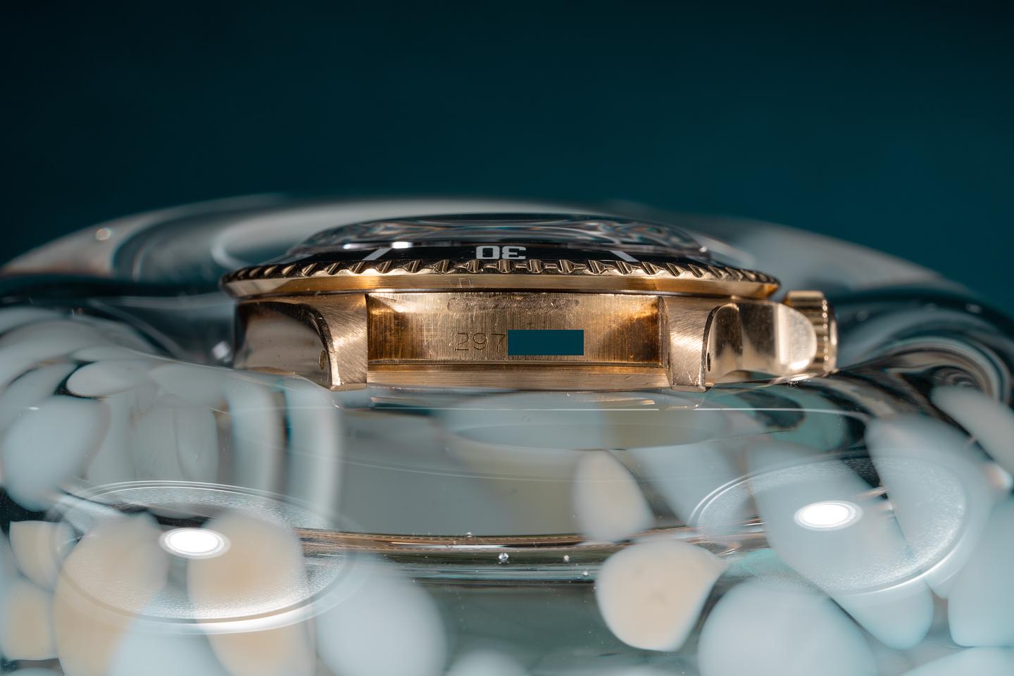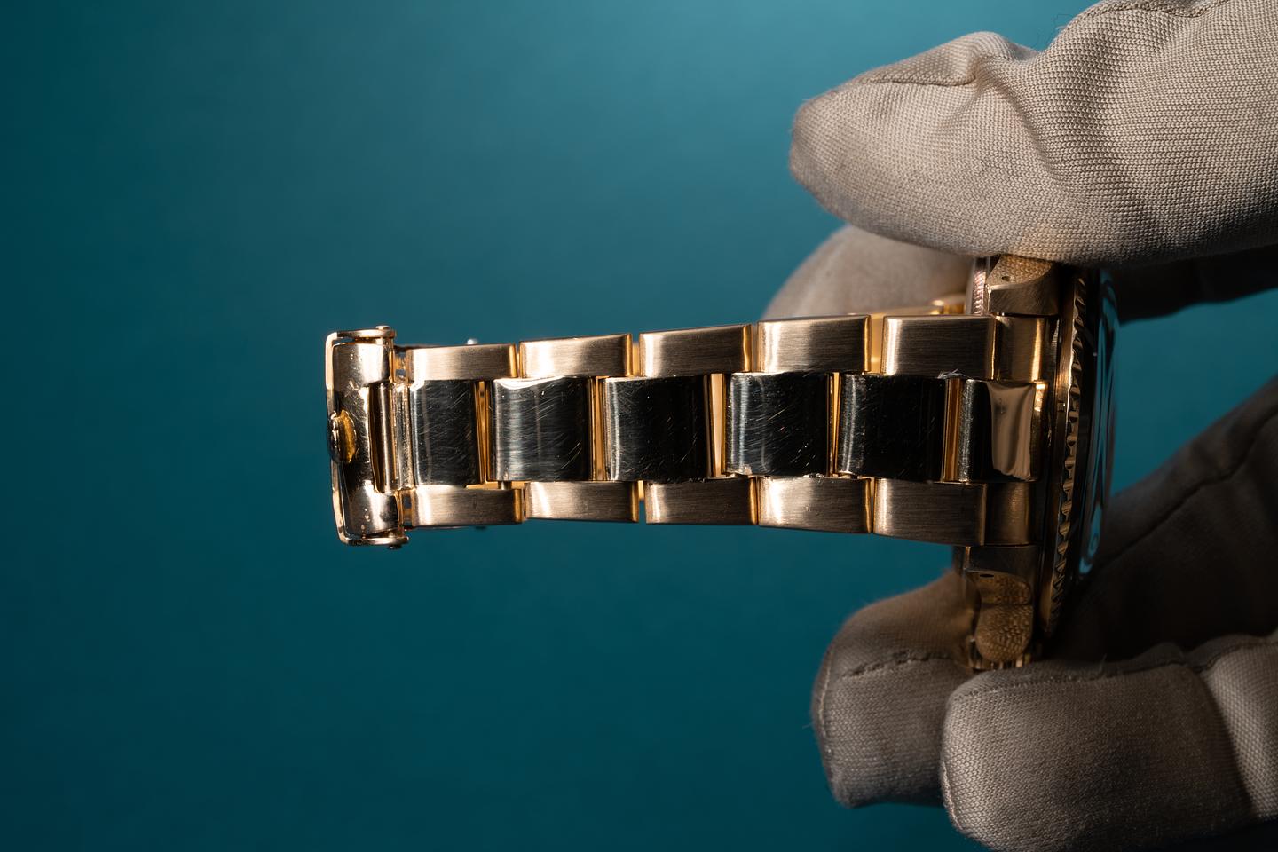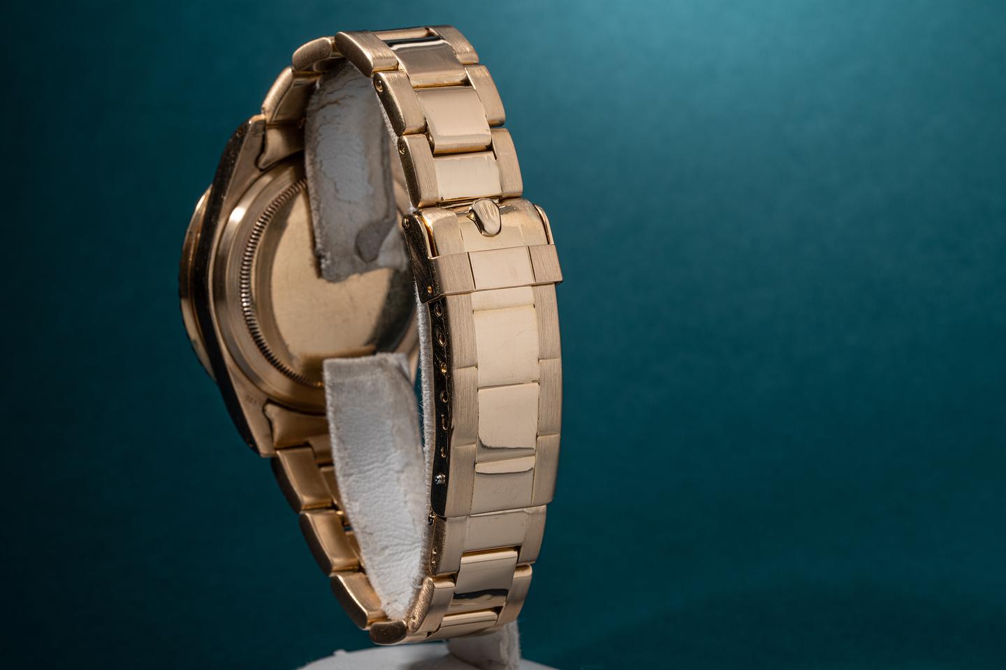 Case: The 18k yellow gold case has been polished in the past showing sharp prominent bevels and only light wear from use. The black bezel insert is fading to a satin charcoal grey tone and shows some light wear from use. The watch has been fired with a True Dome D19 crystal.