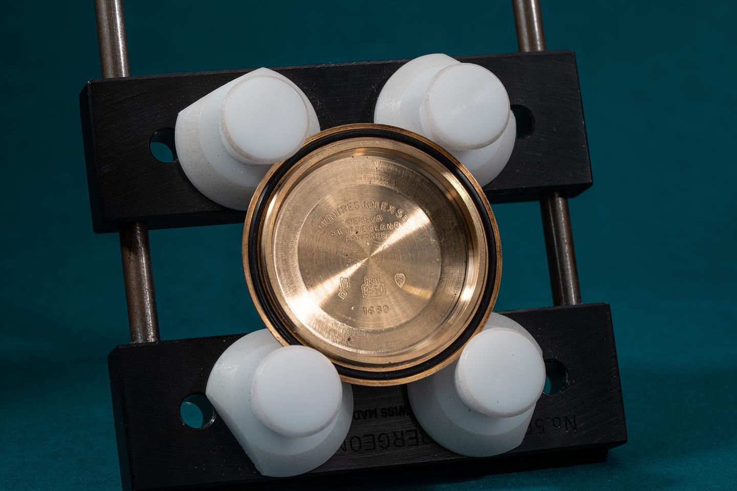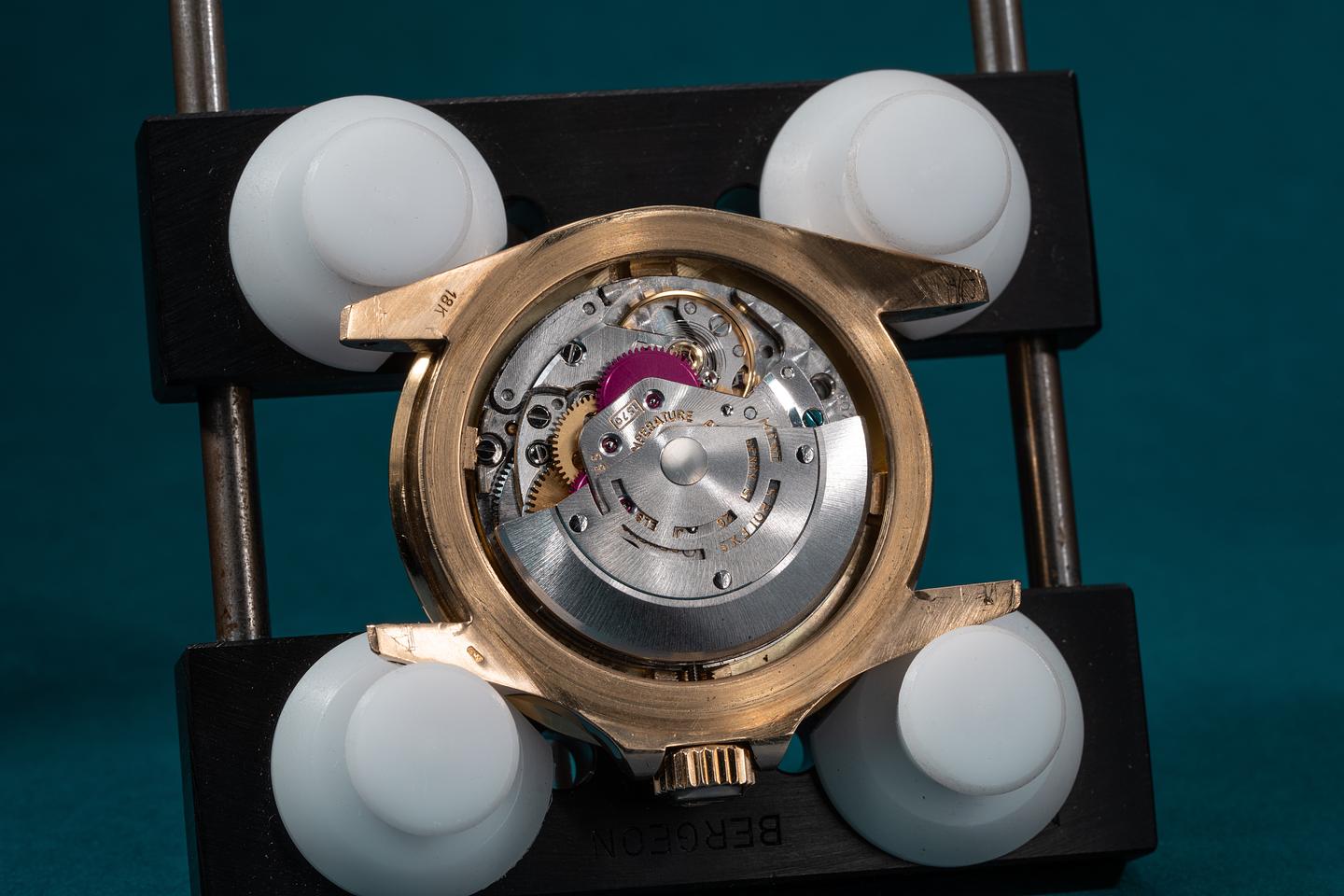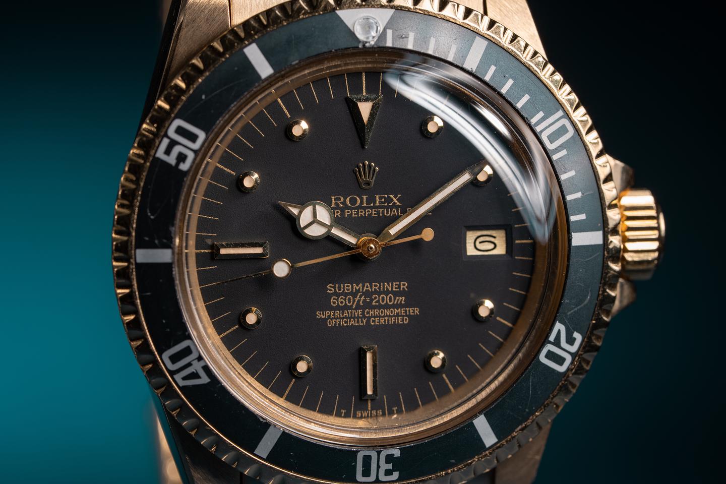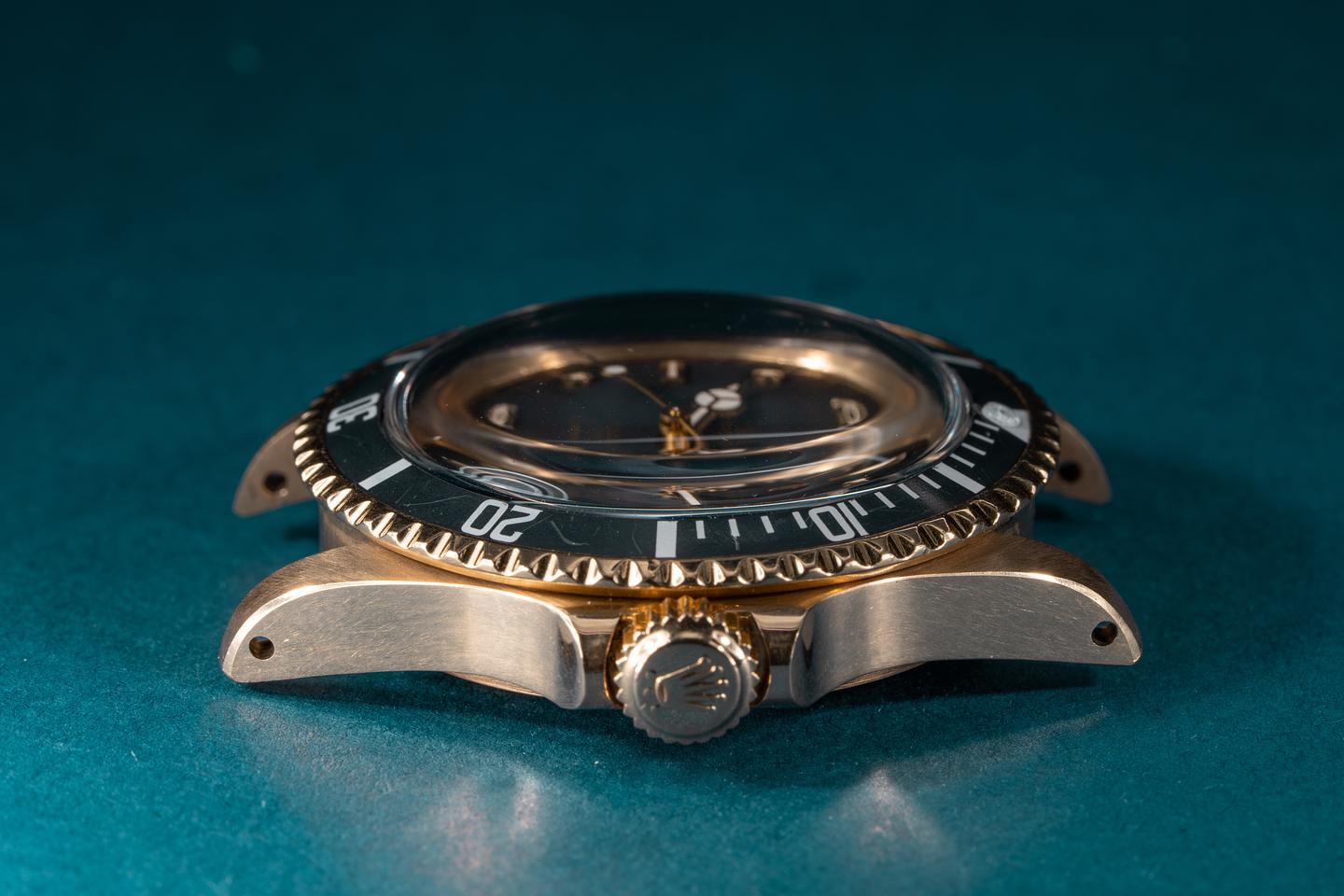 Case: The 18k yellow gold case has been polished in the past showing sharp prominent bevels and only light wear from use. The black bezel insert is fading to a satin charcoal grey tone and shows some light wear from use. The watch has been fired with a True Dome D19 crystal.