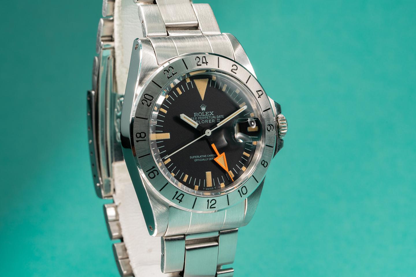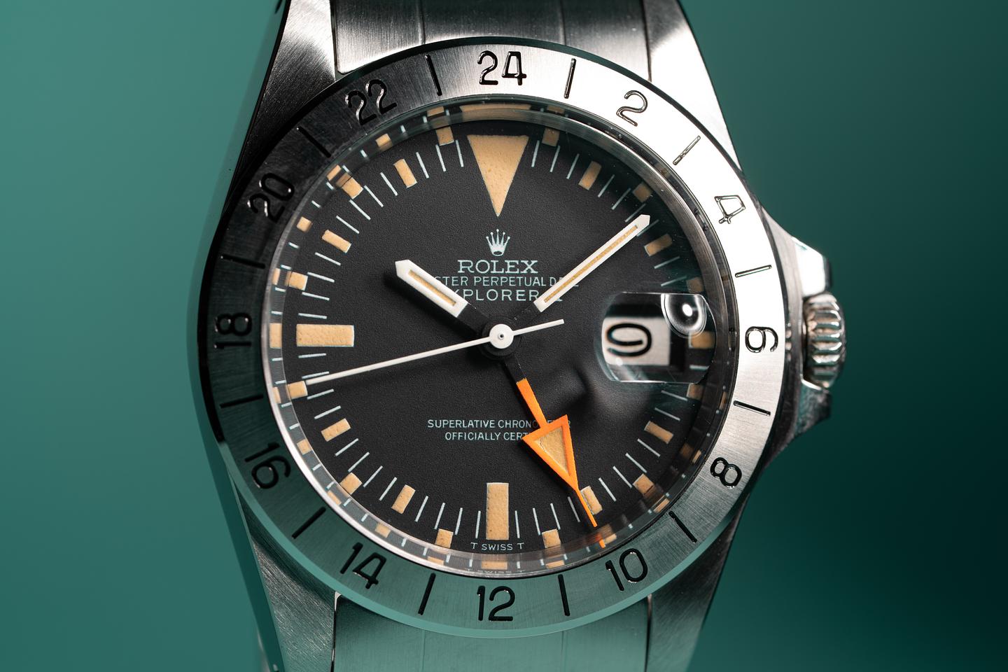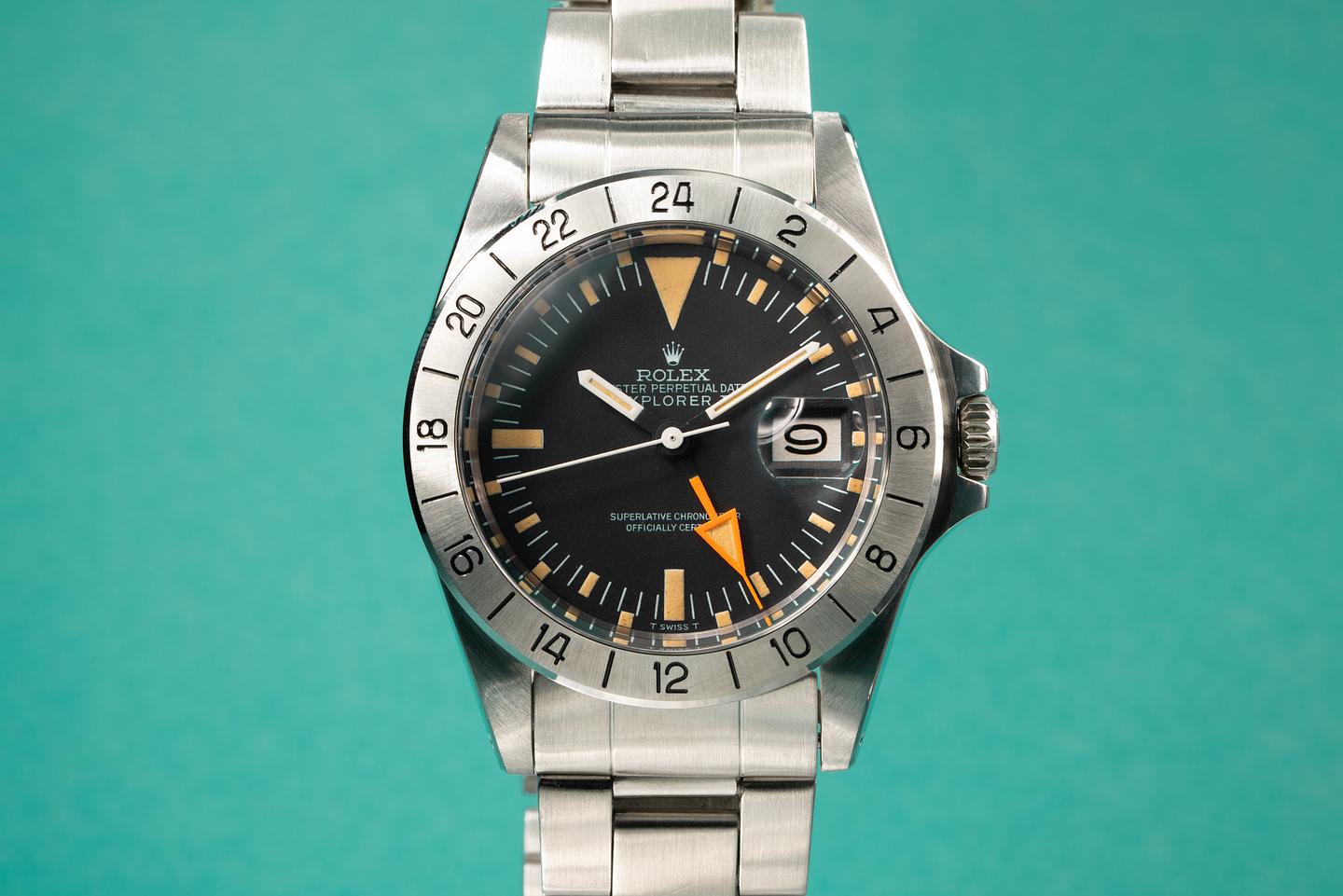 Notes: The lume on this early straight hand Explorer 2 has aged perfectly, while the orange 24 hour hand retains its brilliant factory hue.