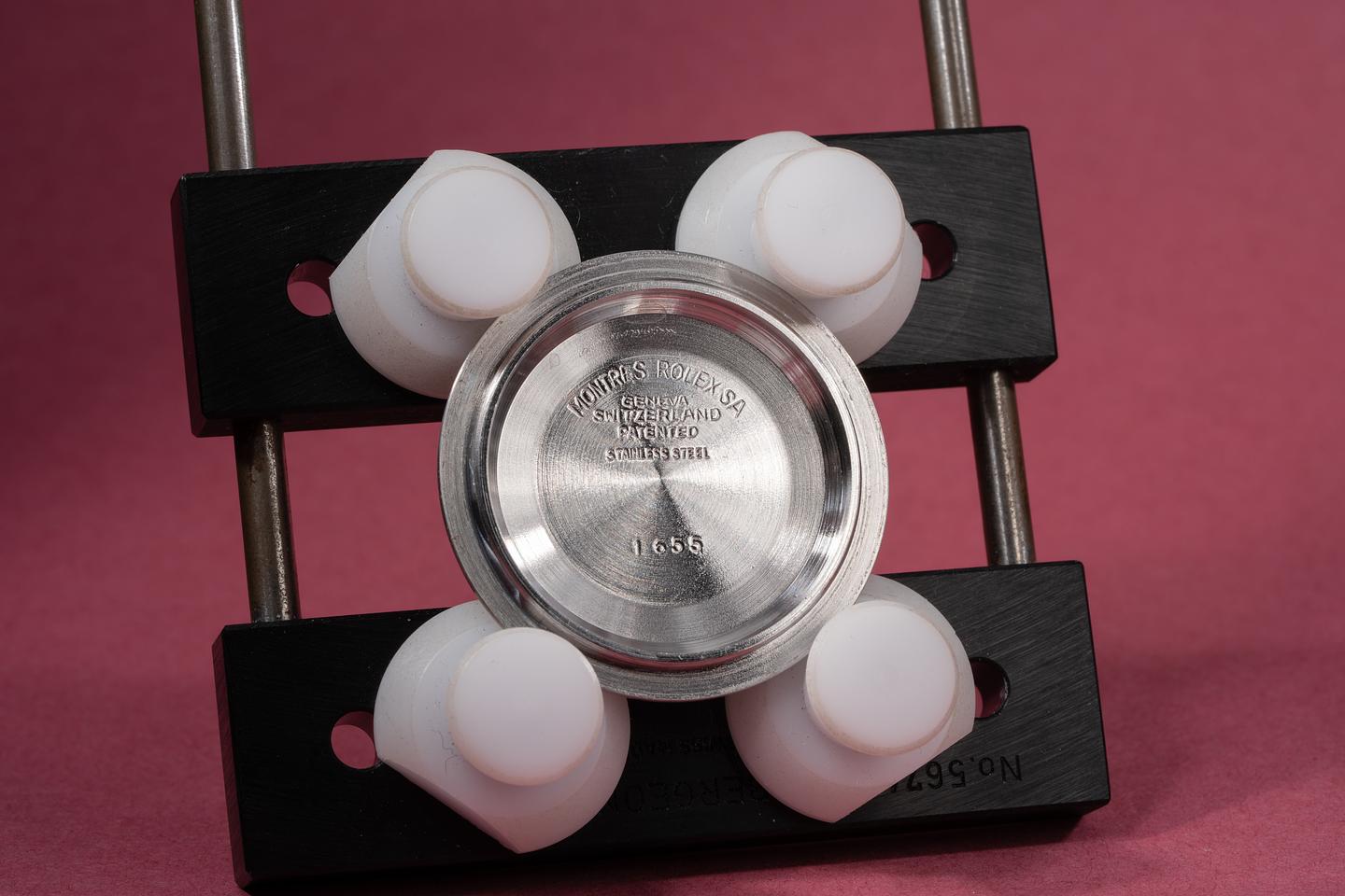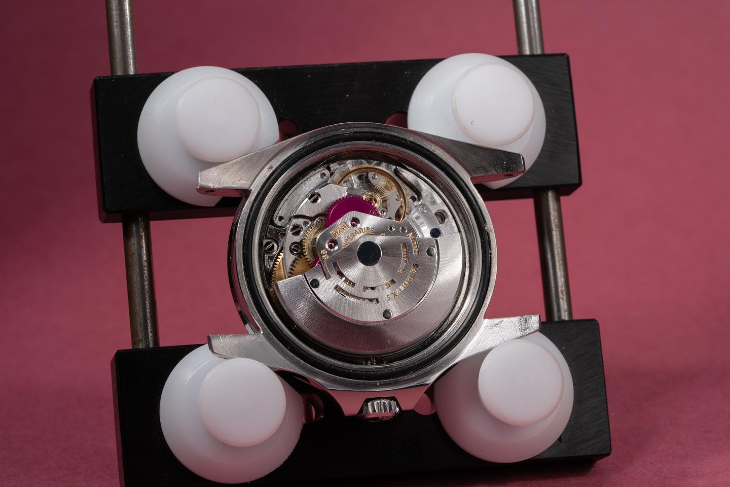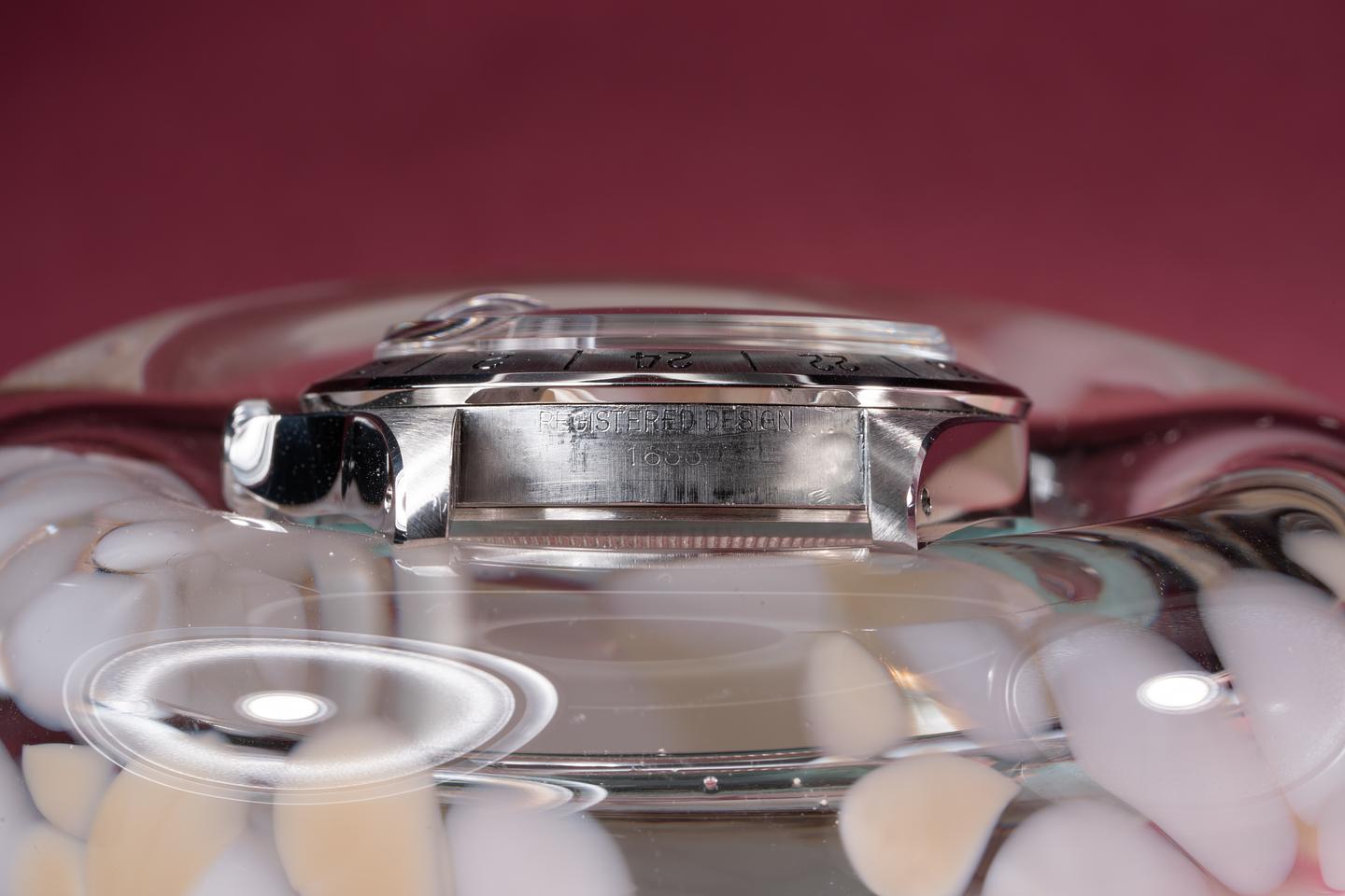 Case: The recently polished case is excellent showing sharp prominent bevels and only light wear from use. The stainless bezel is also in excellent condition showing a sharp well-defined sunburst finish. The serial numbers show excessive wear and are no longer able to be made out.