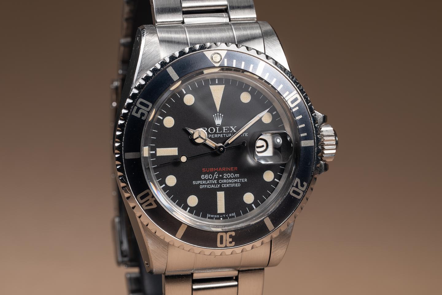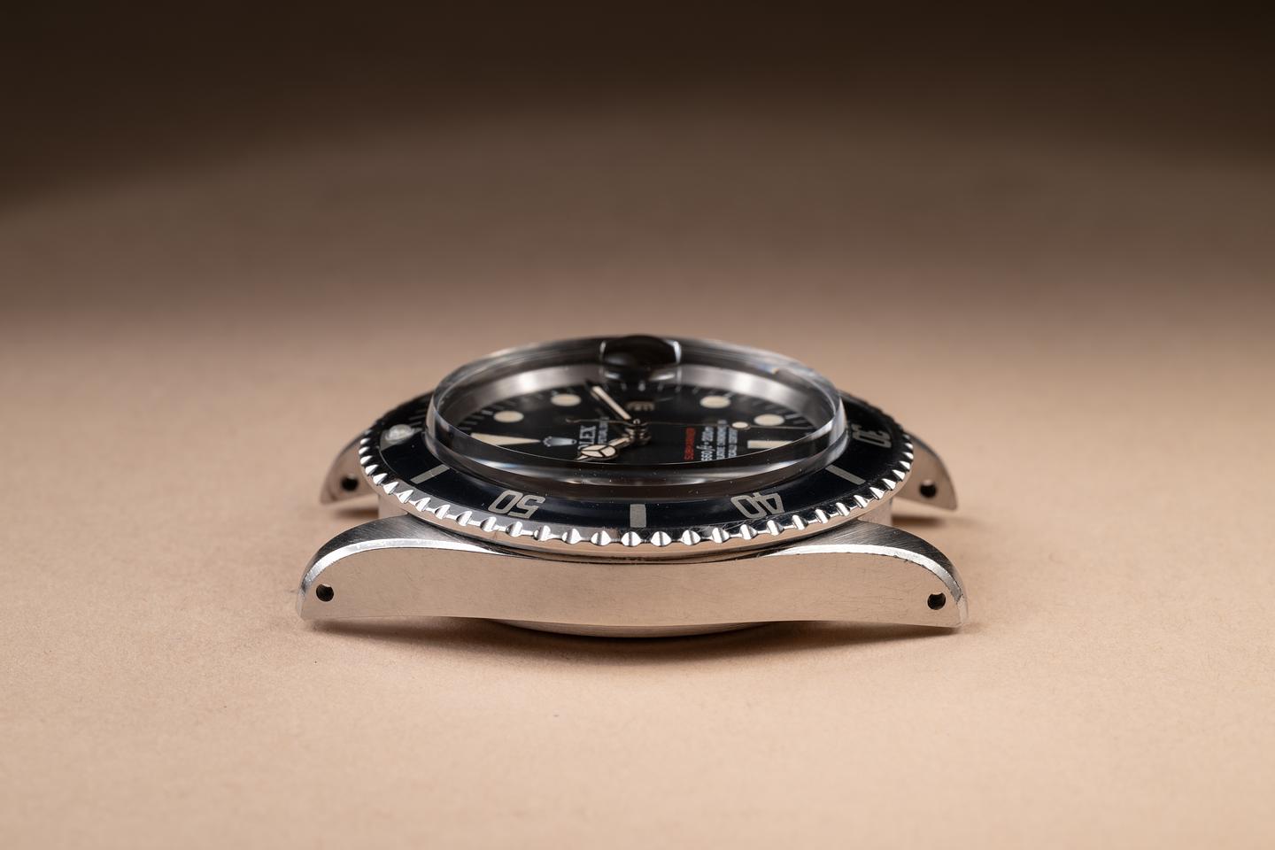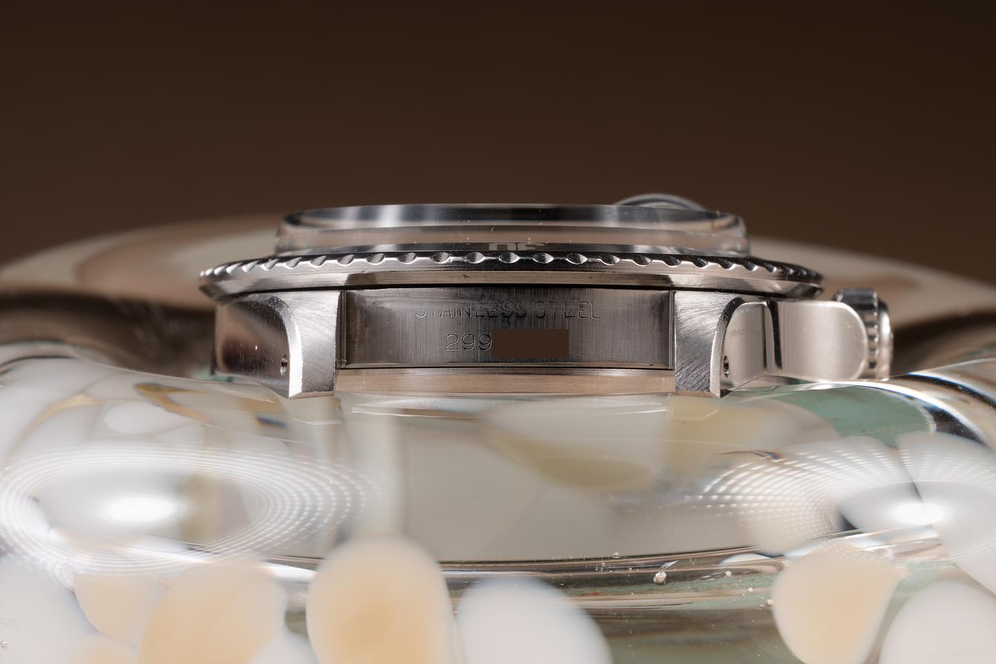Case: The recently polished case is excellent, showing sharp, prominent bevels and only very light wear. The super fat font "kissing 40" bezel insert is also in excellent condition and has aged to a navy blue hue, showing some light wear from use.
