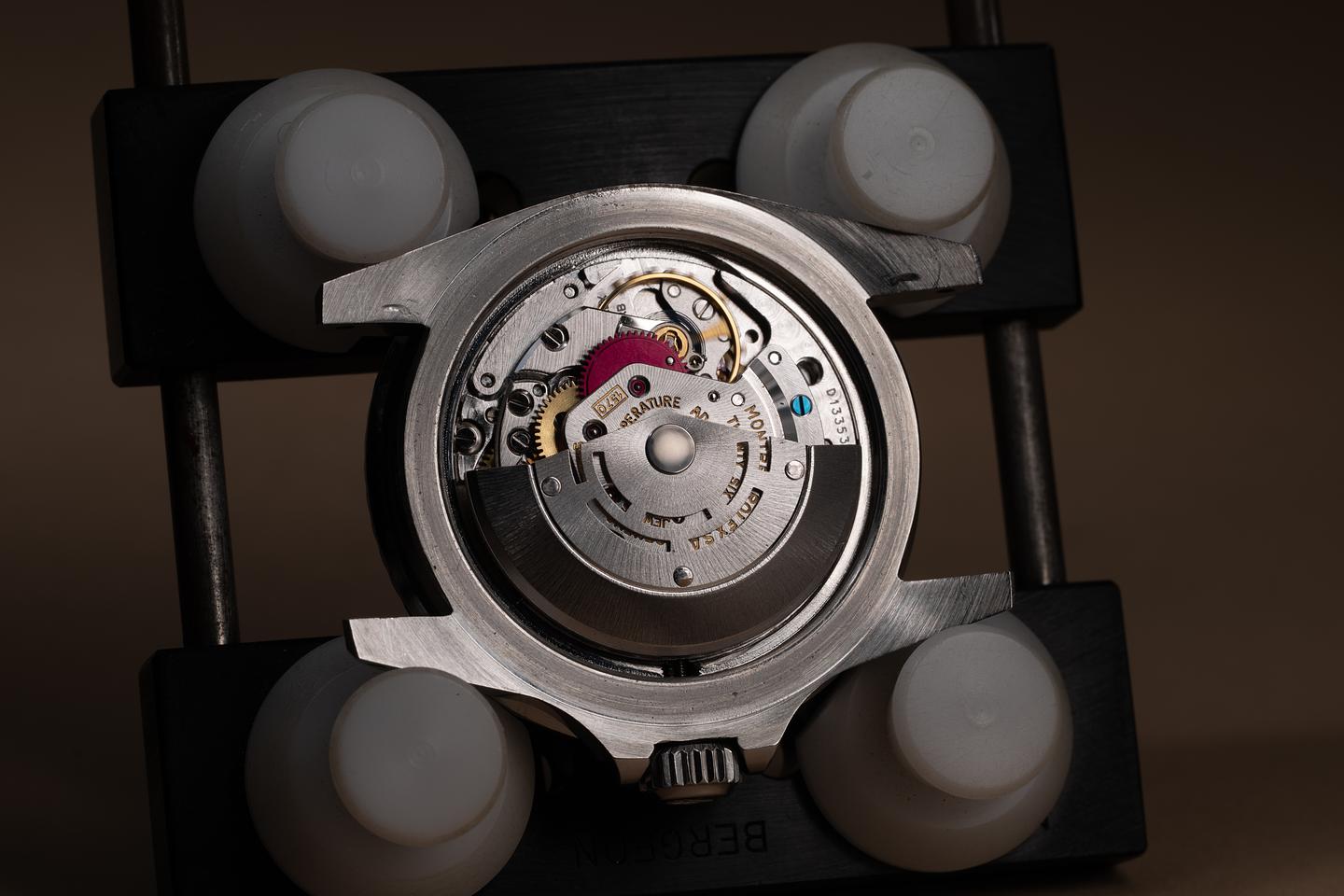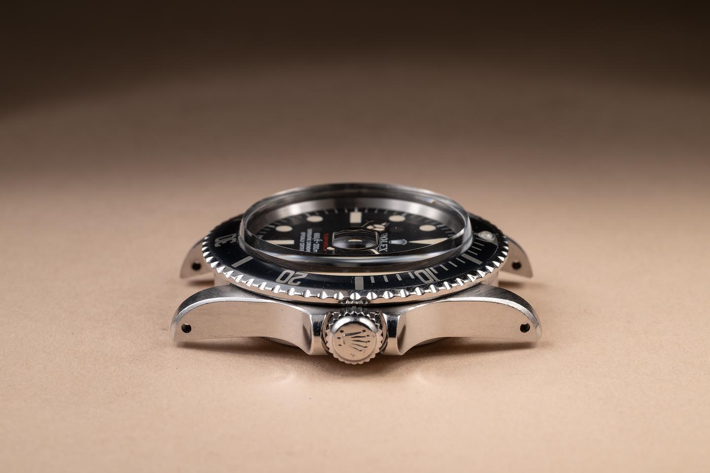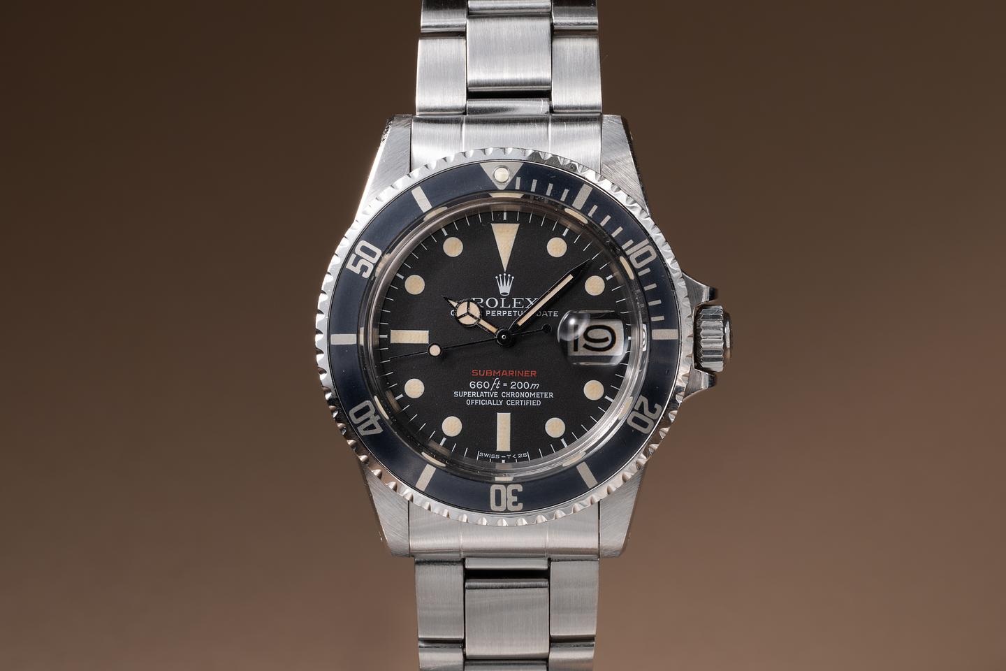 Case: The recently polished case is excellent, showing sharp, prominent bevels and only very light wear. The super fat font "kissing 40" bezel insert is also in excellent condition and has aged to a navy blue hue, showing some light wear from use.