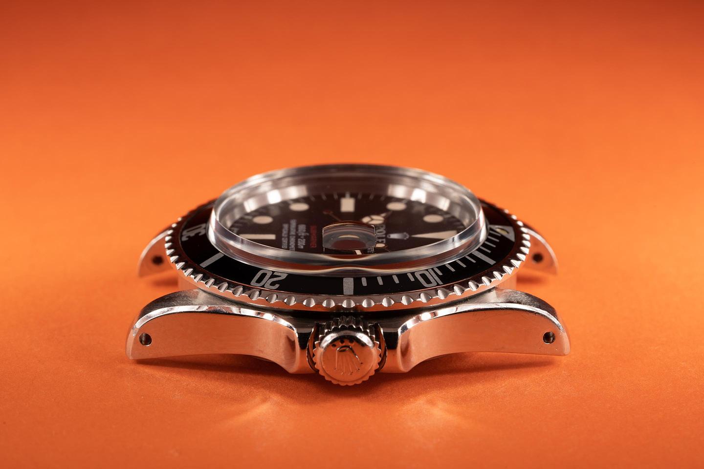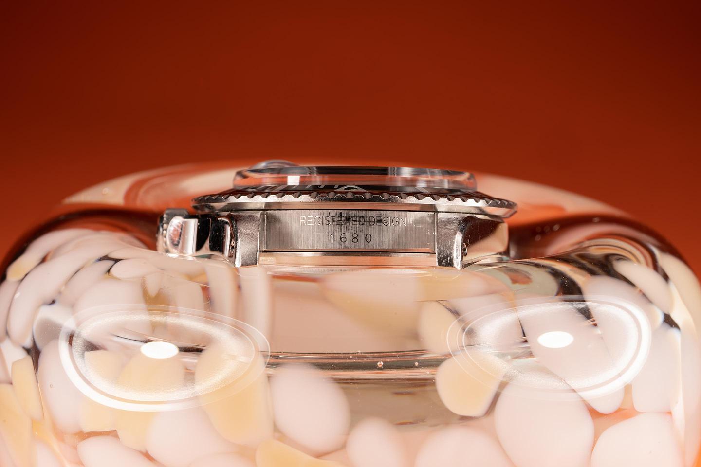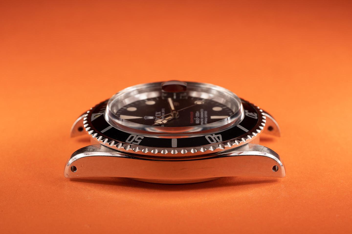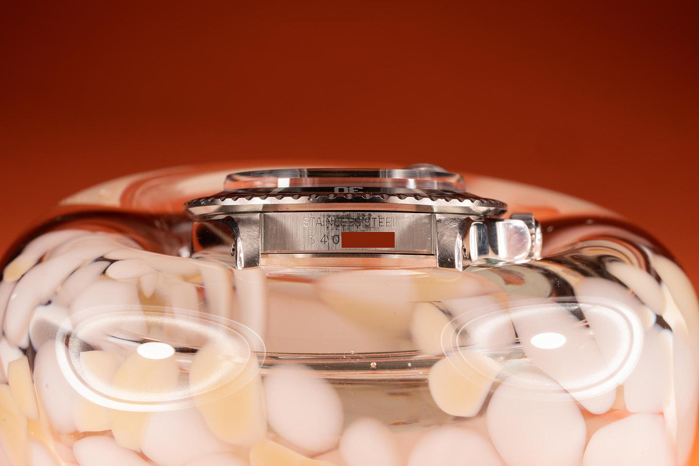 Case: The thick case is excellent showing wide prominent bevels and only light wear from use. The black fat font "Kissing 40" bezel insert is also in excellent condition showing only light wear.