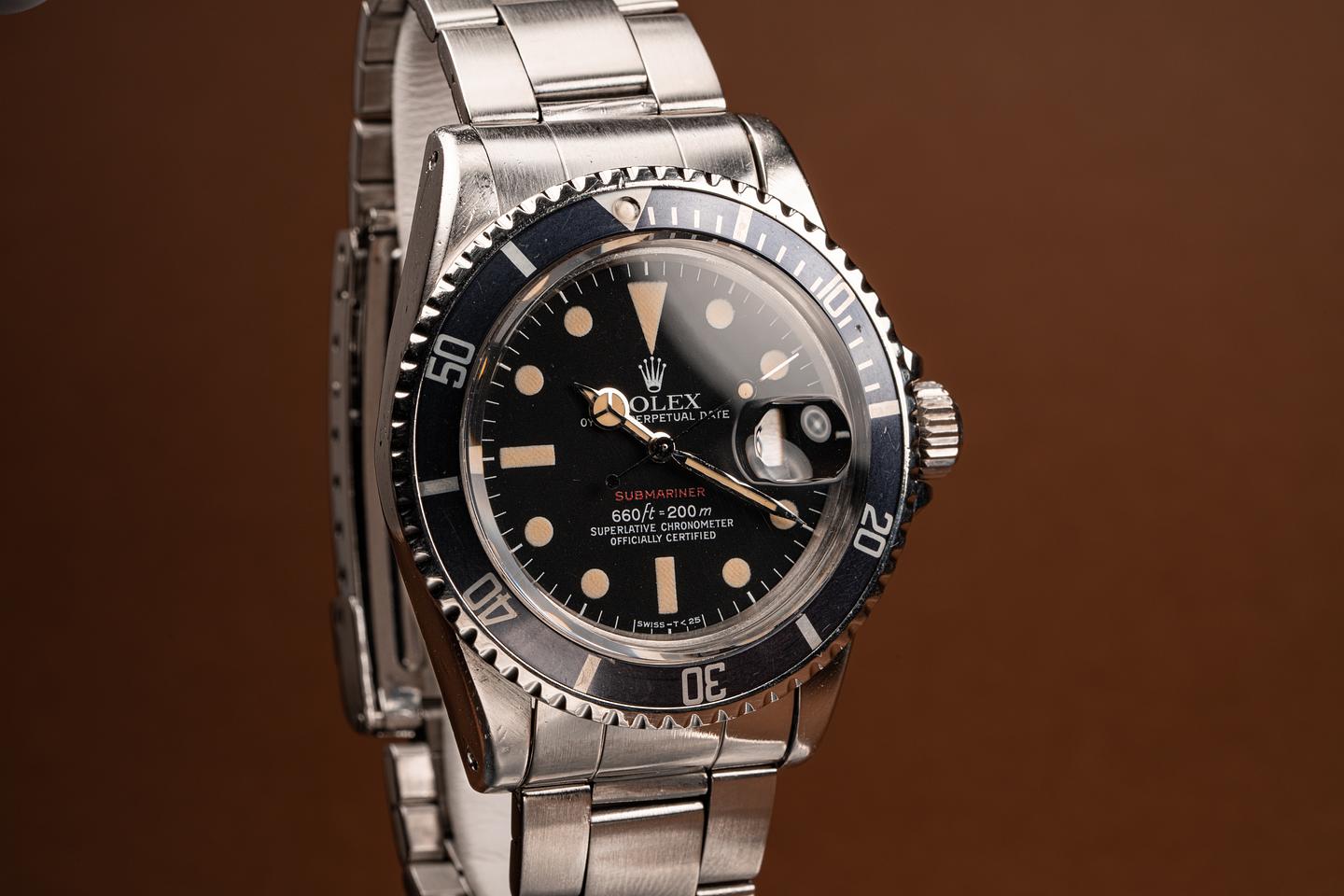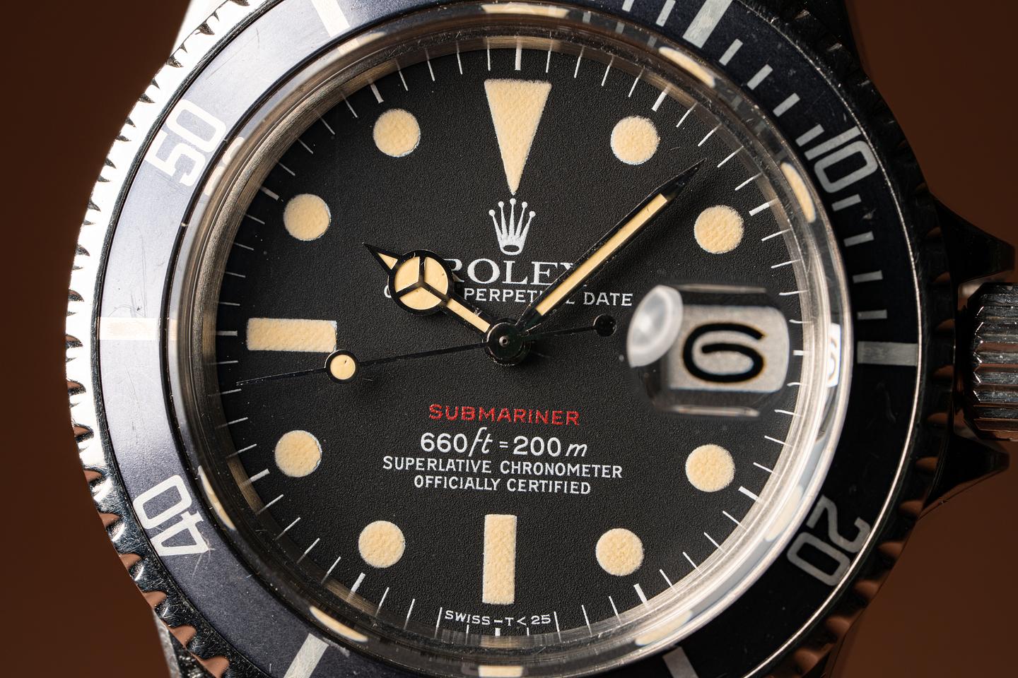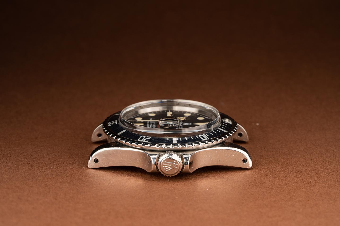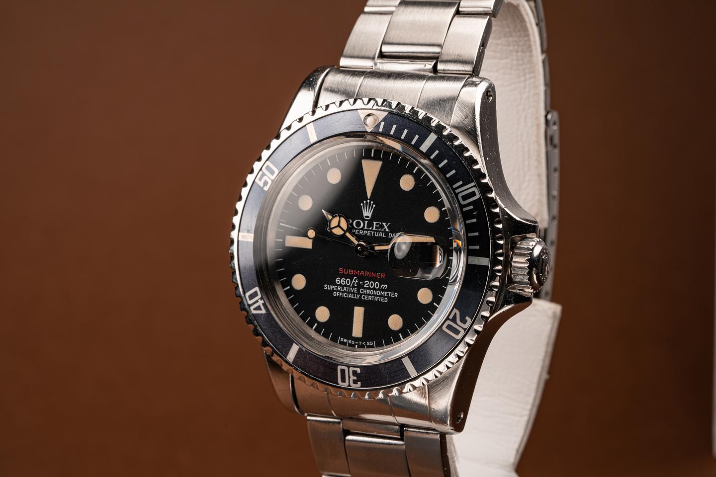 The Mark 6 dial variation is the last of the Red Submariner Dials. This particular version has a thick case with the original bevels still visible. The folded link bracelet has 11 links and light wear from use. The fat font bezel insert has faded to a deep blue grey hue which gives the watch a very distinctive look and feel. The dial is bright and the luminous material has aged to a bright creamy yellow patina. The hands have been relumed to match the patina of the dial. The vibe on this watch just makes you feel good.