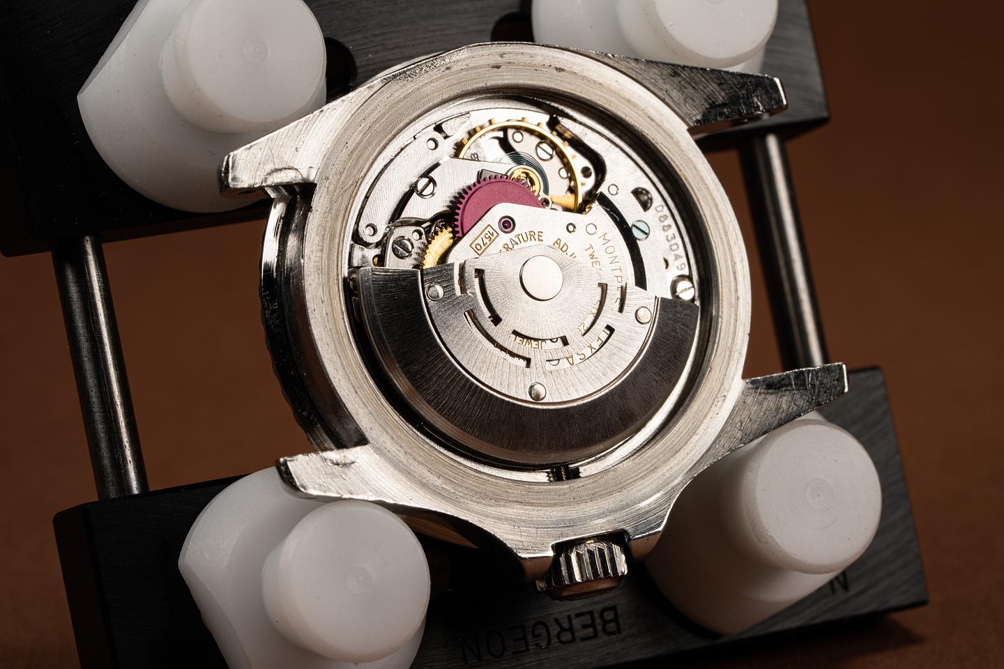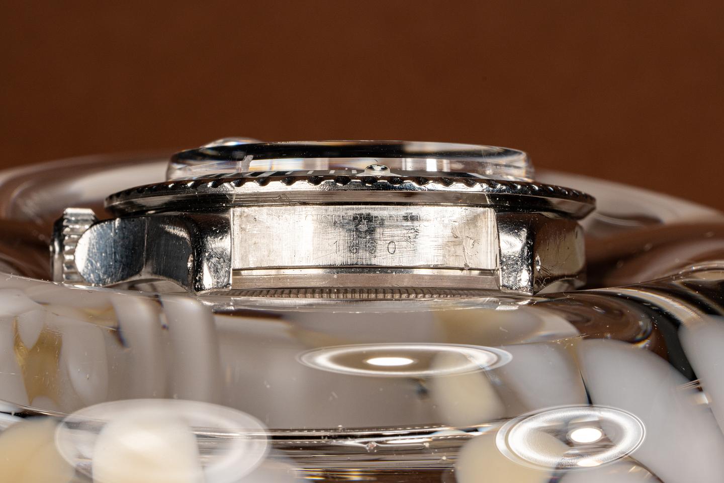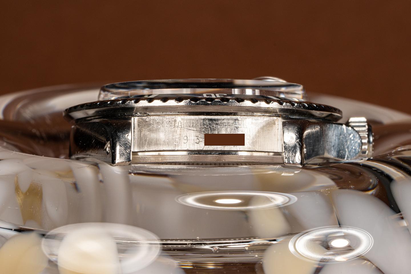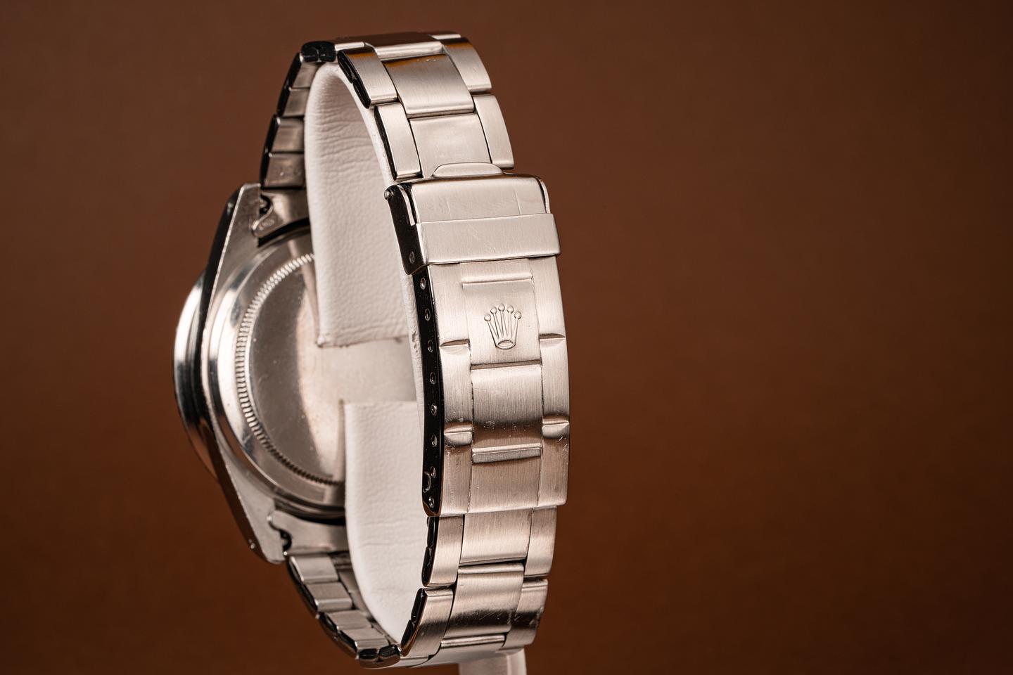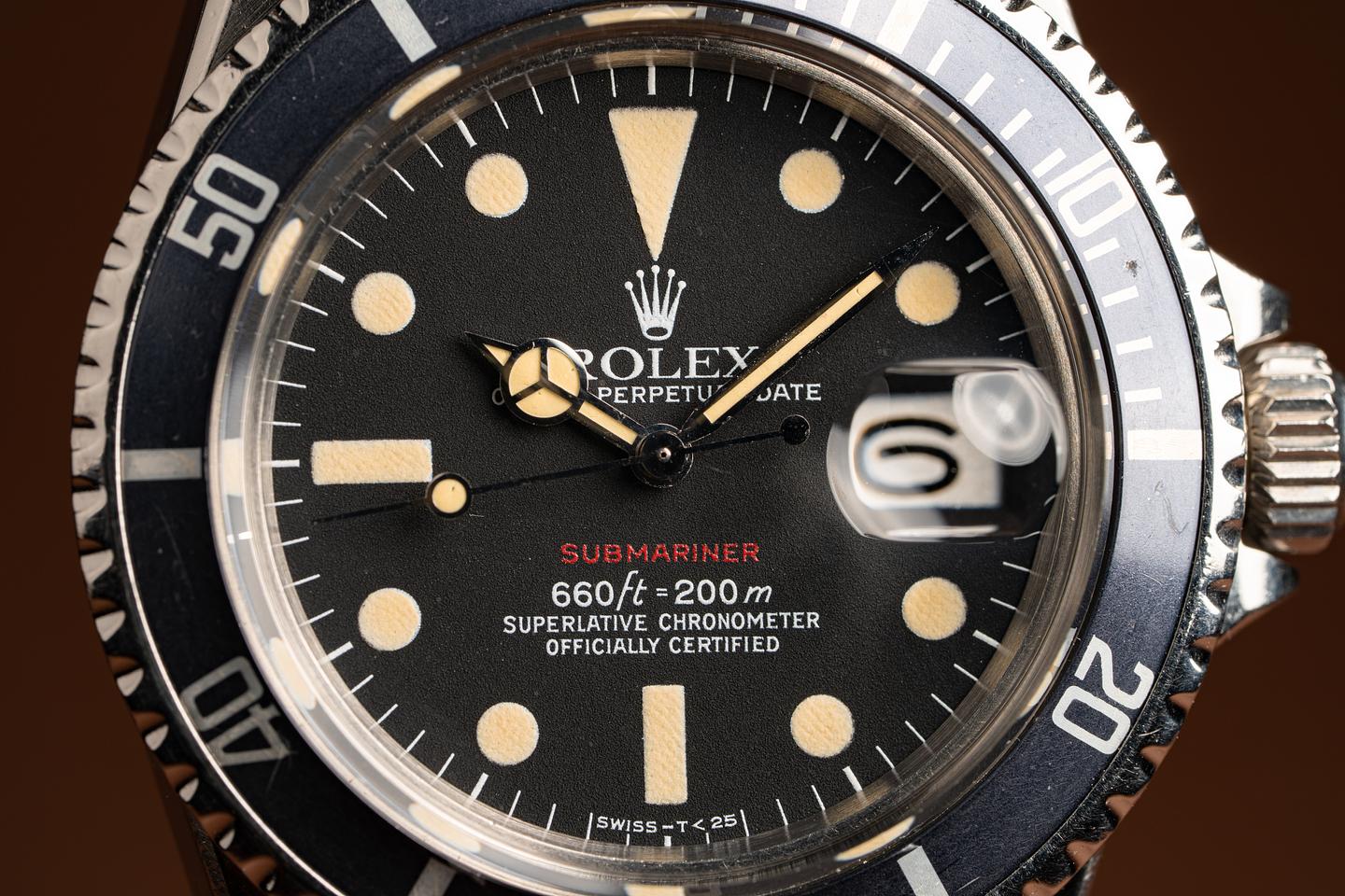 The Mark 6 dial variation is the last of the Red Submariner Dials. This particular version has a thick case with the original bevels still visible. The folded link bracelet has 11 links and light wear from use. The fat font bezel insert has faded to a deep blue grey hue which gives the watch a very distinctive look and feel. The dial is bright and the luminous material has aged to a bright creamy yellow patina. The hands have been relumed to match the patina of the dial. The vibe on this watch just makes you feel good.