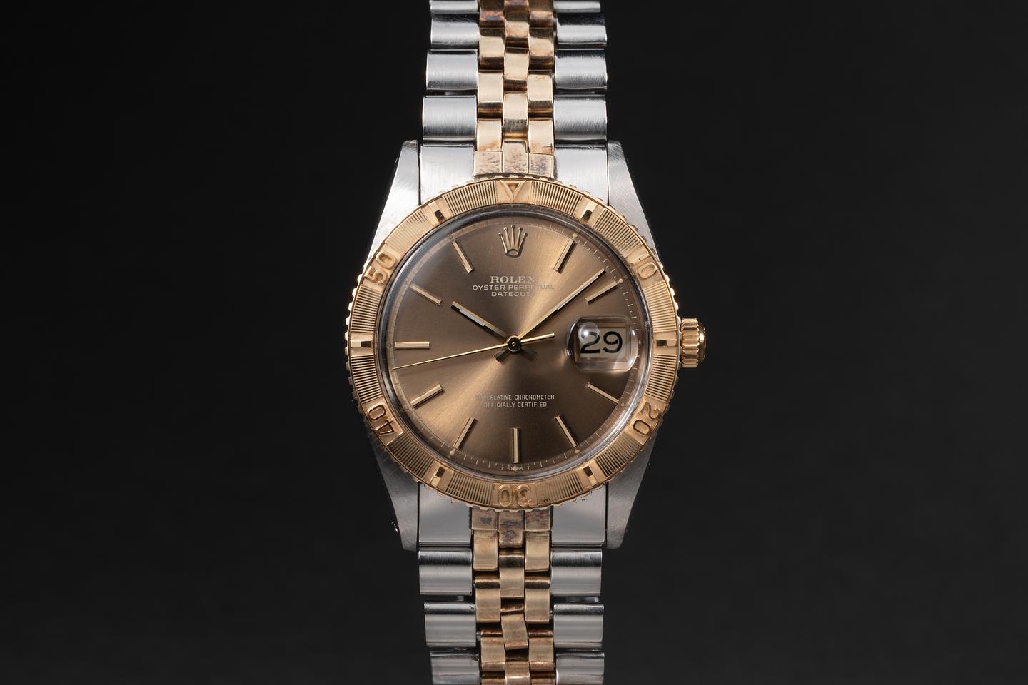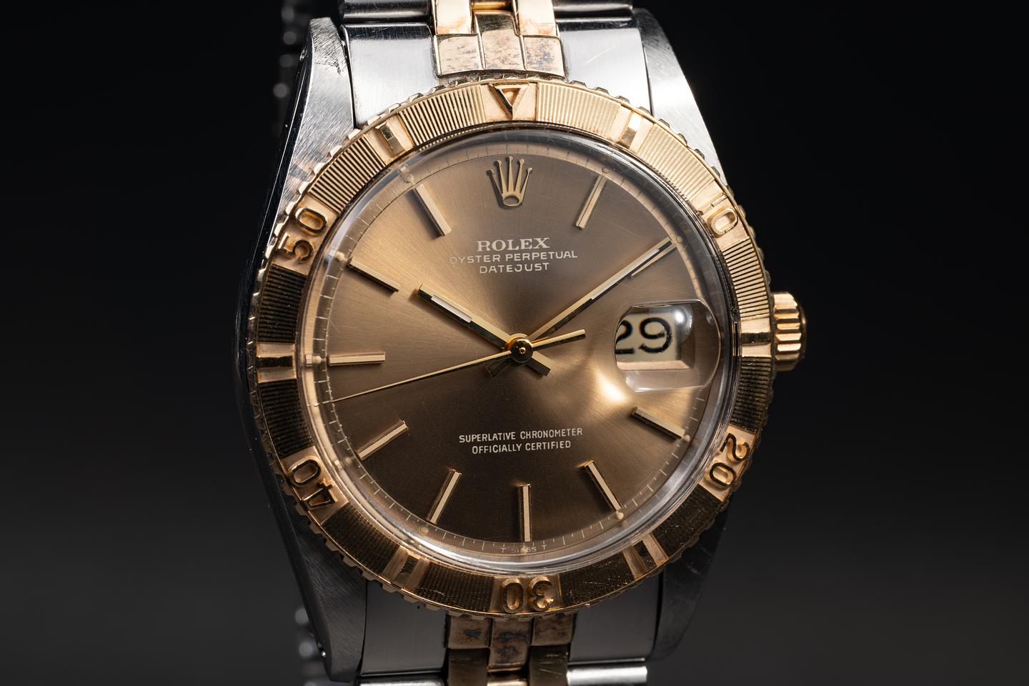 Case: The sharp 36mm service case appears to be unpolished, showing some light wear from use. The 18K yellow gold turn-o-graph is excellent, showing only light wear from use.