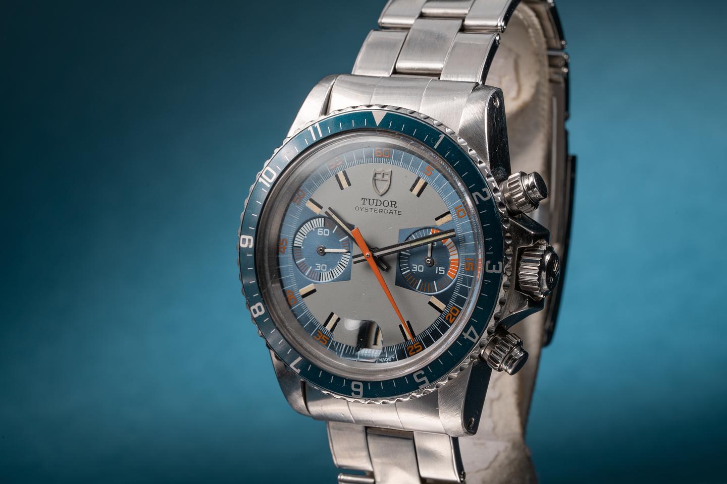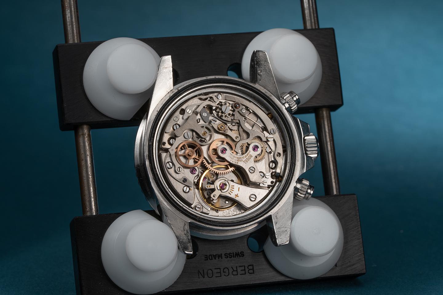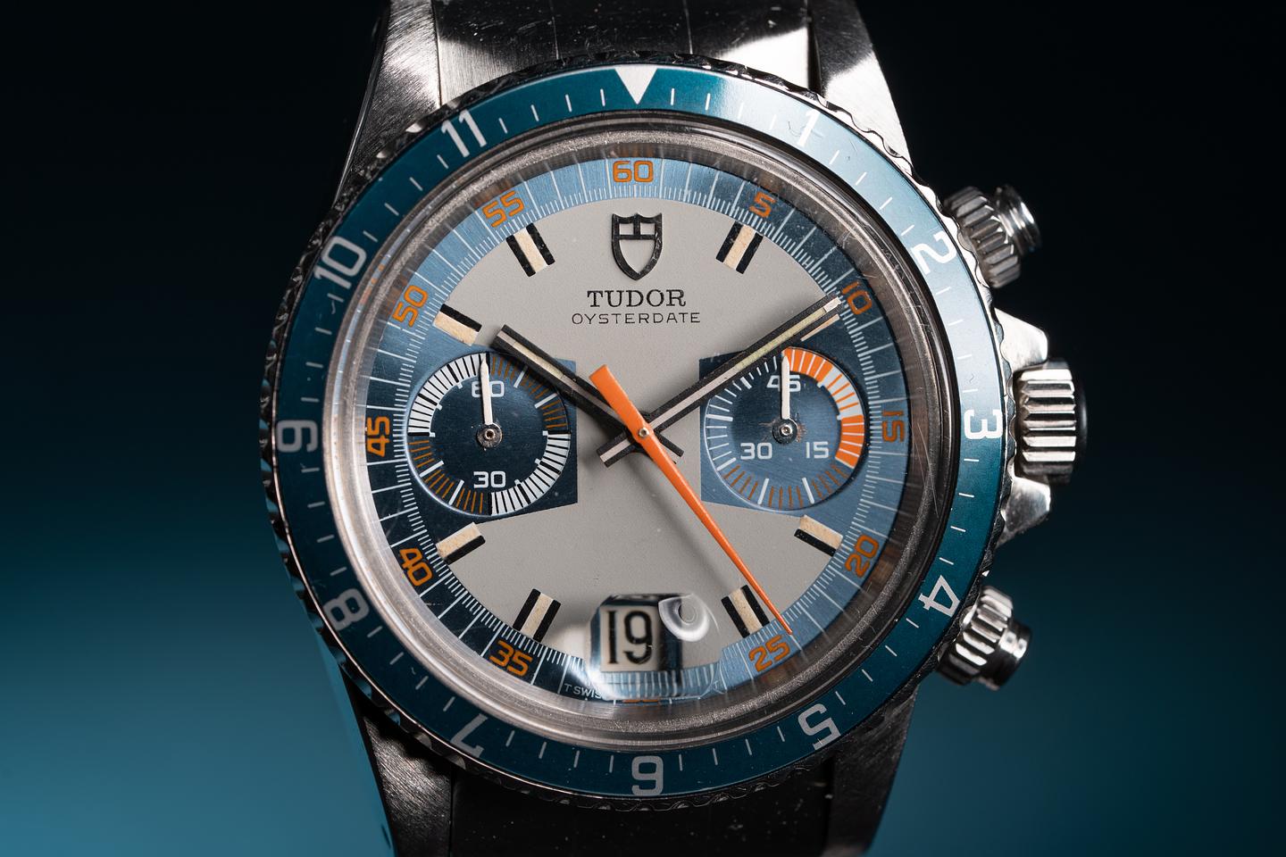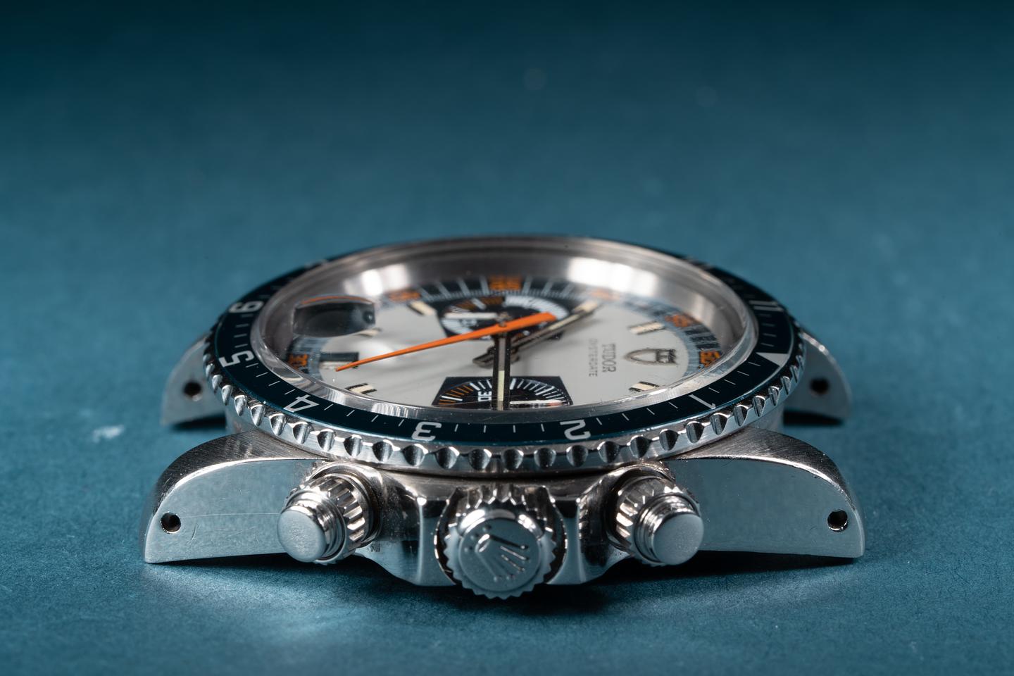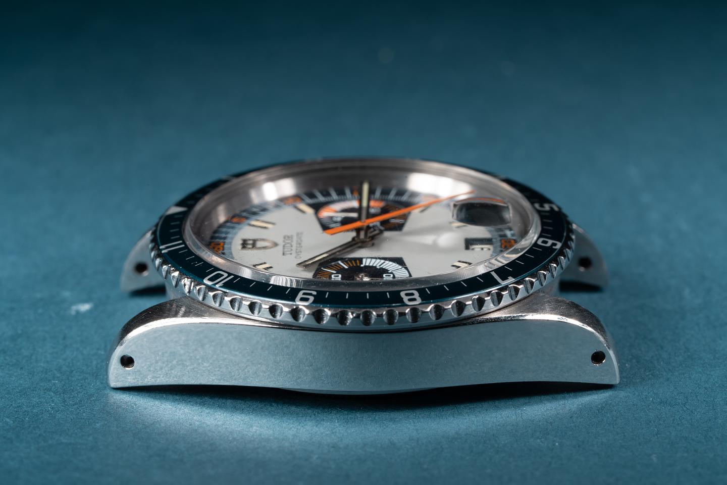 Dial: The matte grey and blue dial is excellent and shows light wear overall. There are some tooling marks present around the centerpost of the right sub-dial hand. The lume has aged to a creamy hue and the hands have aged to a light sage hue.