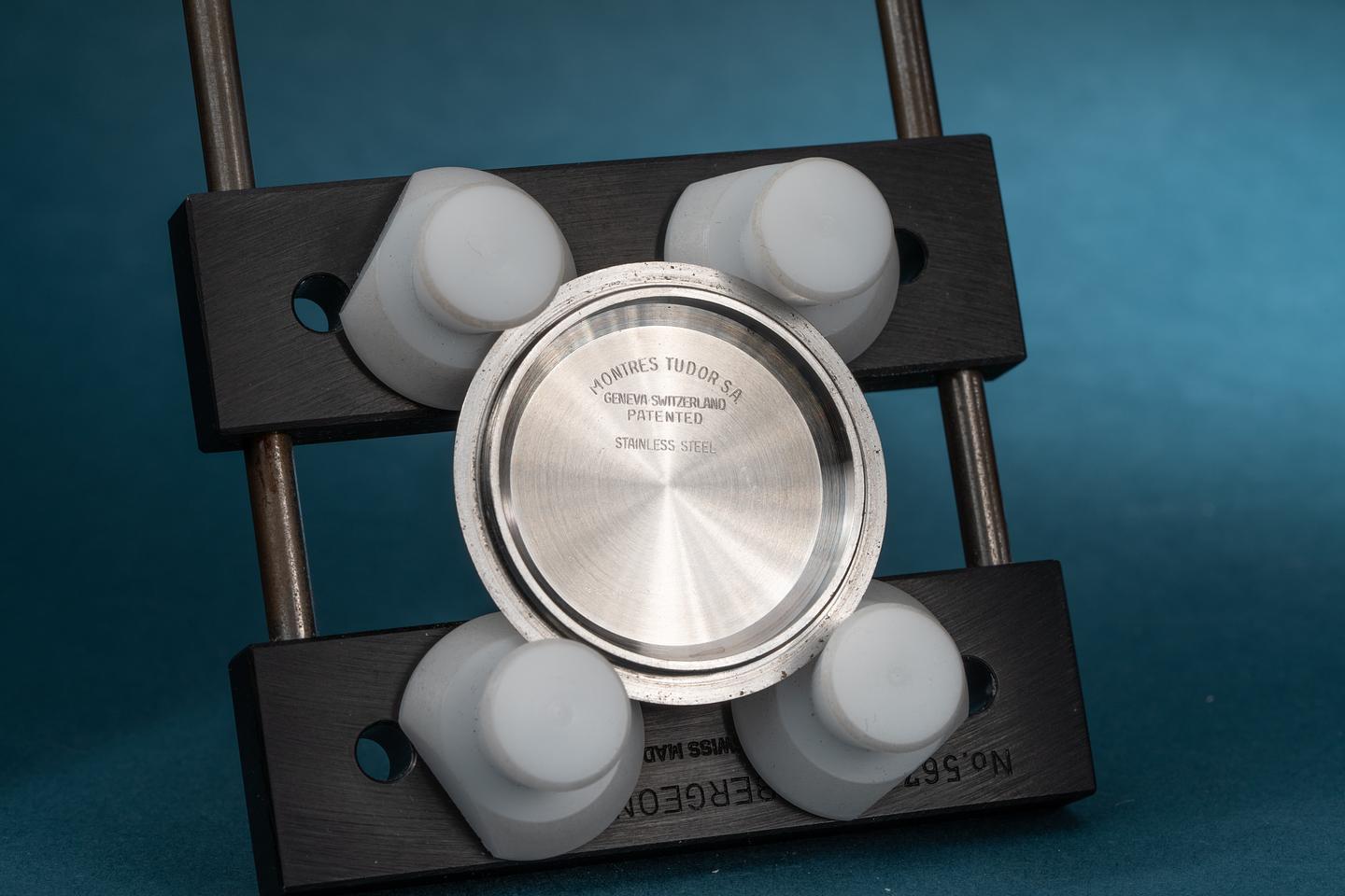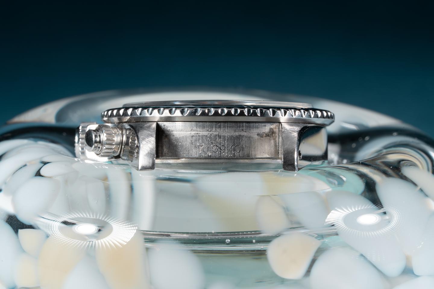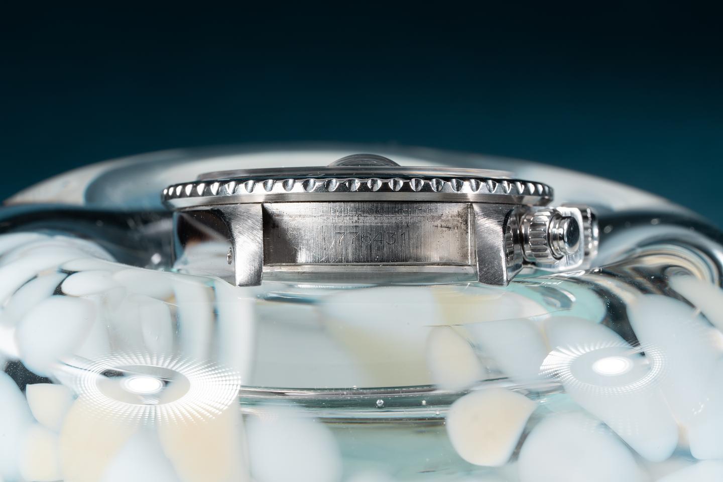 Case: The thick and even case has been lightly polished in the past showing sharp bevels and some light wear from use. The bezel has shifted in hue to a deep glossy teal and shows only very light wear.