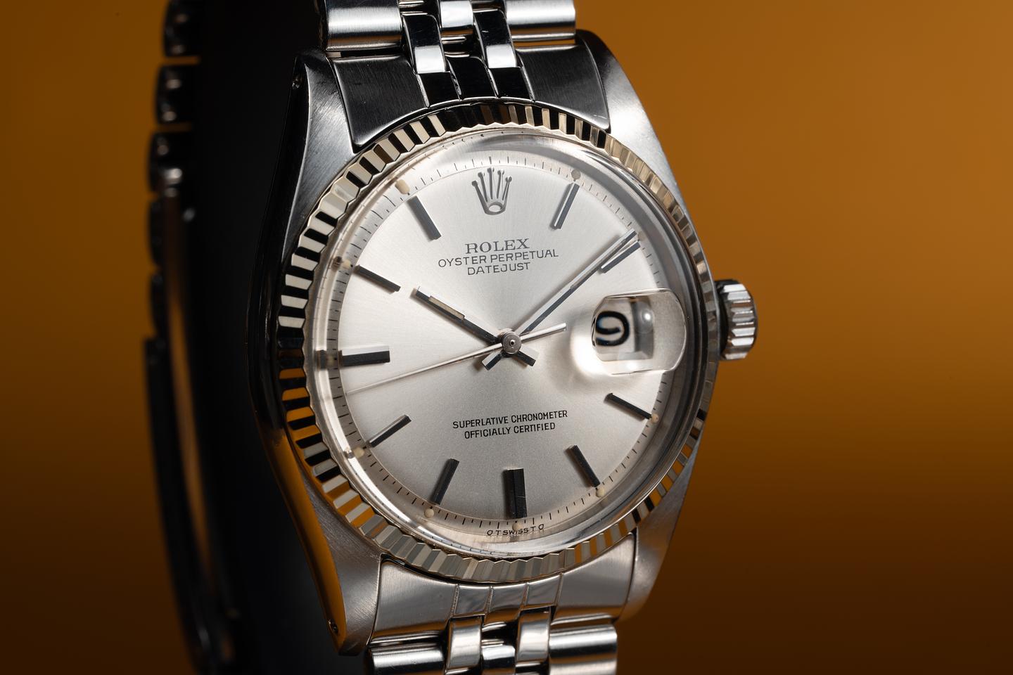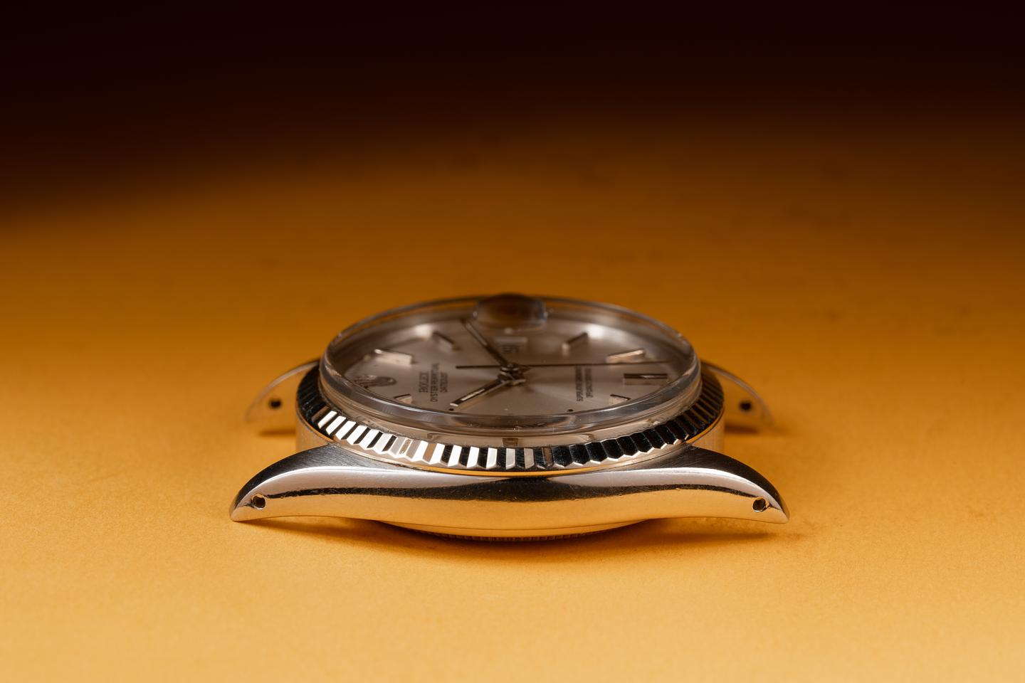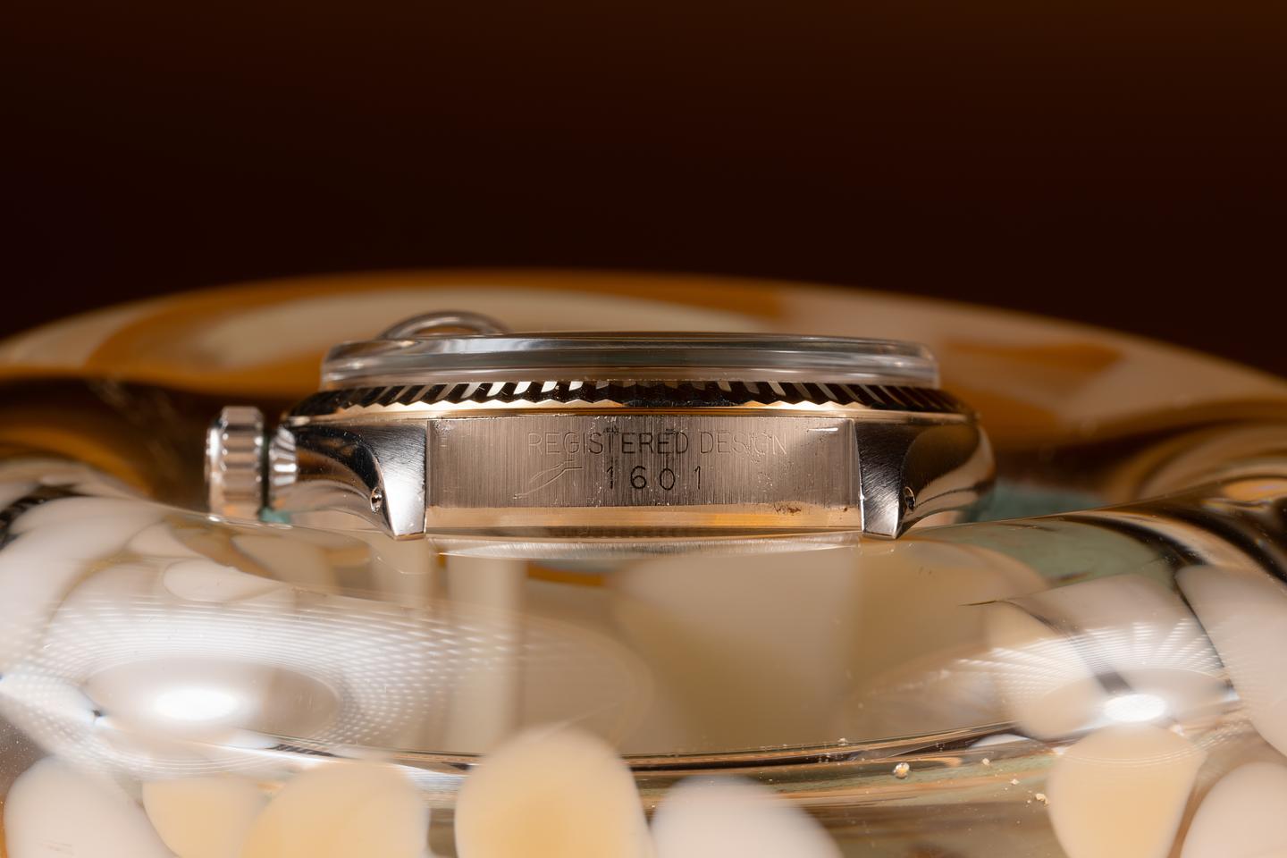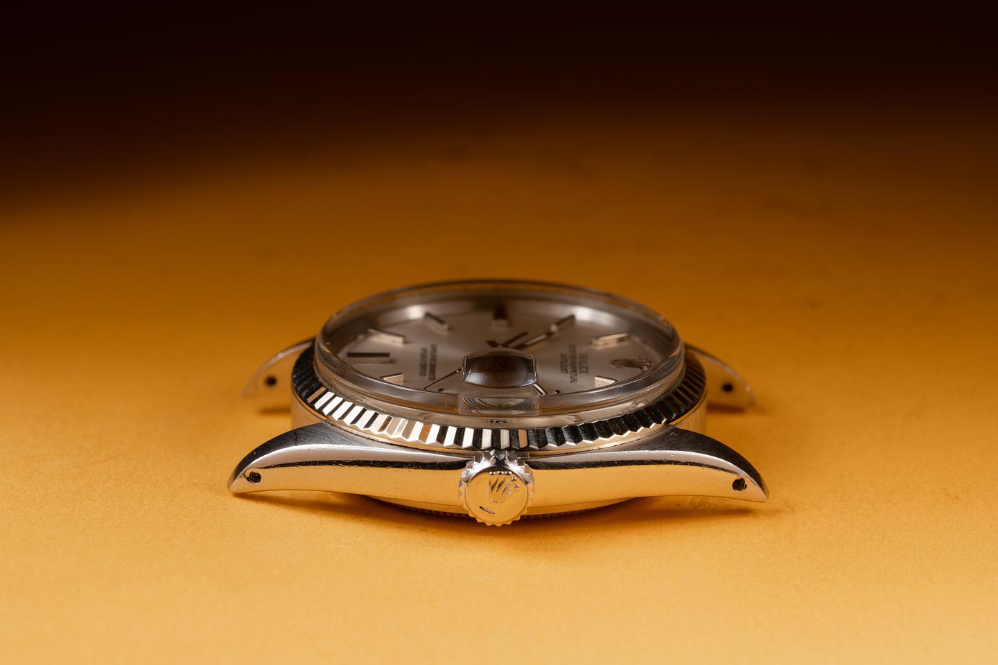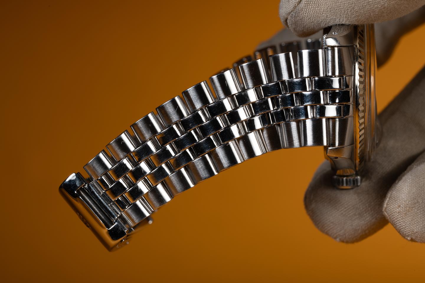 Case: The 36mm case is excellent showing light wear from use. The 18K white gold fluted bezel is also in excellent condition showing light wear from use.