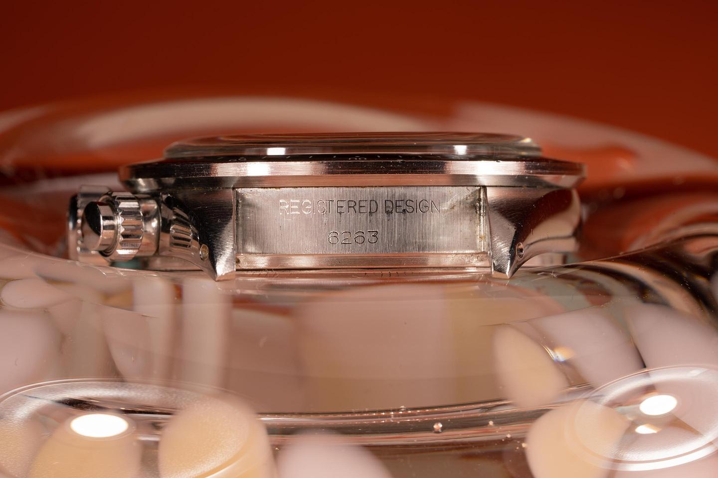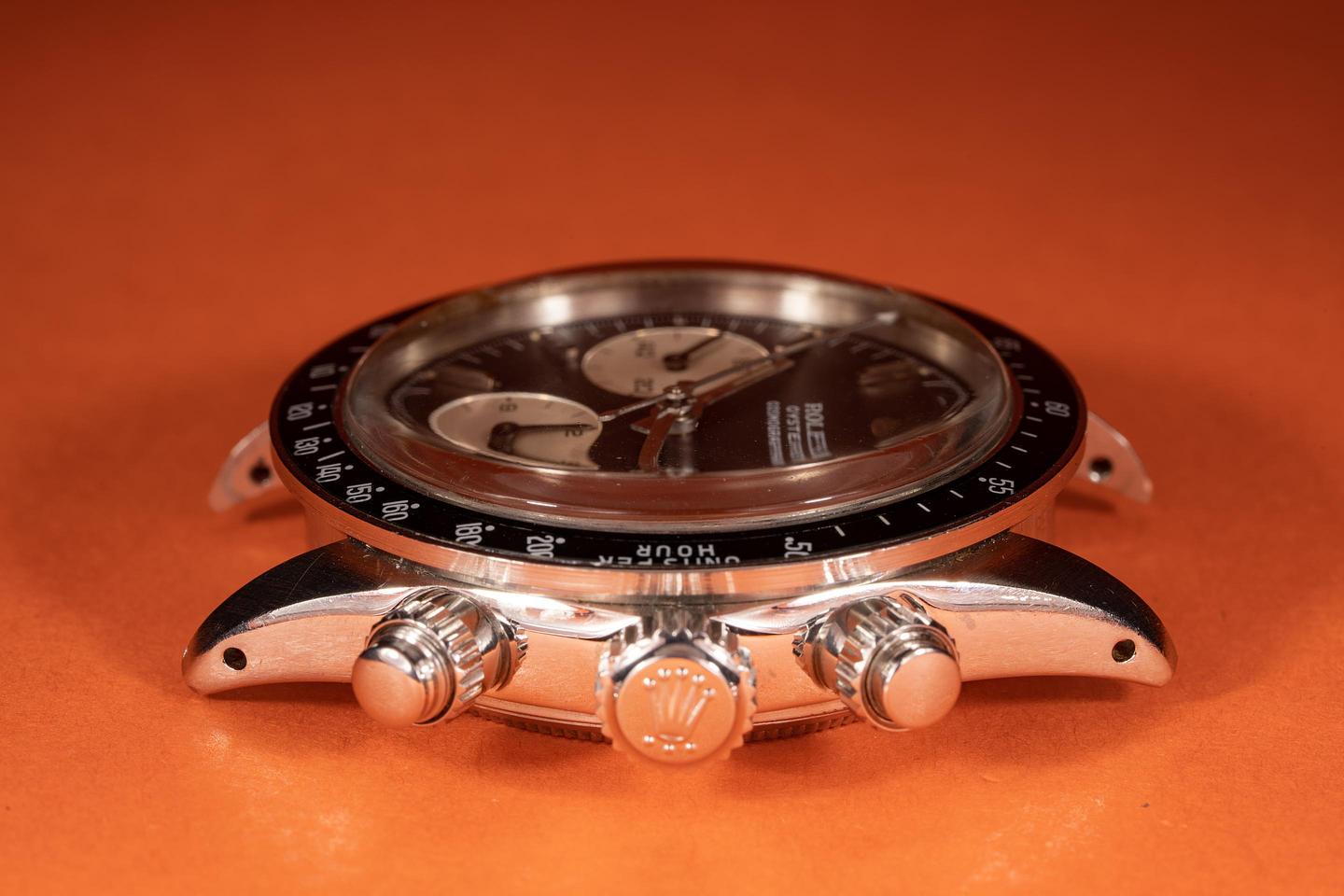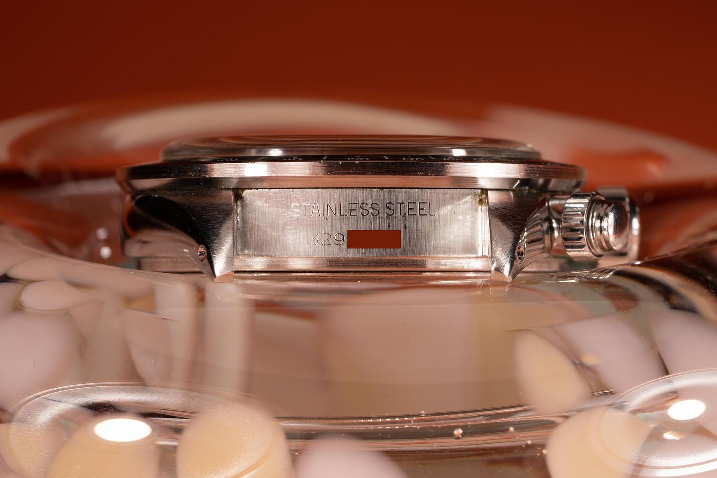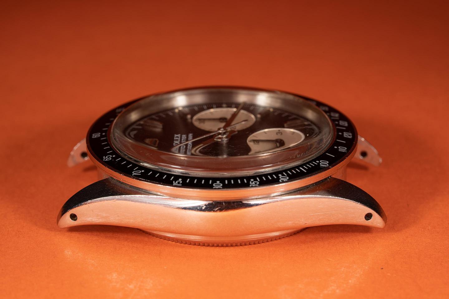 Dial: The matte black sigma dial is excellent showing little if any wear for its age. Most of the lume plots are missing some or all of their luminous mass which is common for Daytonas of this era. The remaining lume has aged to a warm creamy hue and the hands have aged to a dark sage hue. All lume glows brightly when exposed to UV and falls off rapidly at the same rate which is correct for this series of watch.