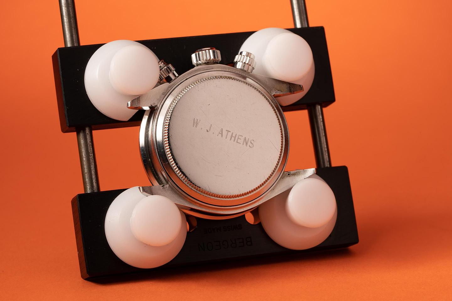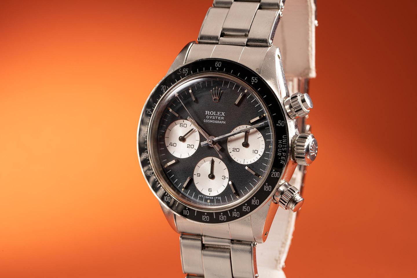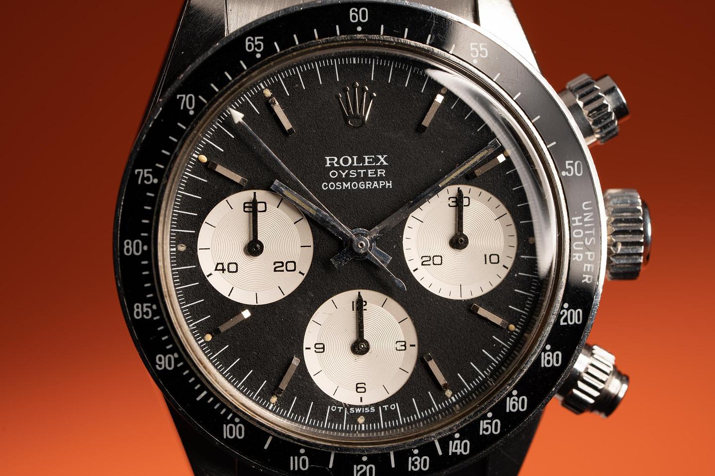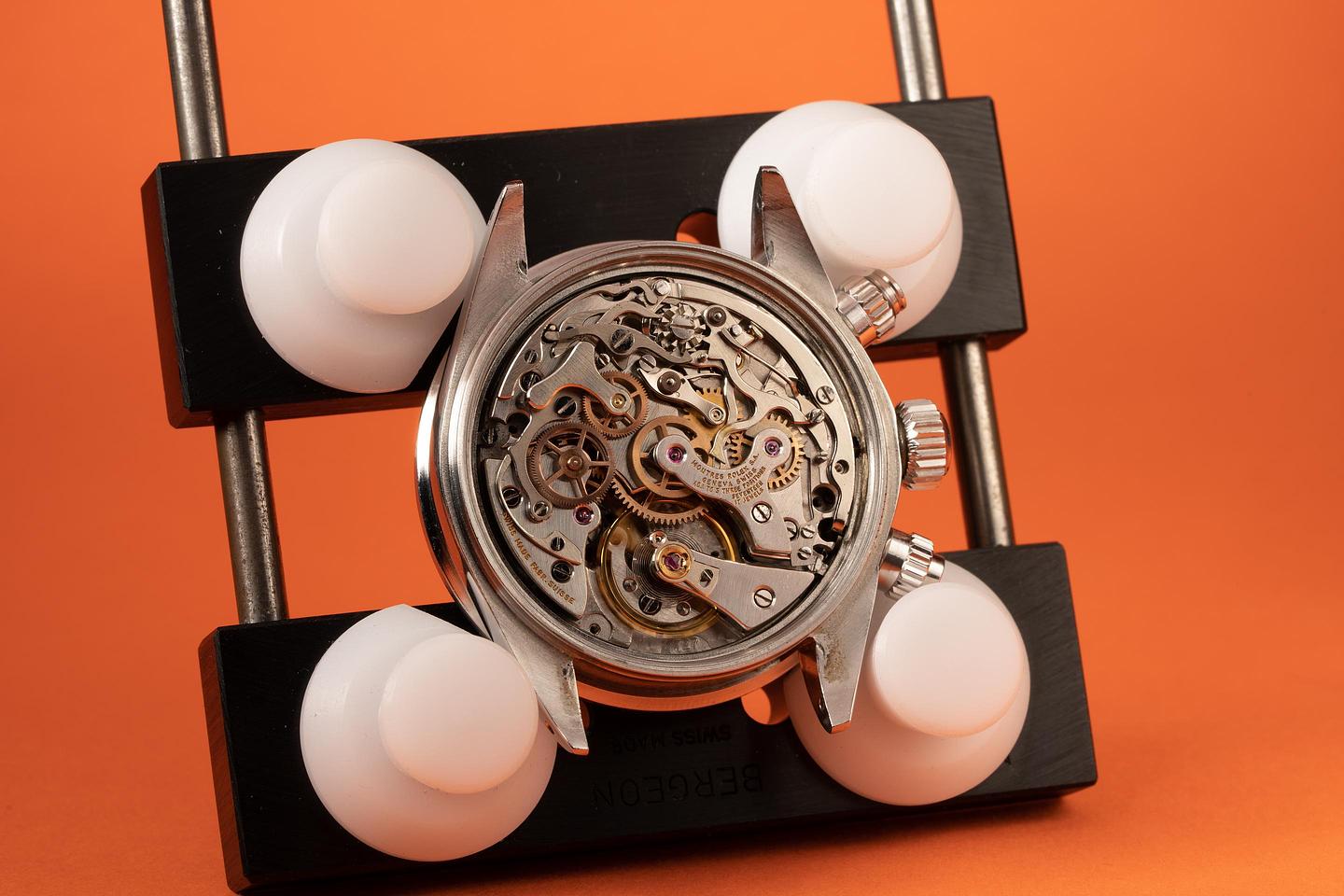 Dial: The matte black sigma dial is excellent showing little if any wear for its age. Most of the lume plots are missing some or all of their luminous mass which is common for Daytonas of this era. The remaining lume has aged to a warm creamy hue and the hands have aged to a dark sage hue. All lume glows brightly when exposed to UV and falls off rapidly at the same rate which is correct for this series of watch.