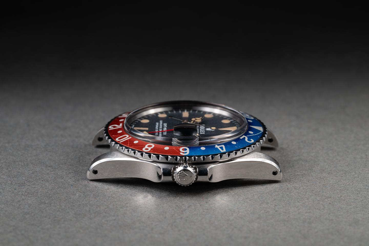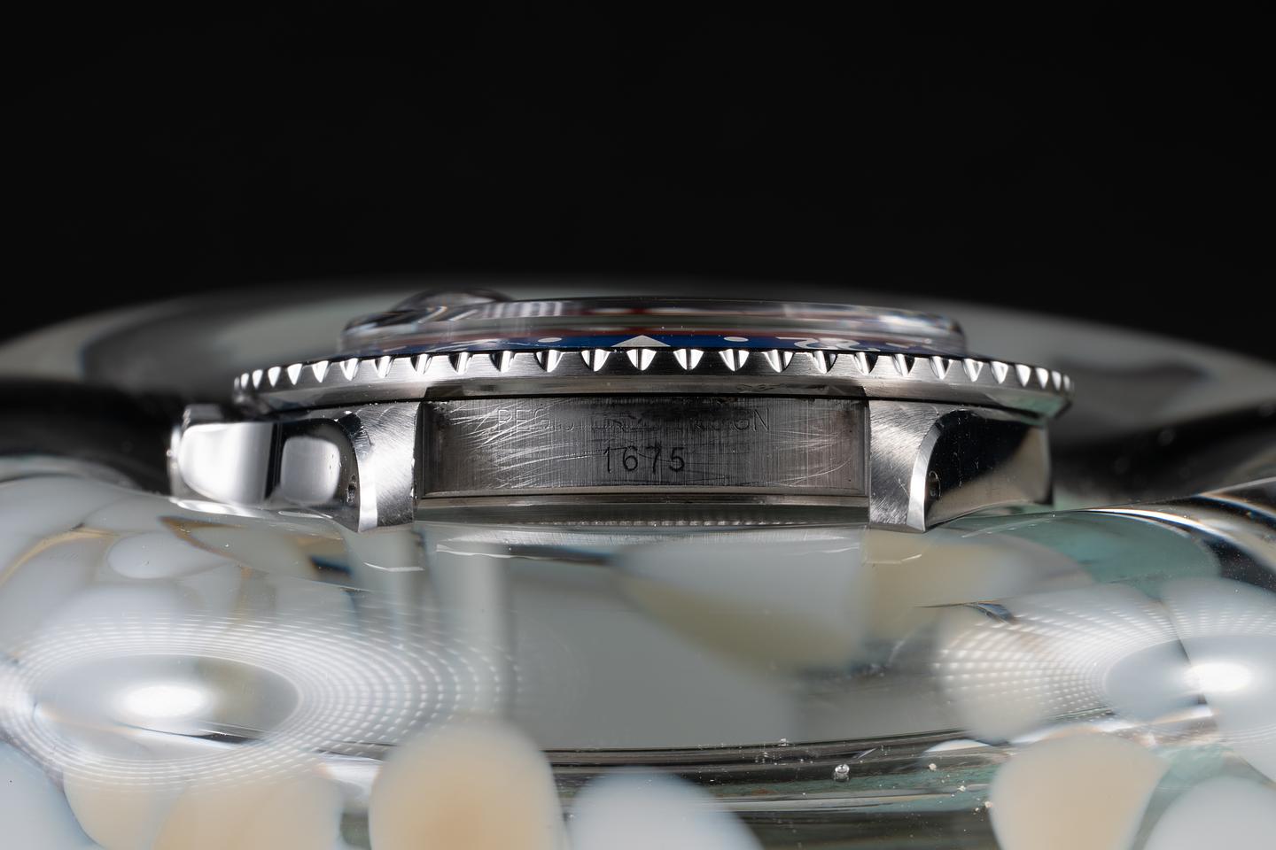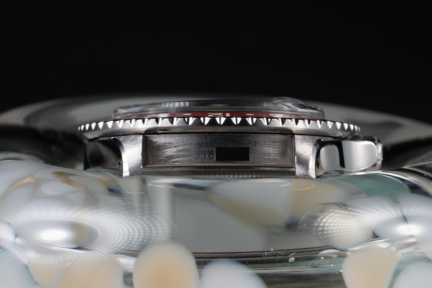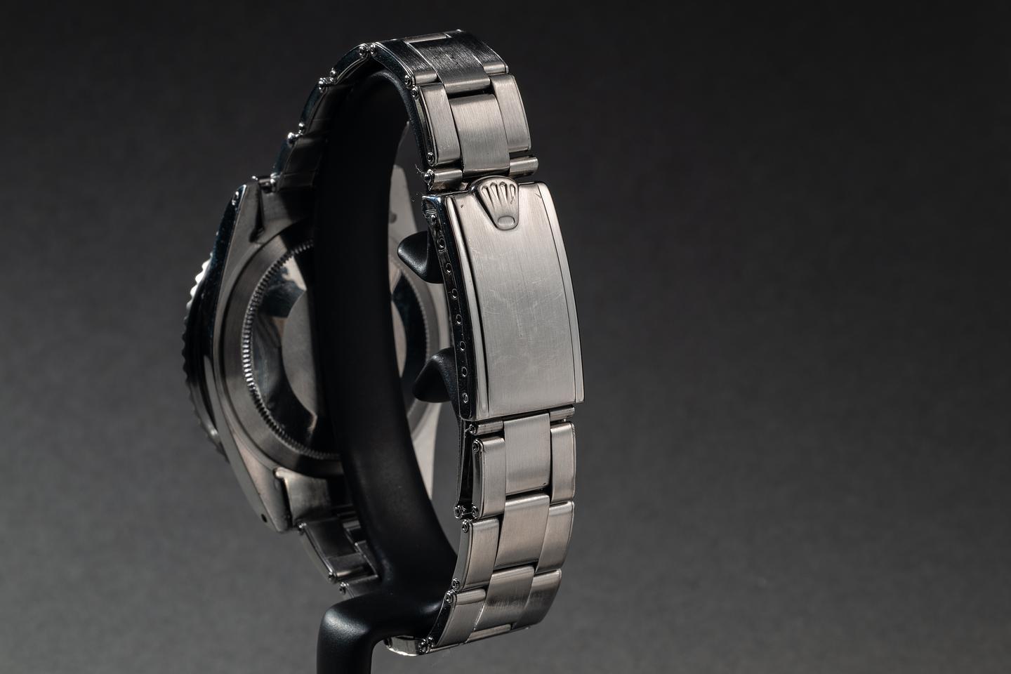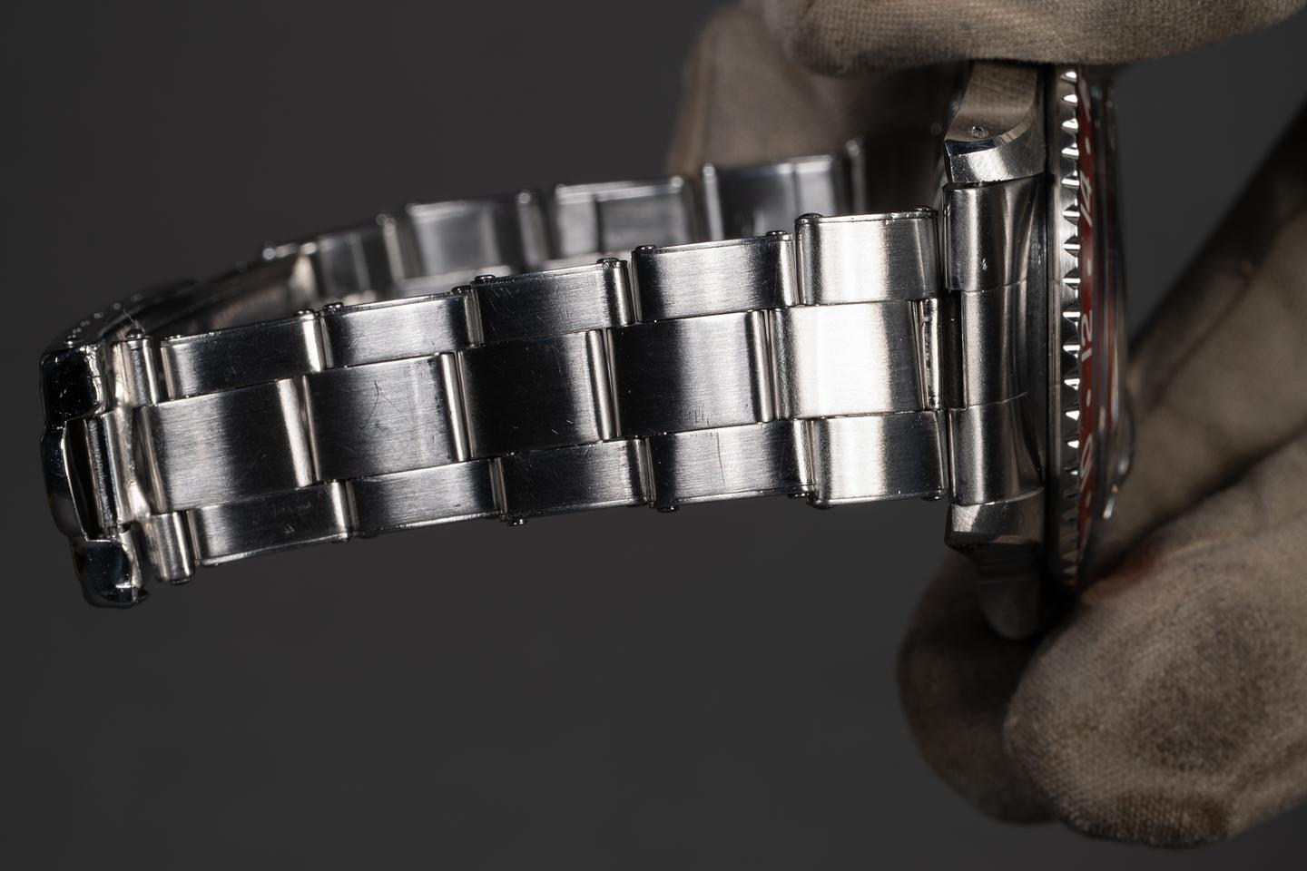 Case: The previously polished case is excellent, showing wide, sharp, prominent bevels, and only very light wear from use. The blue and red bezel insert is also in excellent condition with one slightly more prominent scratch running from the triangle to the 2 indexes. The blue portion of the bezel has faded to a graduated satin blue and the red portion has faded to a glossy light red.