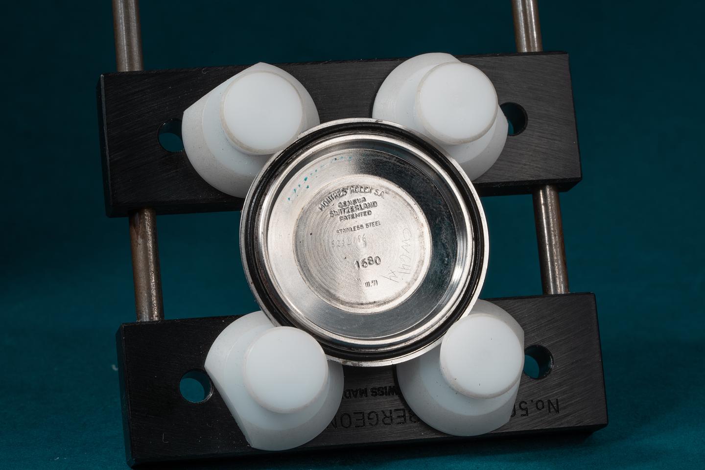Case: The thick and even case is excellent showing prominent bevels and some wear from use. The bezel insert is also in excellent condition and has faded to a blue-grey hue showing only light wear from use.