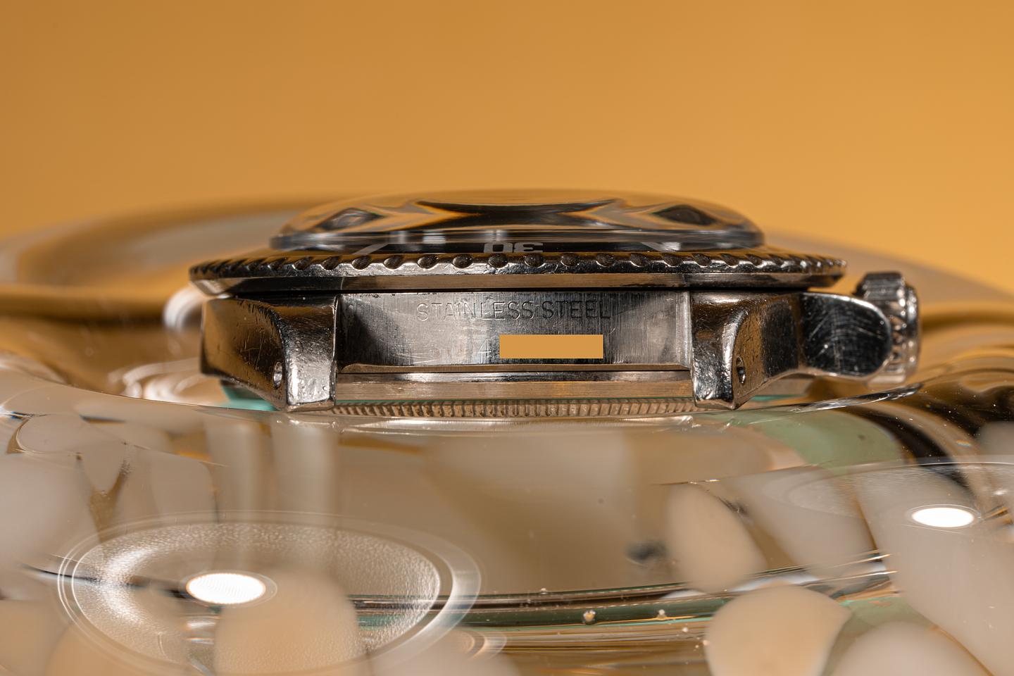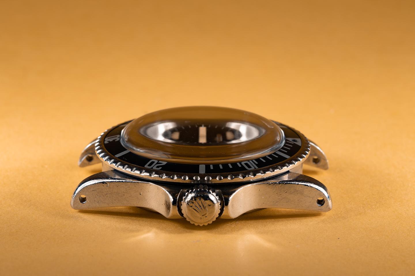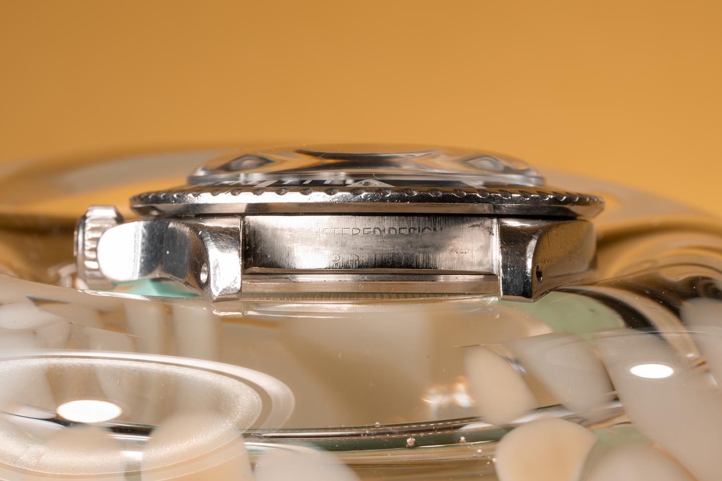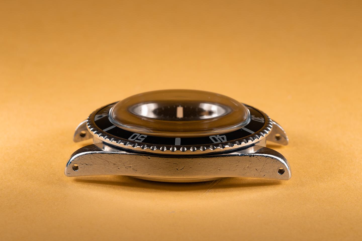 Case: The case has previously been polished and is in excellent condition for its age showing only light wear. The ultra thick kissing 40 bezel has faded to a dark blue/grey hue and is in excellent condition showing only light wear.